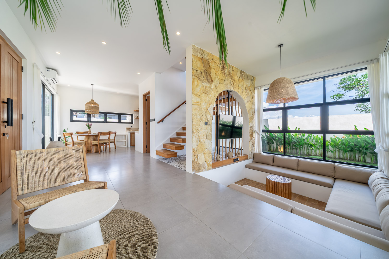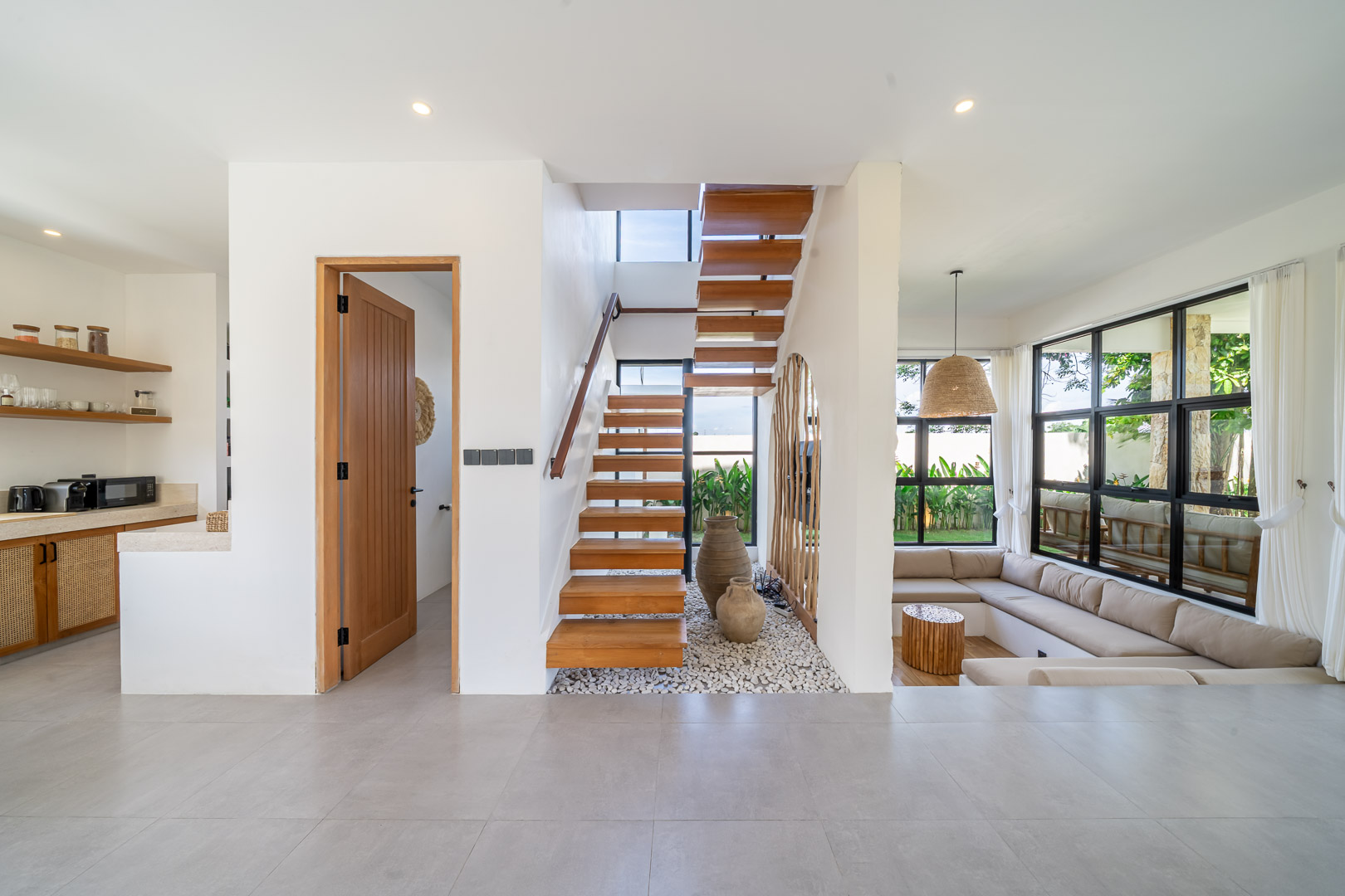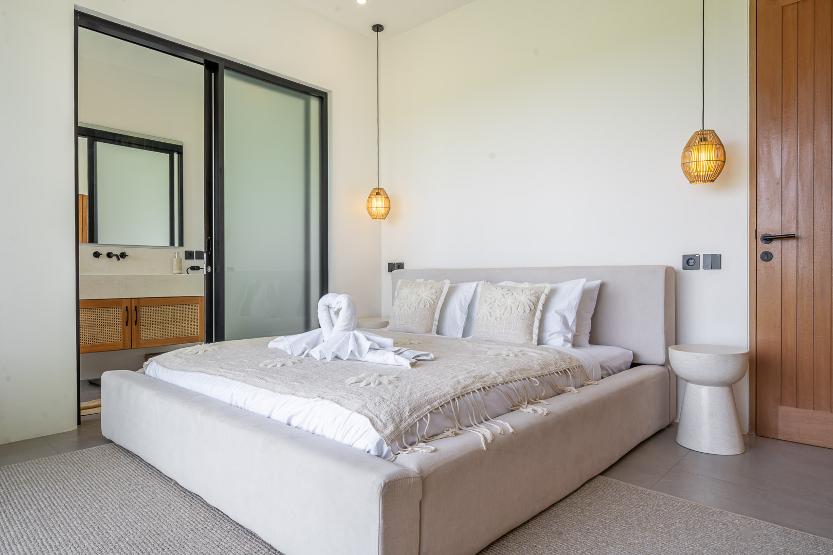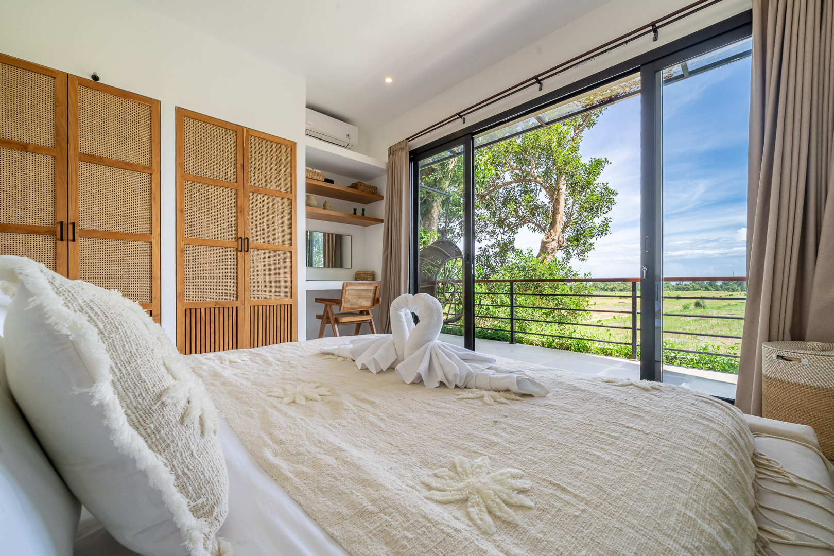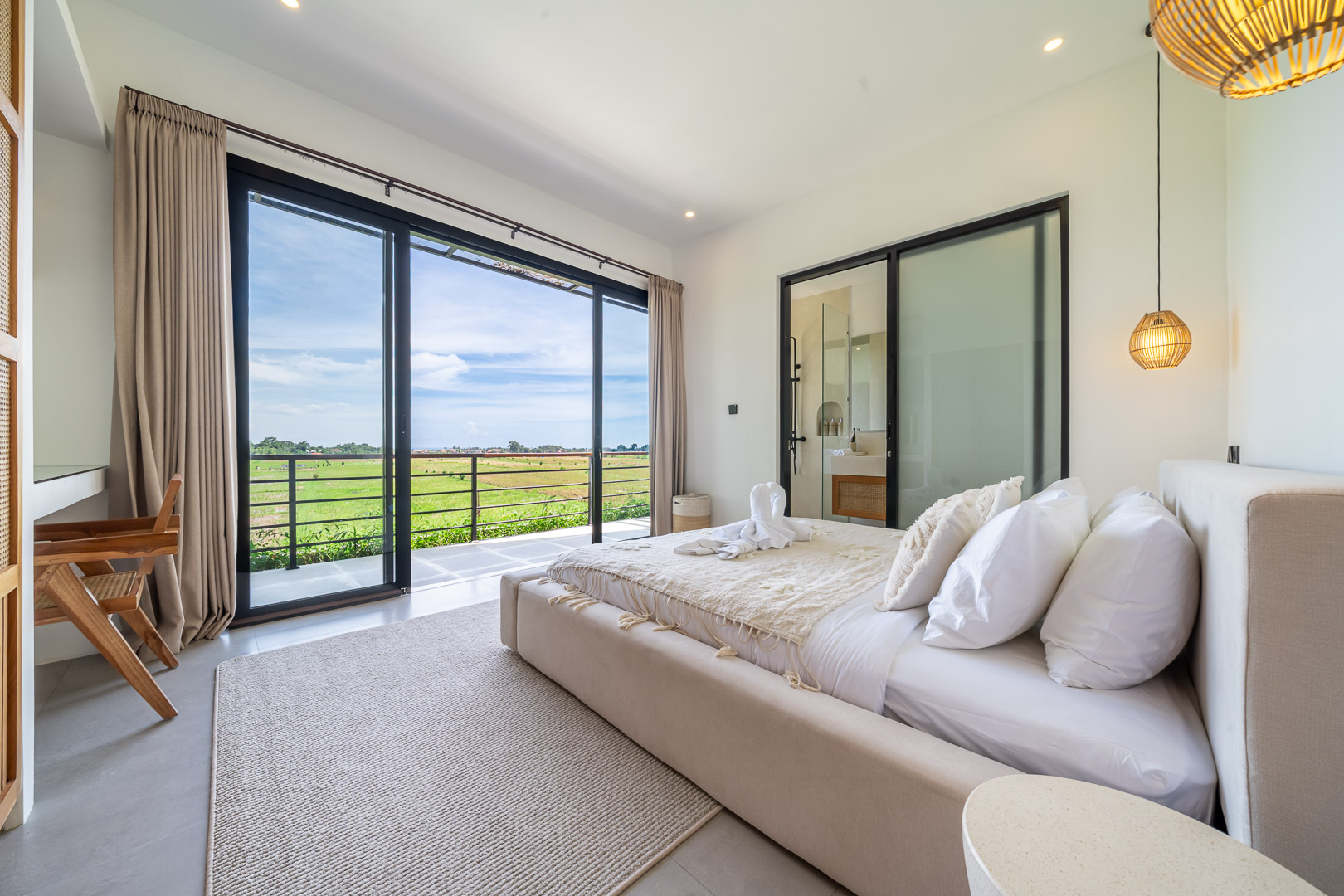 Cette villa propose un concept de vie tropical moderne avec un agencement lumineux et ouvert, utilisant des matériaux naturels tels que le bois et la pierre pour créer une atmosphère chaleureuse et confortable. De grandes fenêtres et des portes coulissantes laissent entrer une abondante lumière naturelle et relient l’espace de vie à la verdure et aux vues sur les rizières. L’espace salon en contrebas offre un coin cosy pour se détendre et profiter du cadre. La villa dispose de 3 chambres et 3 salles de bains, et la chambre principale possède un balcon privé avec vue sur les rizières.