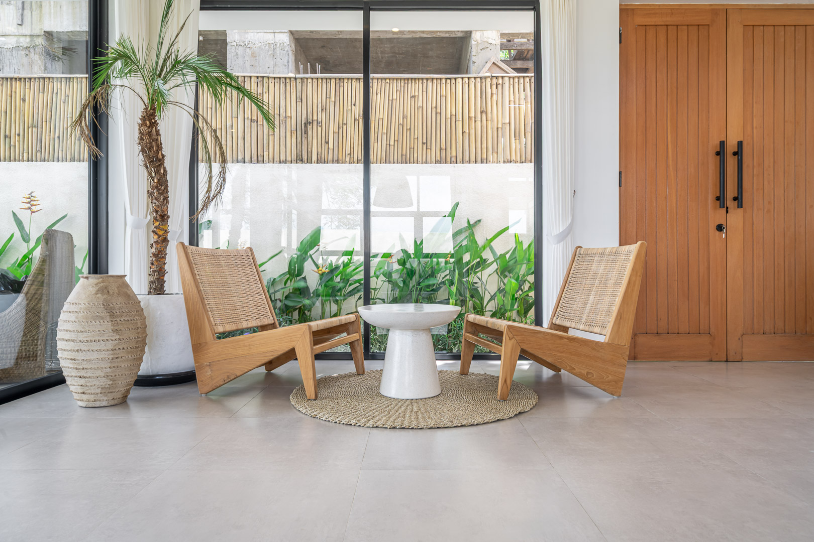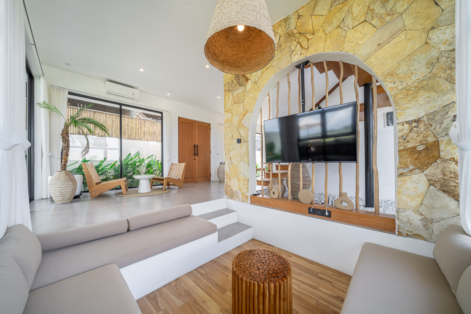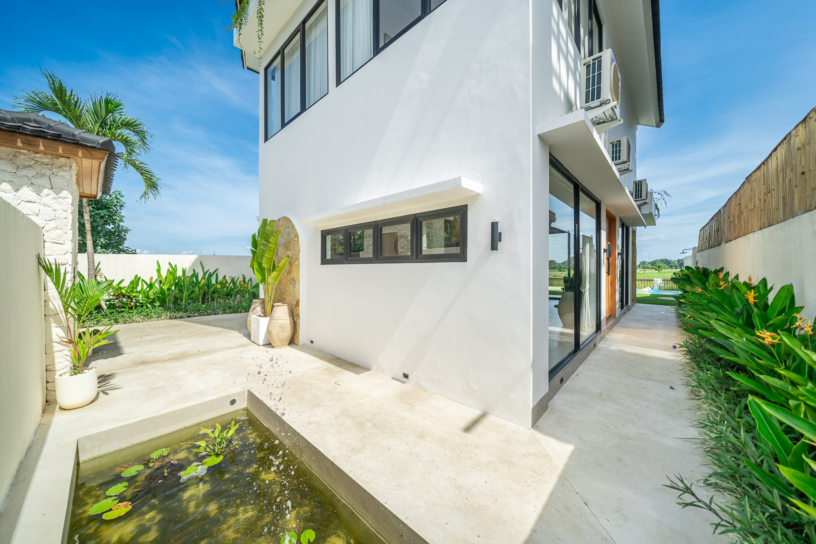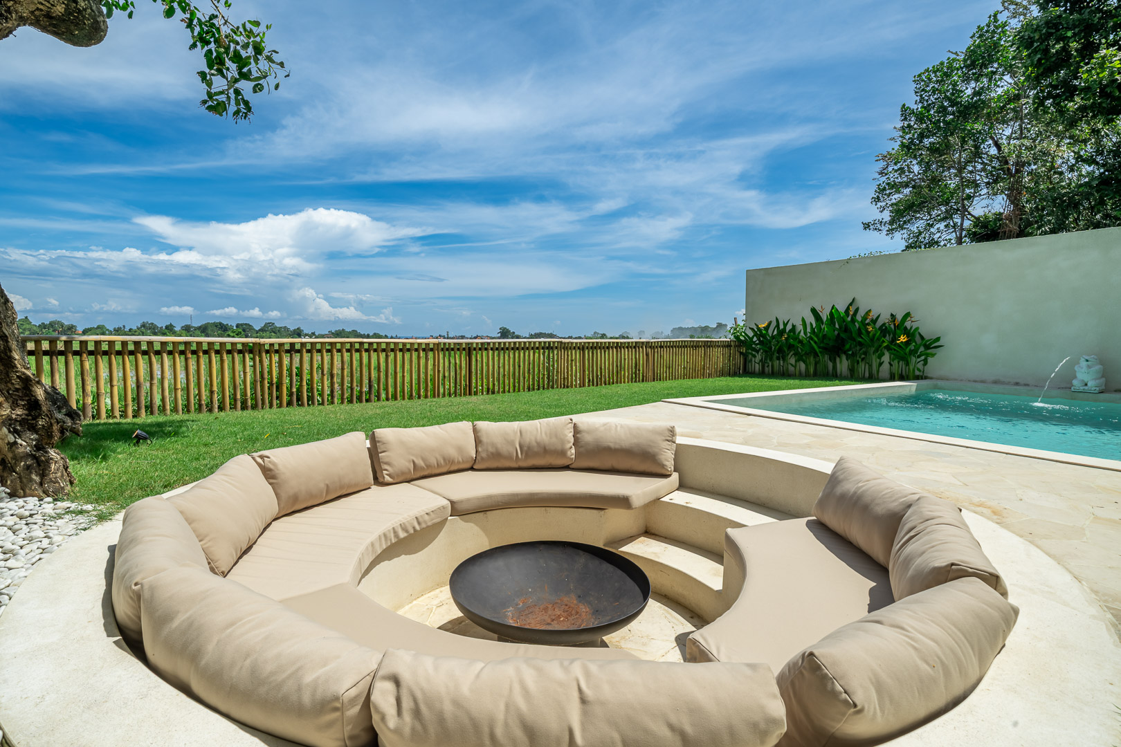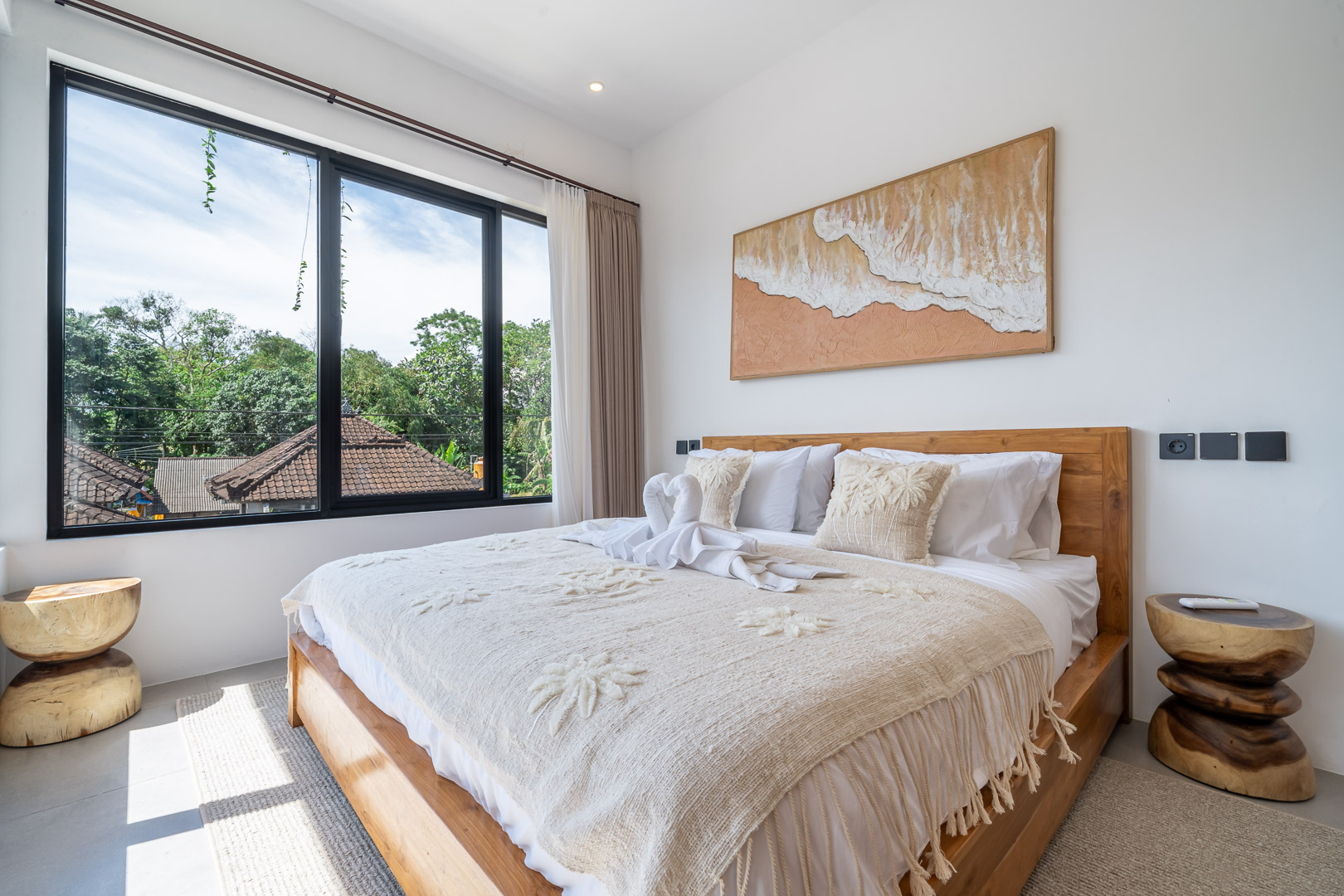 Cette villa propose un concept de vie tropical moderne avec un agencement lumineux et ouvert, utilisant des matériaux naturels tels que le bois et la pierre pour créer une atmosphère chaleureuse et confortable. De grandes fenêtres et des portes coulissantes laissent entrer une abondante lumière naturelle et relient l’espace de vie à la verdure et aux vues sur les rizières. L’espace salon en contrebas offre un coin cosy pour se détendre et profiter du cadre. La villa dispose de 3 chambres et 3 salles de bains, et la chambre principale possède un balcon privé avec vue sur les rizières.