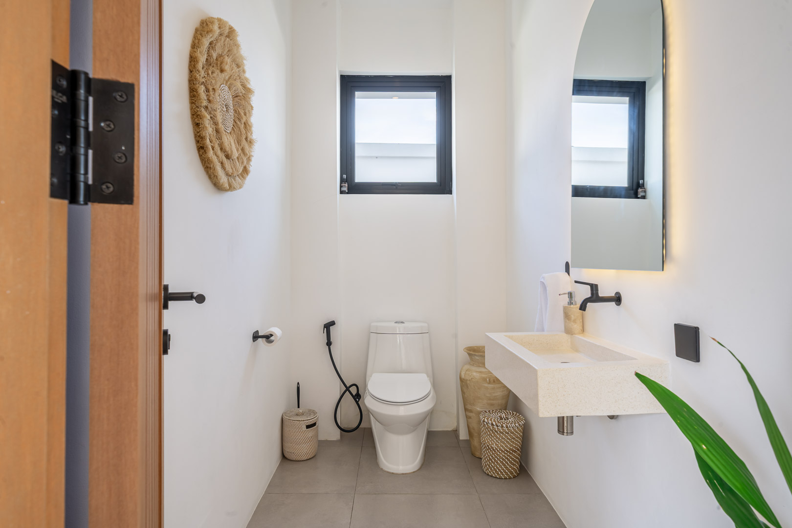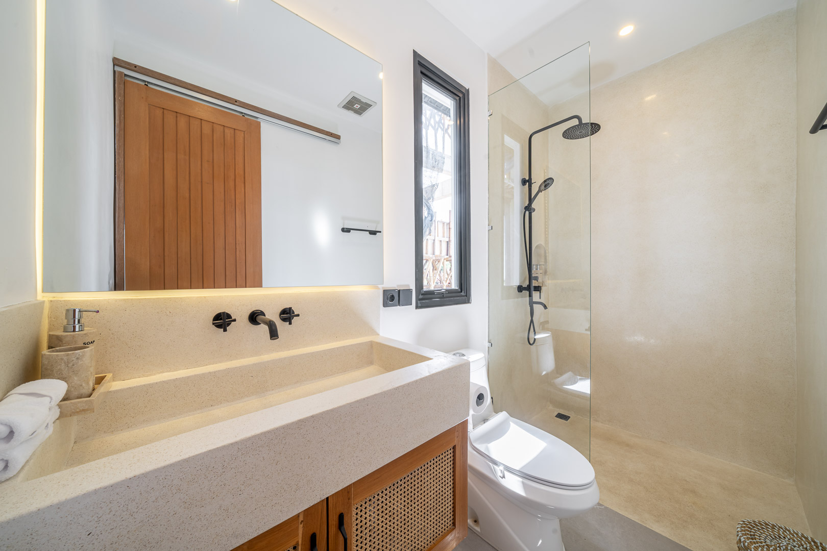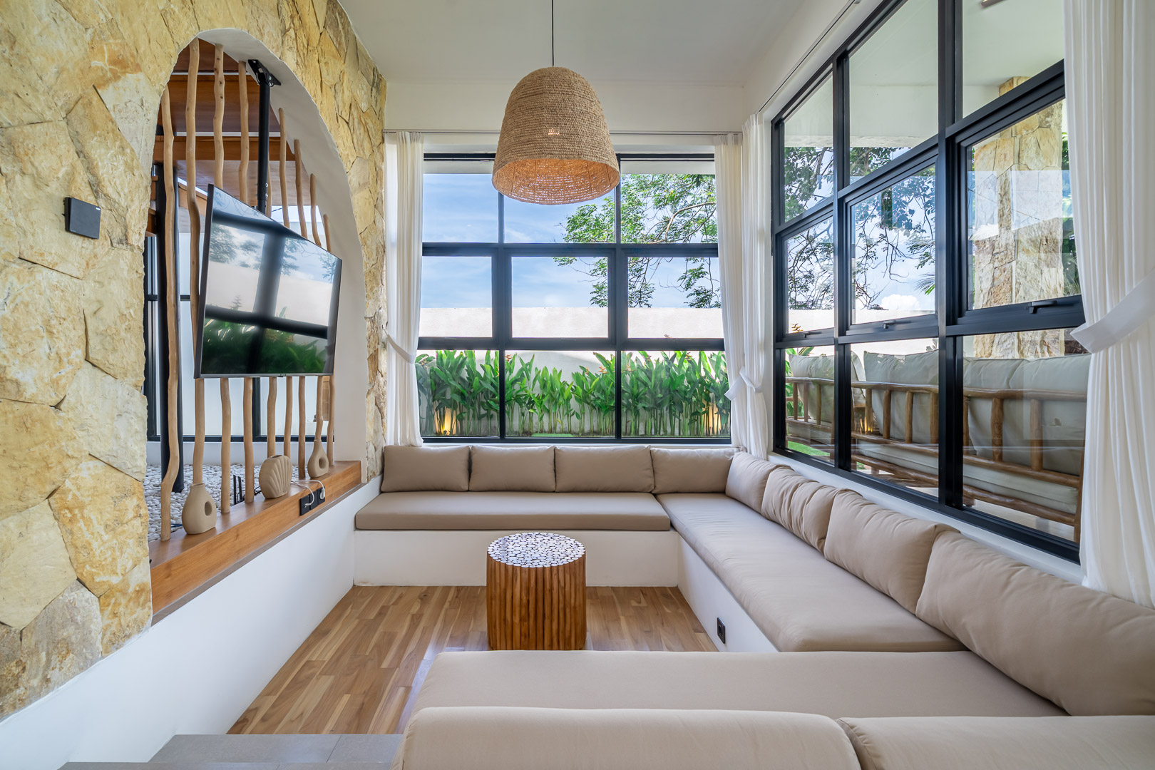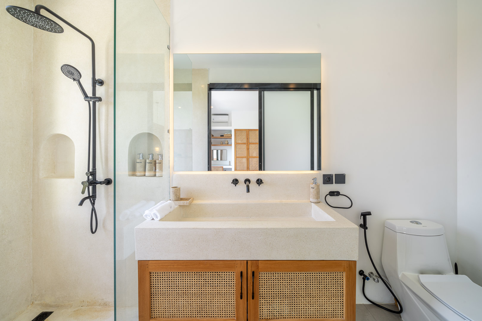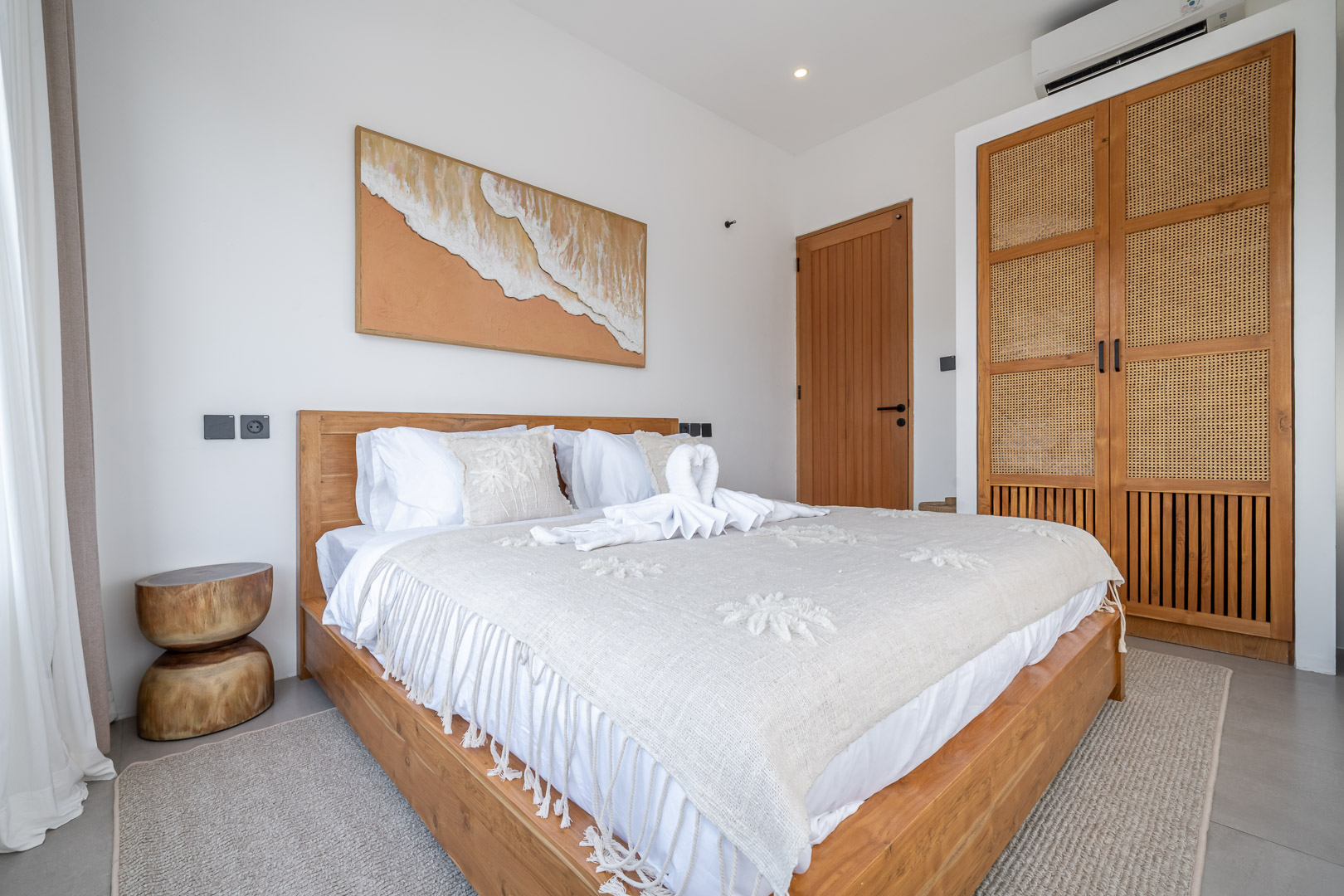 Cette villa propose un concept de vie tropical moderne avec un agencement lumineux et ouvert, utilisant des matériaux naturels tels que le bois et la pierre pour créer une atmosphère chaleureuse et confortable. De grandes fenêtres et des portes coulissantes laissent entrer une abondante lumière naturelle et relient l’espace de vie à la verdure et aux vues sur les rizières. L’espace salon en contrebas offre un coin cosy pour se détendre et profiter du cadre. La villa dispose de 3 chambres et 3 salles de bains, et la chambre principale possède un balcon privé avec vue sur les rizières.