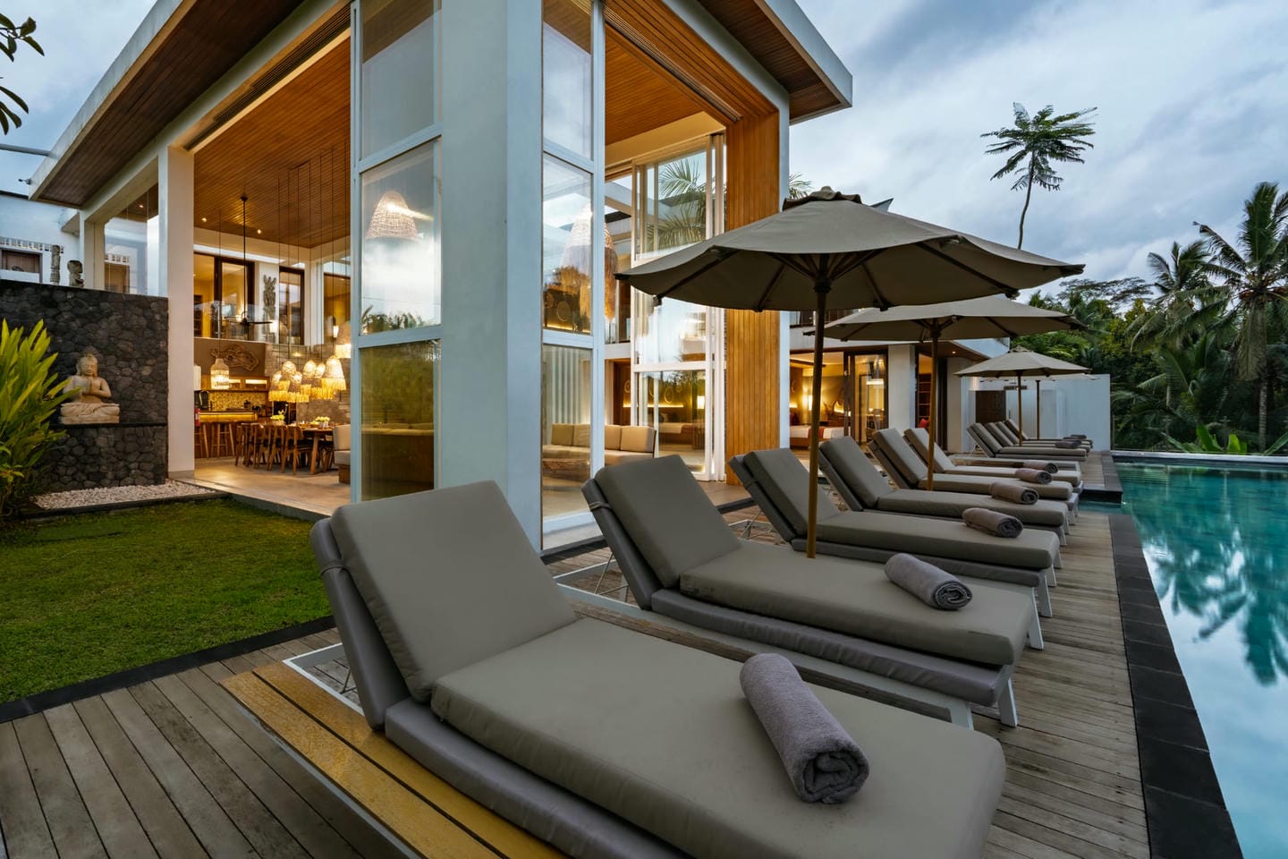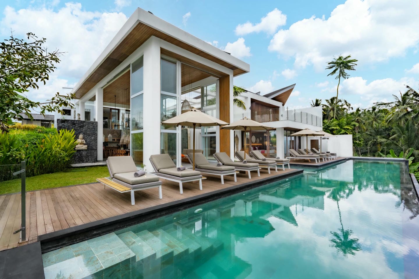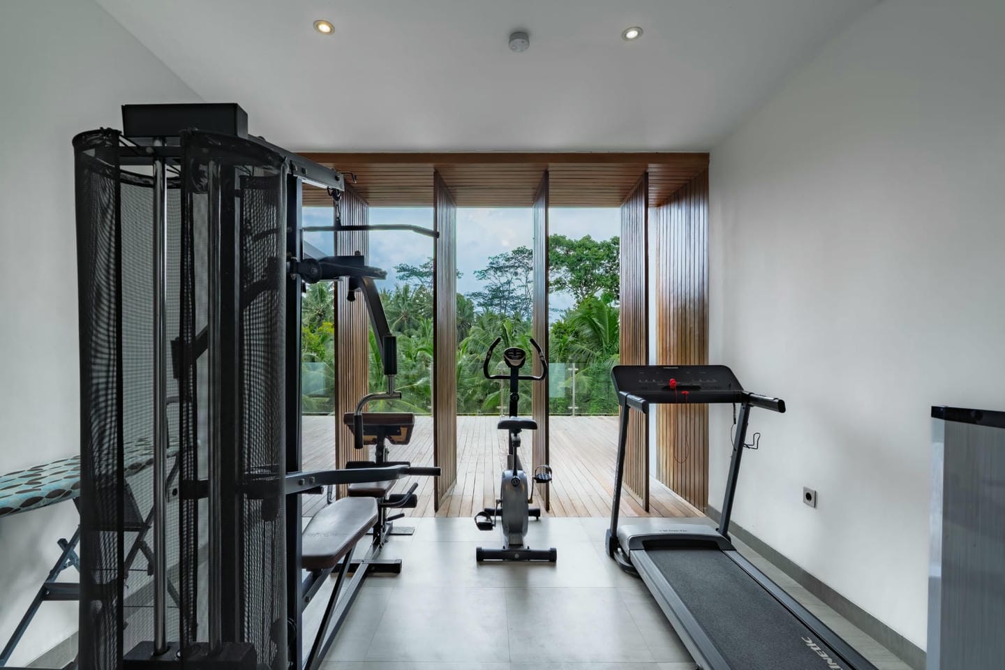 L’espace extérieur dispose d’une piscine de 80 m² avec vue sur la jungle. La propriété comprend également environ 100 m² de parking, une salle de sport entièrement équipée, ainsi qu’une plateforme de yoga à l’étage offrant une vue sur la jungle à l’avant et sur les rizières sur le côté.