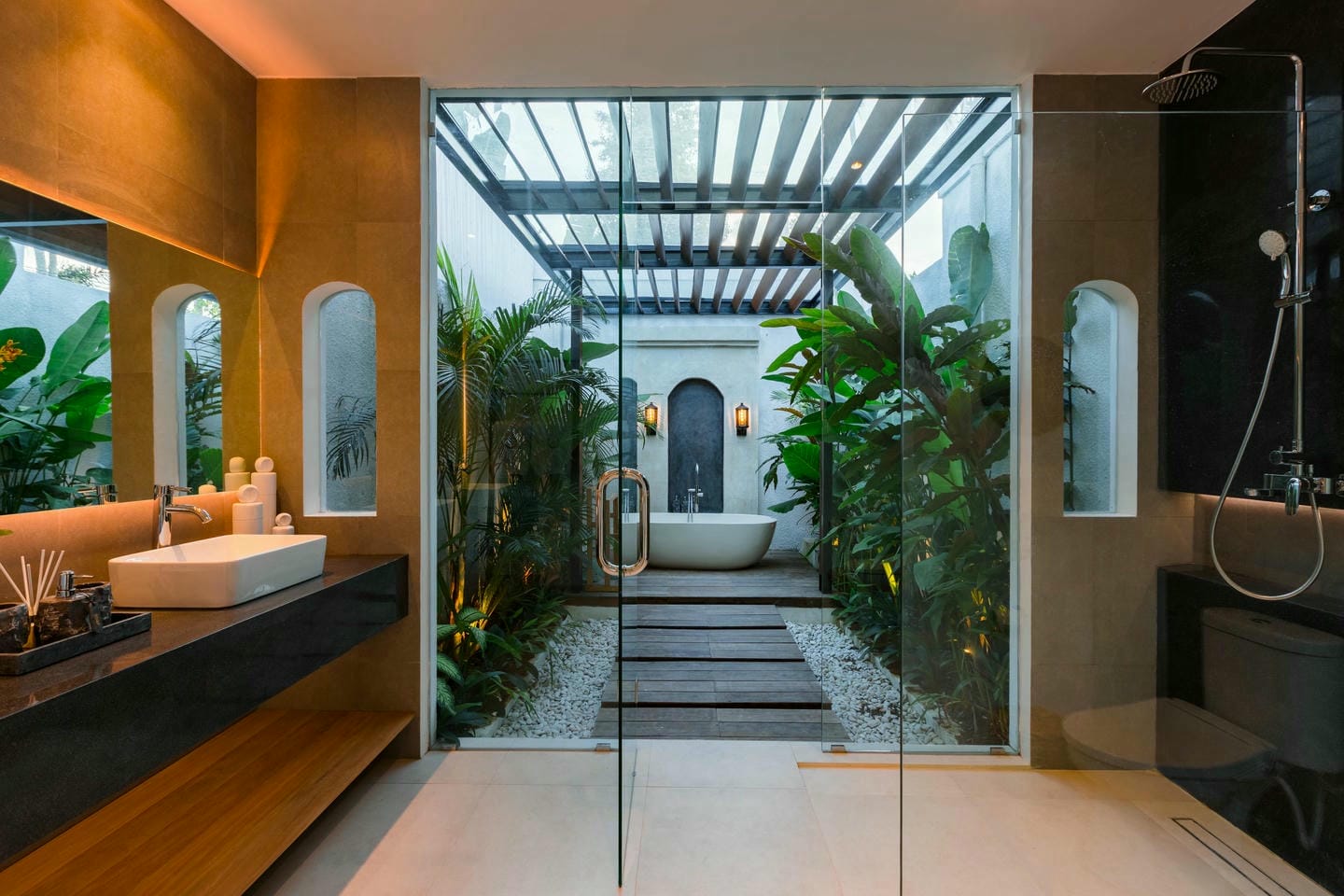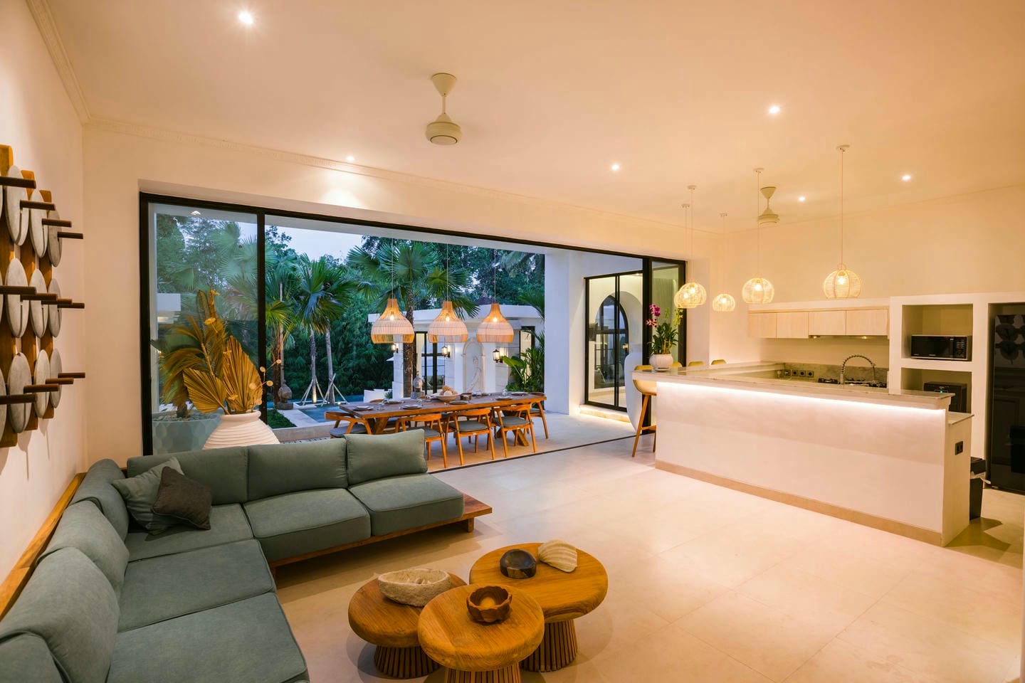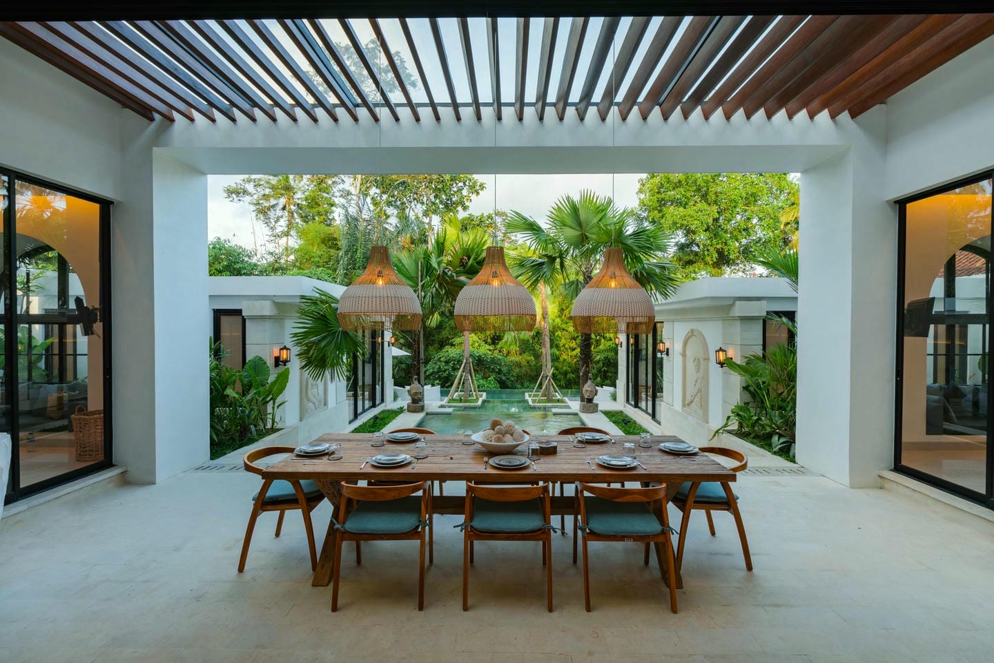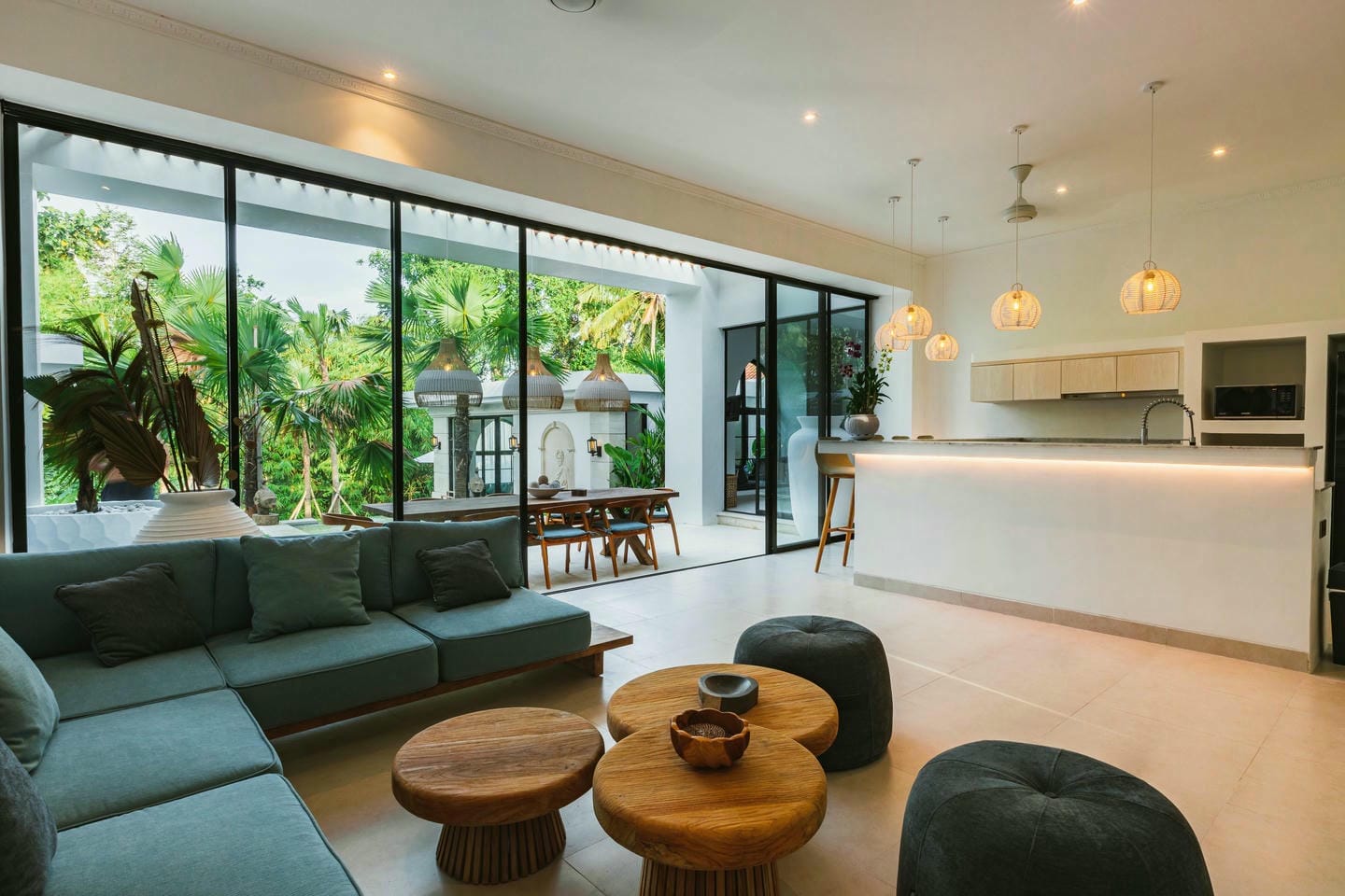 L’espace extérieur est conçu pour la détente et les moments de convivialité, avec une piscine privée, un salon en contrebas et un jardin luxuriant offrant une magnifique vue sur la jungle, créant une ambiance sereine digne d’un resort.