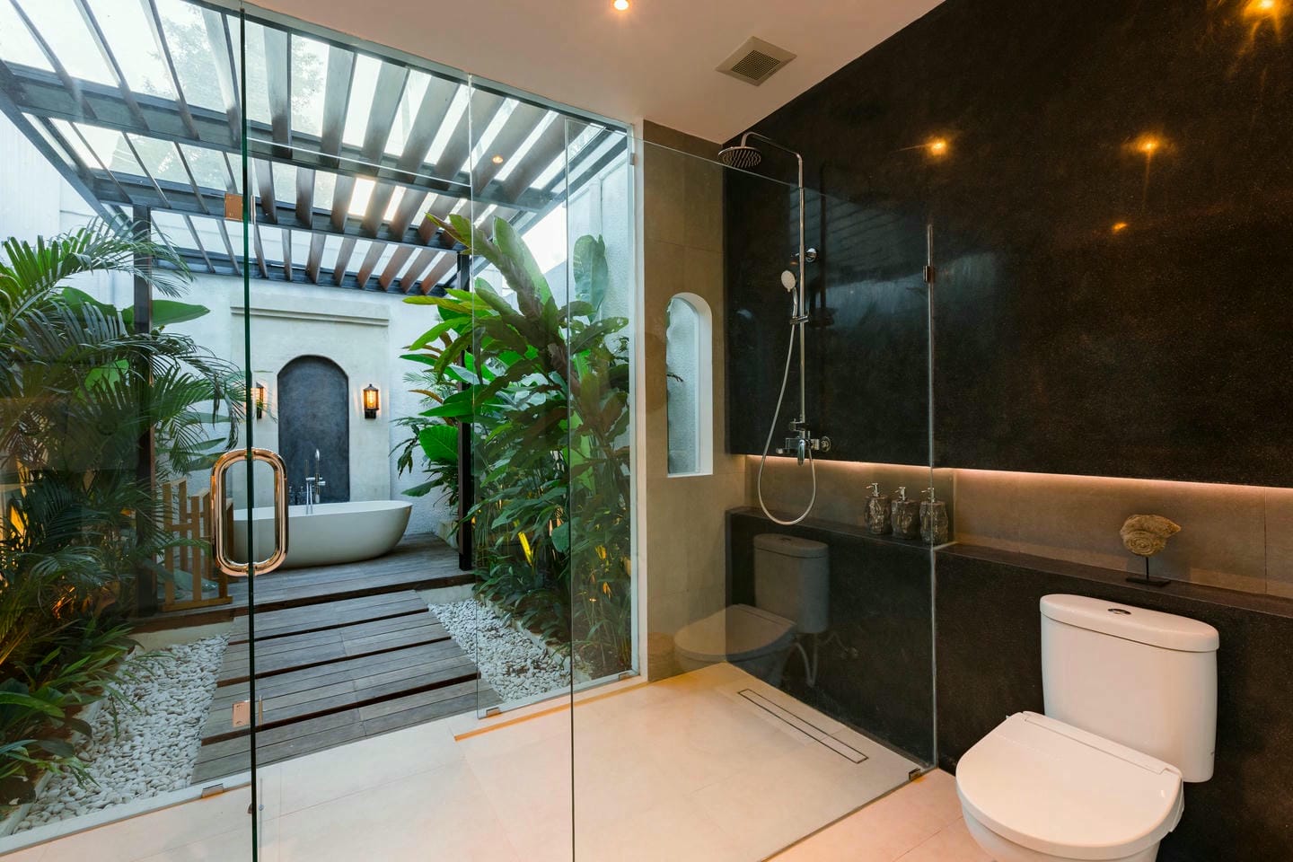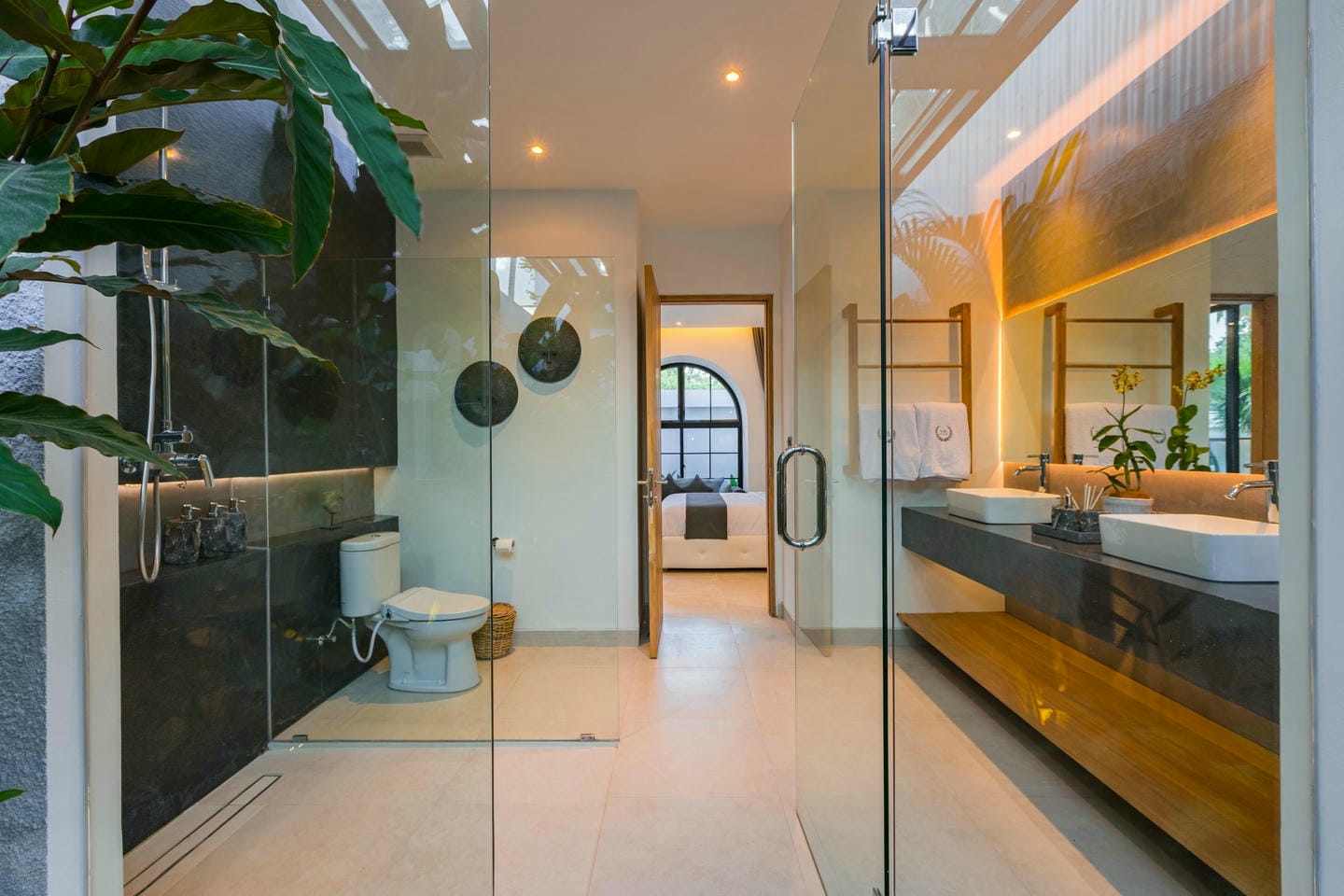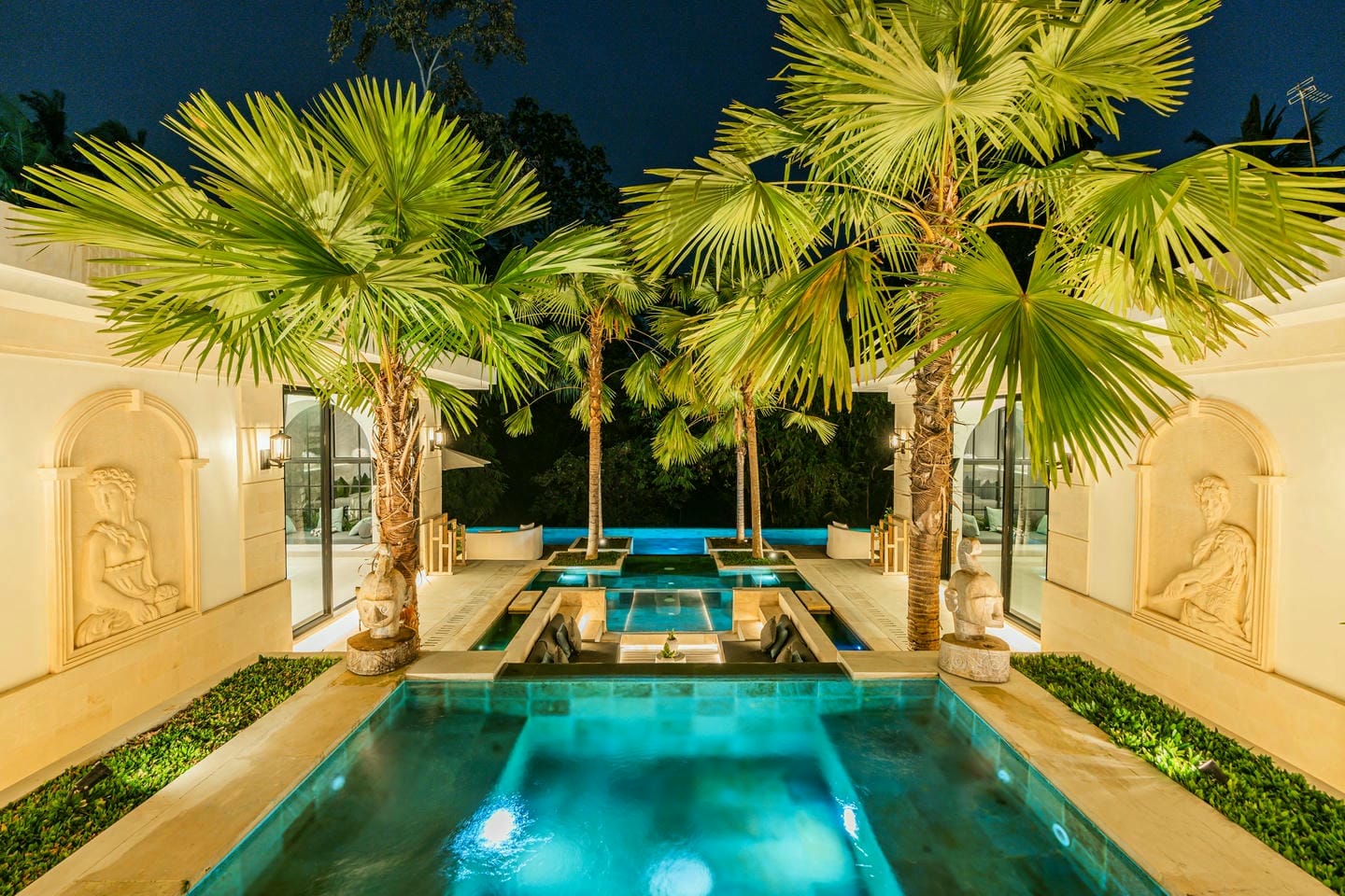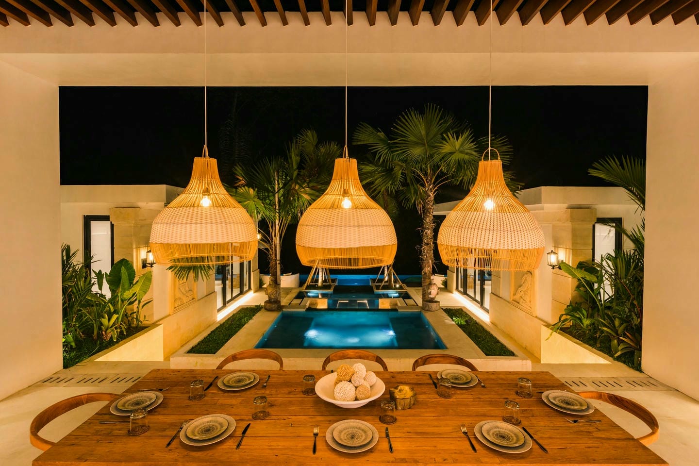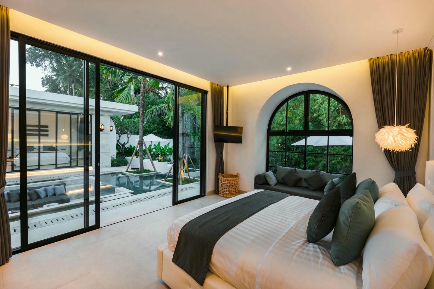 L’espace extérieur est conçu pour la détente et les moments de convivialité, avec une piscine privée, un salon en contrebas et un jardin luxuriant offrant une magnifique vue sur la jungle, créant une ambiance sereine digne d’un resort.