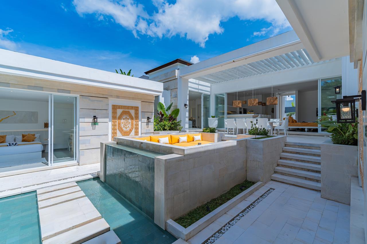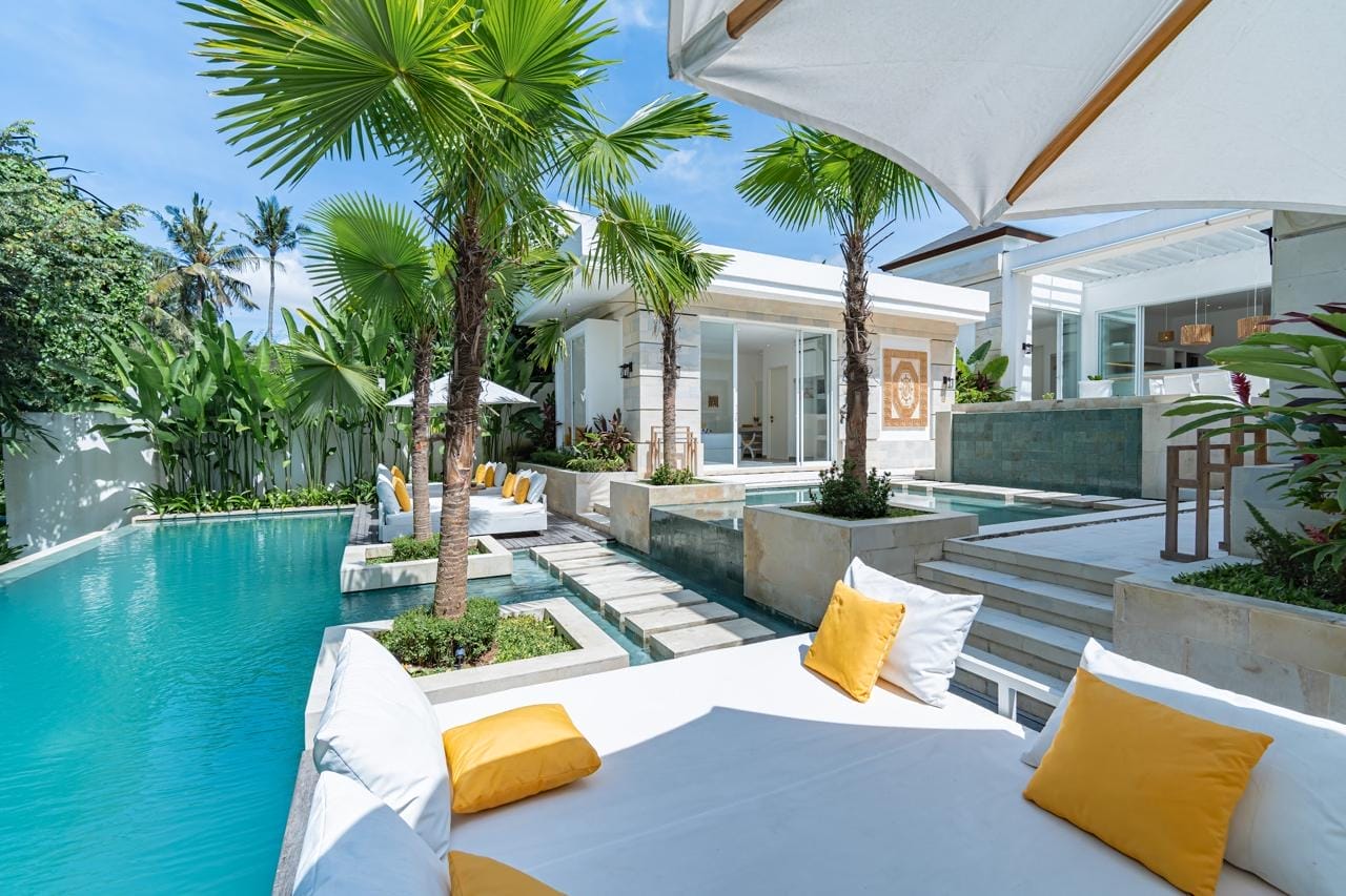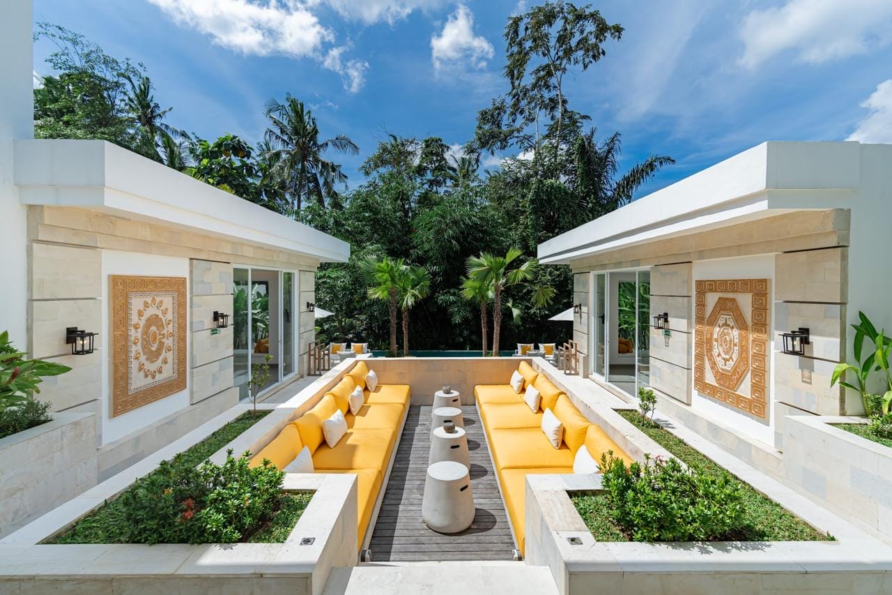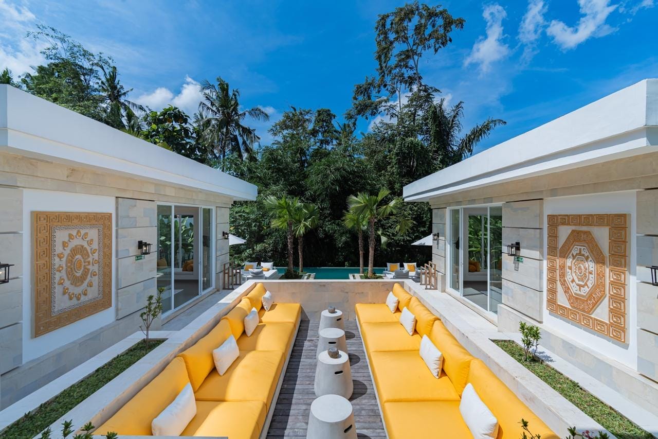 L’espace extérieur de la villa allie luxe moderne et charme tropical, avec des piscines entourées d’une végétation luxuriante et de palmiers. Un salon en contrebas aux canapés jaunes constitue le cœur social du lieu, tandis que de vastes lits de repos invitent à la détente et aux rassemblements dans l’atmosphère ensoleillée de Bali.