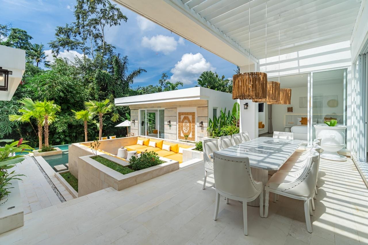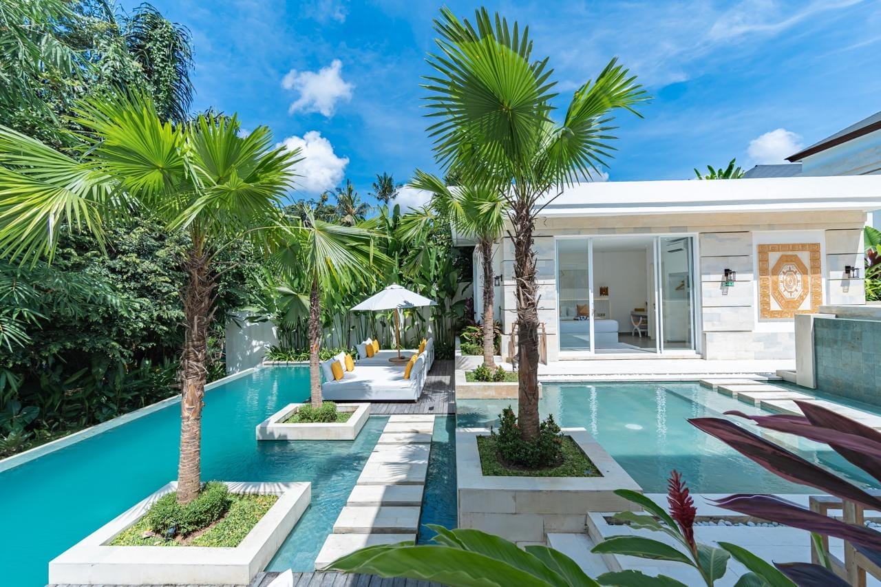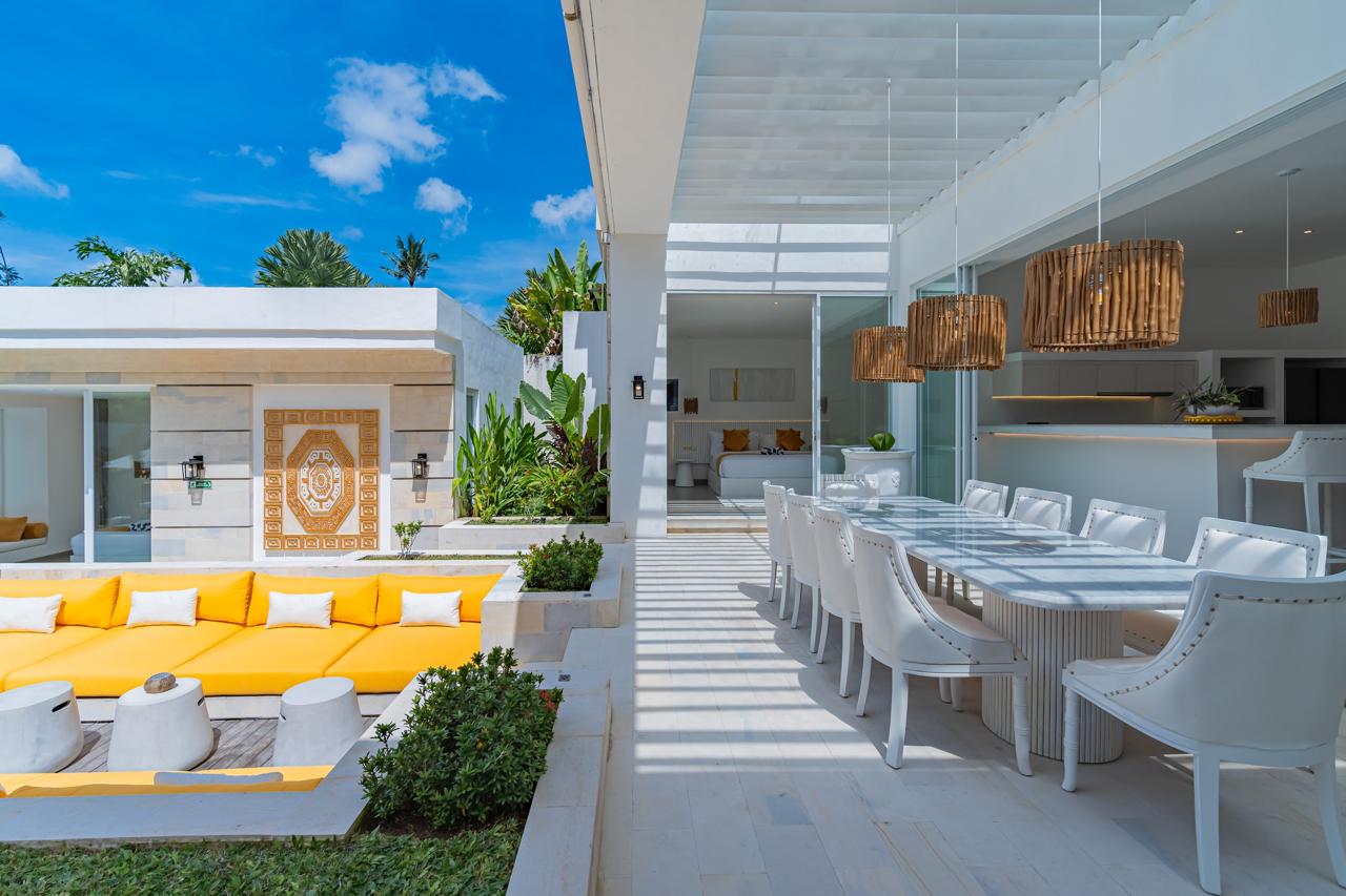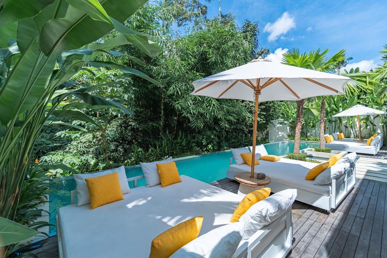 L’espace extérieur de la villa allie luxe moderne et charme tropical, avec des piscines entourées d’une végétation luxuriante et de palmiers. Un salon en contrebas aux canapés jaunes constitue le cœur social du lieu, tandis que de vastes lits de repos invitent à la détente et aux rassemblements dans l’atmosphère ensoleillée de Bali.