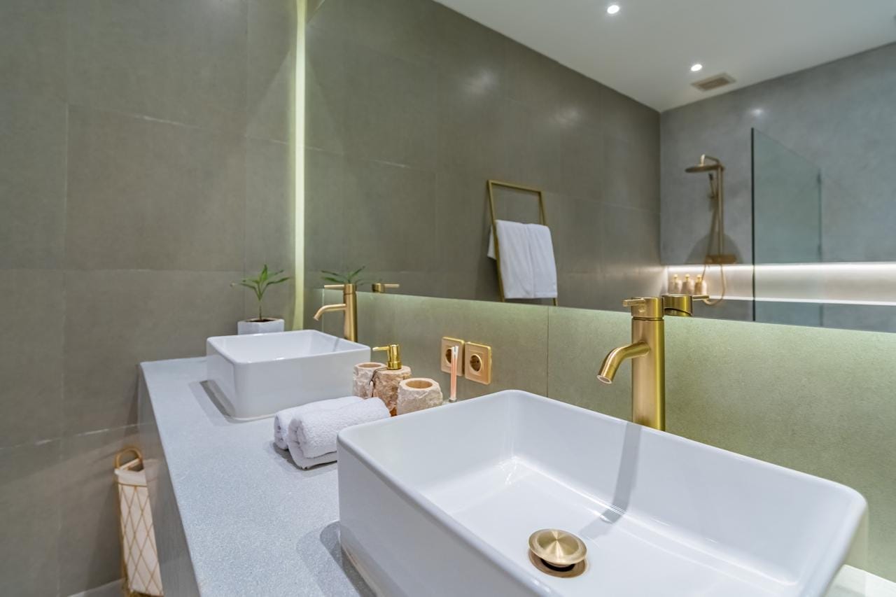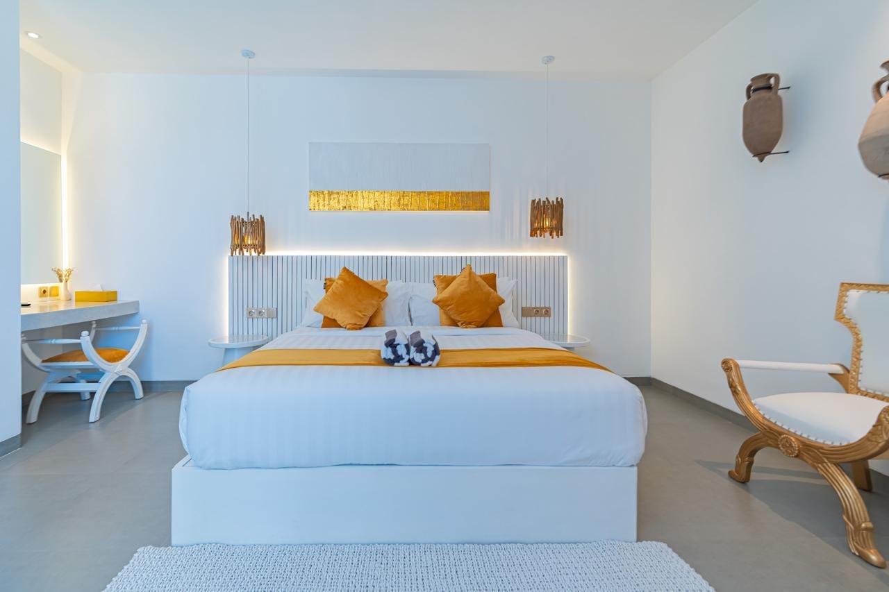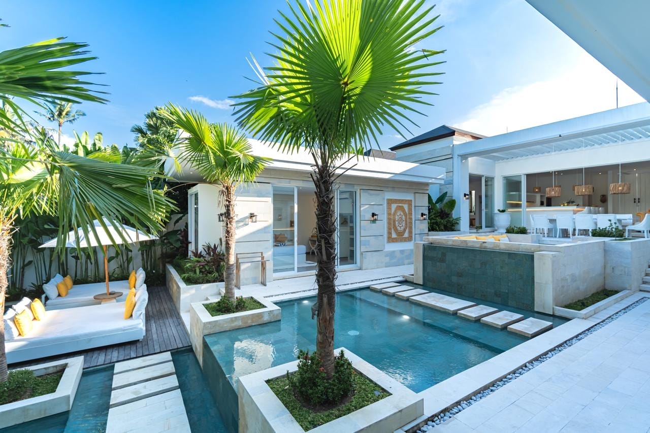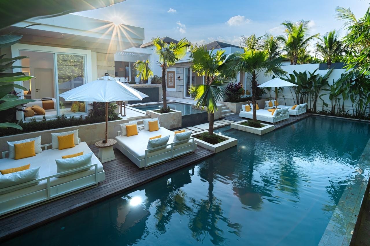 L’espace extérieur de la villa allie luxe moderne et charme tropical, avec des piscines entourées d’une végétation luxuriante et de palmiers. Un salon en contrebas aux canapés jaunes constitue le cœur social du lieu, tandis que de vastes lits de repos invitent à la détente et aux rassemblements dans l’atmosphère ensoleillée de Bali.