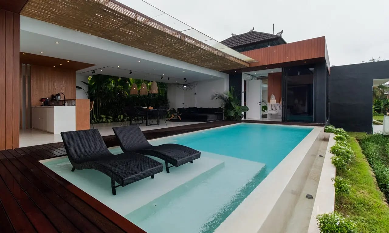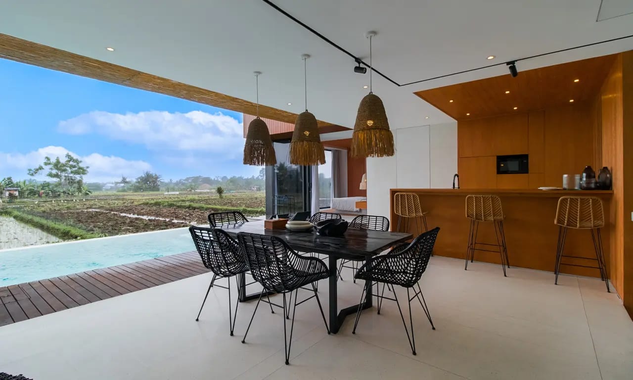 L’espace extérieur comprend une piscine privée élégante installée sur une terrasse en bois, agrémentée de chaises longues raffinées. Surplombant les rizières luxuriantes et les palmiers, il offre une ambiance tropicale paisible avec une parfaite continuité entre intérieur et extérieur, idéale pour se détendre ou recevoir.