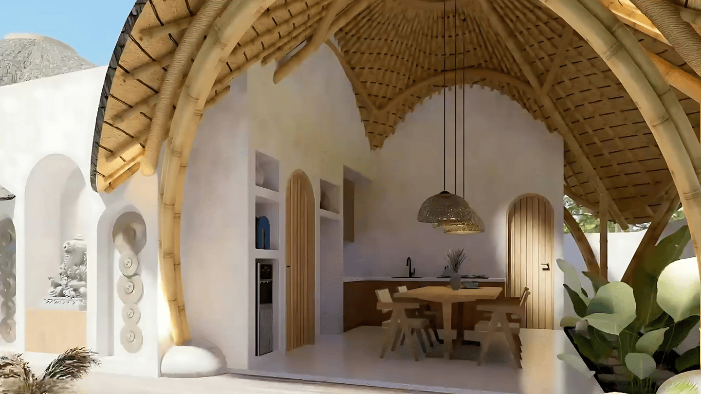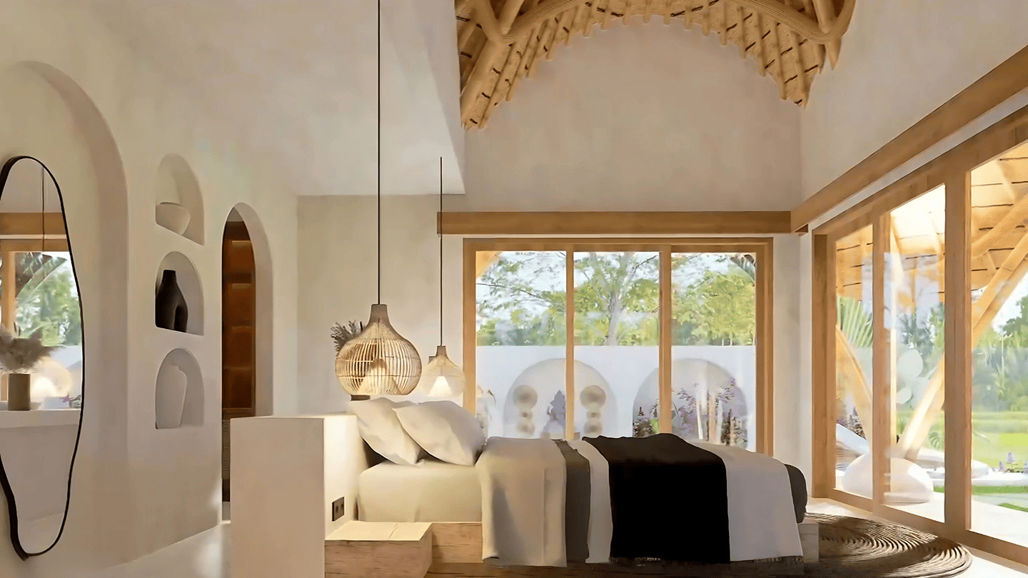 La spacieuse suite parentale s’ouvre sur une salle de bain extérieure élégamment aménagée, tandis que la cuisine et la salle à manger donnent sur un salon extérieur accueillant, baigné de lumière naturelle et d’air frais tout au long de la journée. Une pièce de service discrète ajoute une fonctionnalité quotidienne sans compromettre l’esthétique de la villa.