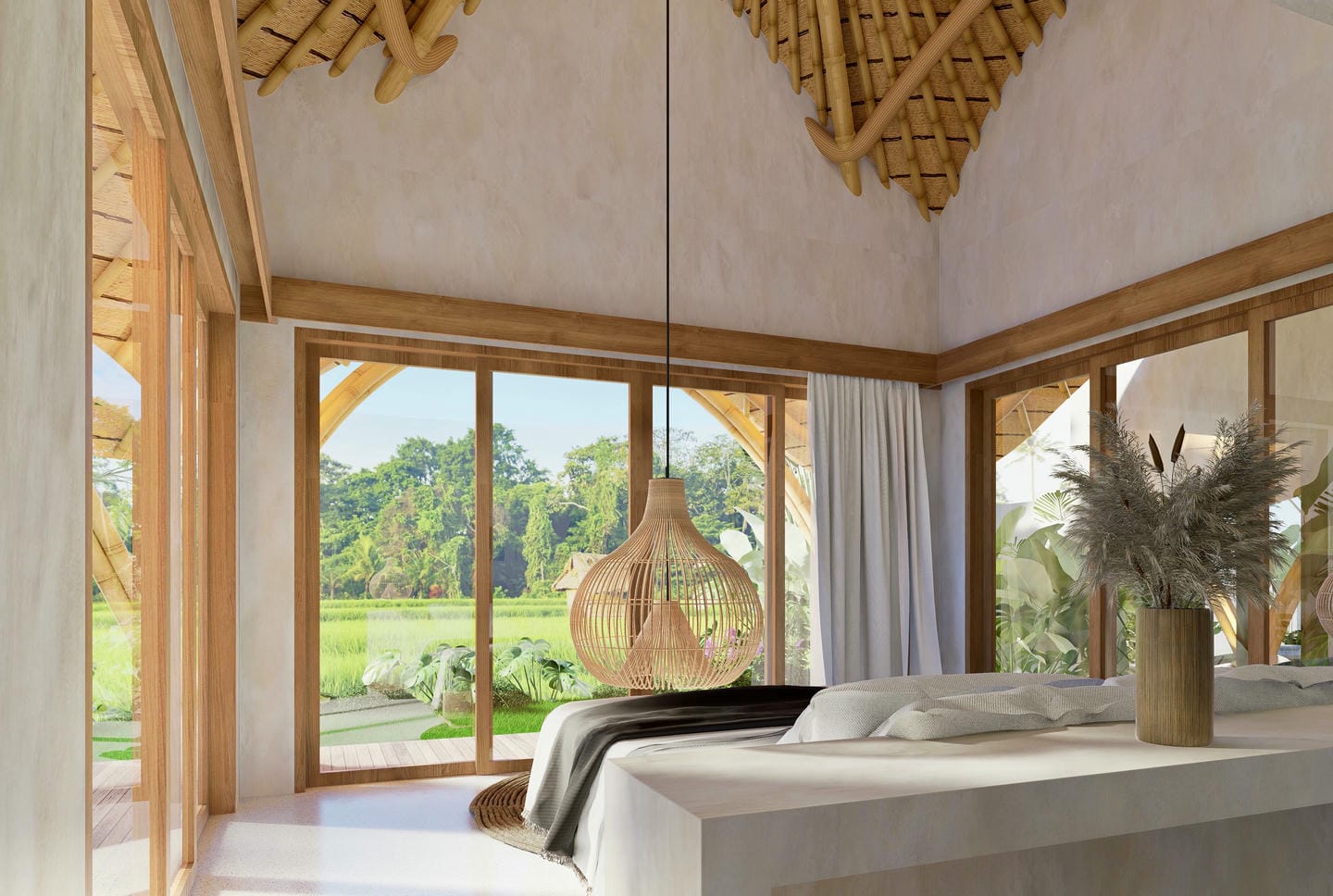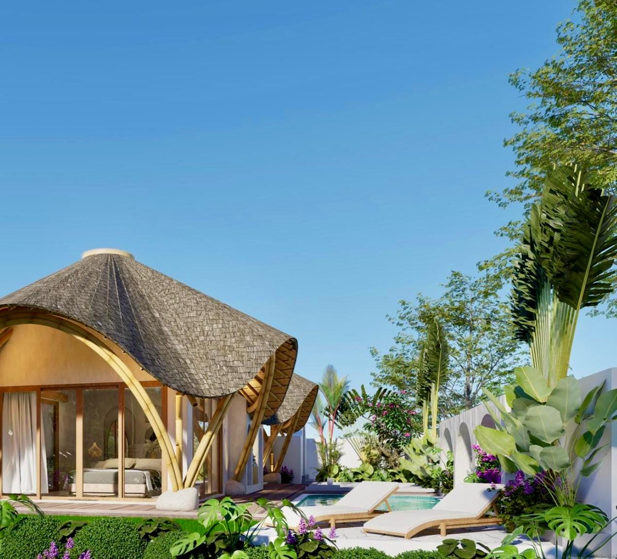 À l’extérieur, une piscine privée est entourée de jardins tropicaux et d’un espace salon en contrebas, offrant le cadre idéal pour des matinées paisibles au soleil ou des soirées douces sous les étoiles.