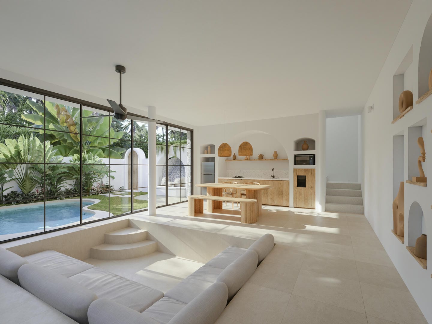 La fluidité entre intérieur et extérieur est accentuée par de grandes baies vitrées laissant entrer la lumière naturelle et s’ouvrant directement sur la piscine privée de 13 m² — votre propre havre de paix pour profiter du soleil ou de soirées paisibles.