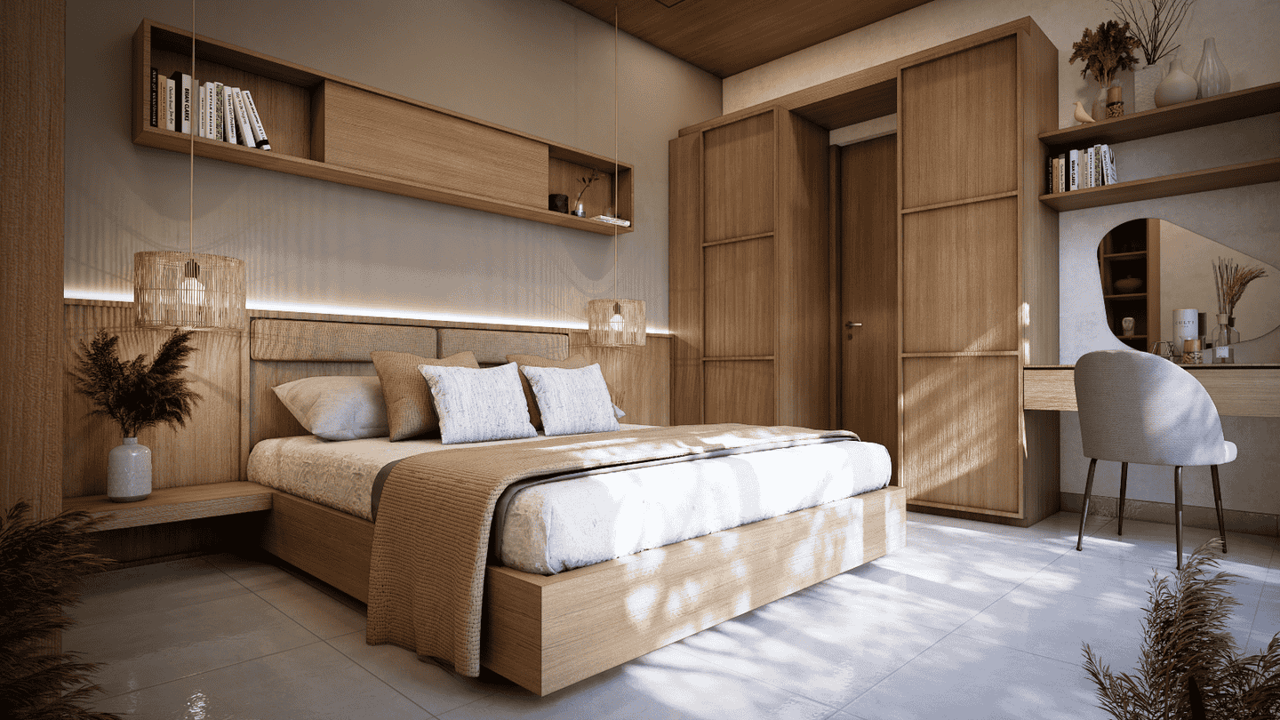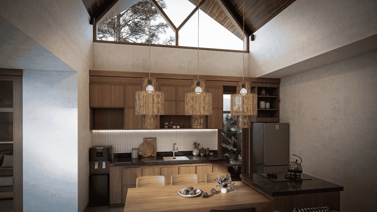 L’intérieur adopte une esthétique chaleureuse et naturelle avec des finitions en bois et des tons terreux. Les espaces ouverts et lumineux relient harmonieusement le salon, la cuisine et la salle à manger, créant une atmosphère à la fois cosy et sophistiquée, baignée de lumière naturelle.