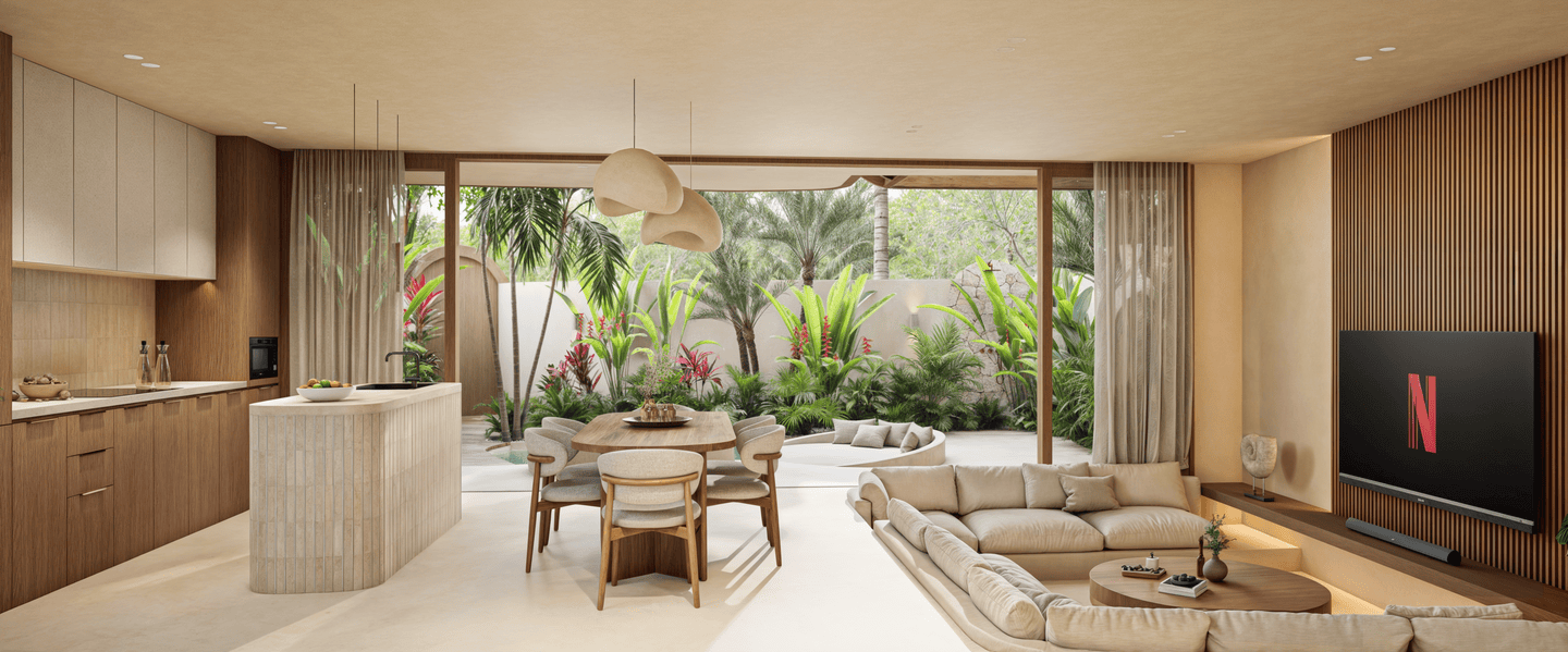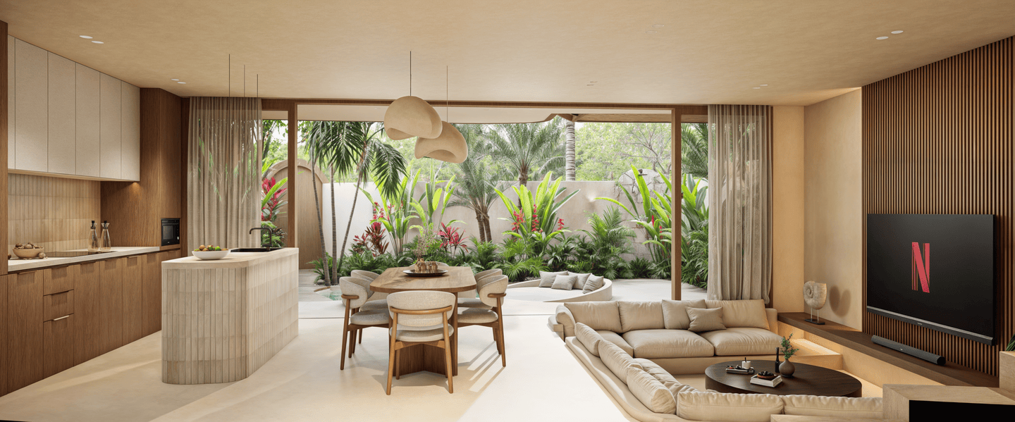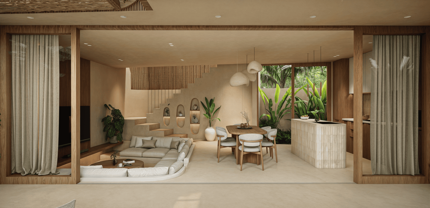 L’espace de vie ouvert est astucieusement divisé par une table à manger, séparant la cuisine du salon. L’utilisation de matériaux naturels et de finitions texturées dans toute la villa ajoute chaleur, sophistication et un charme tactile distinctif.