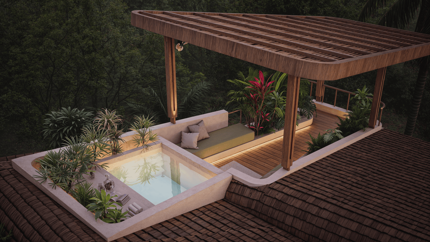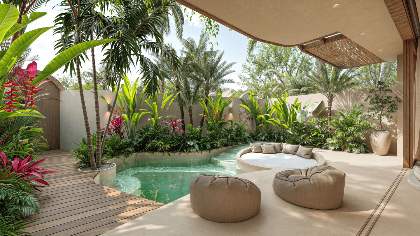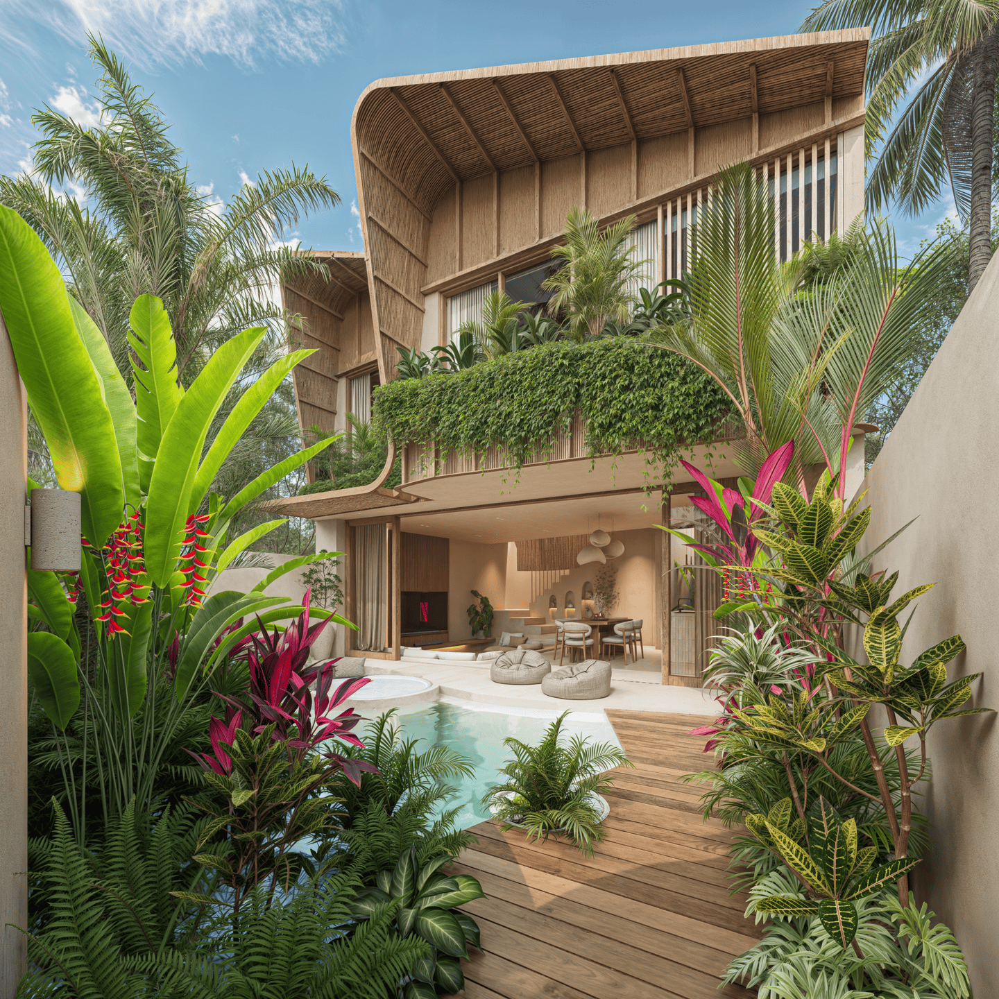 Cette villa de deux chambres offre une retraite tropicale sereine avec un design unique alliant parfaitement confort intérieur et vie en plein air. L’architecture adopte des formes douces et arrondies, évoquant une oasis tropicale, avec un salon en contrebas au centre entouré par la piscine et une pergola ombragée, créant un espace idéal pour la détente et la convivialité.