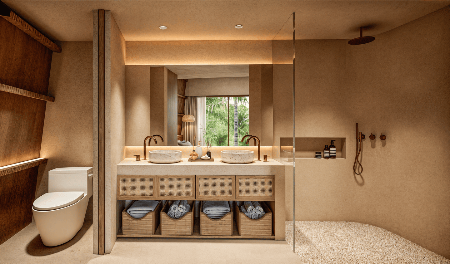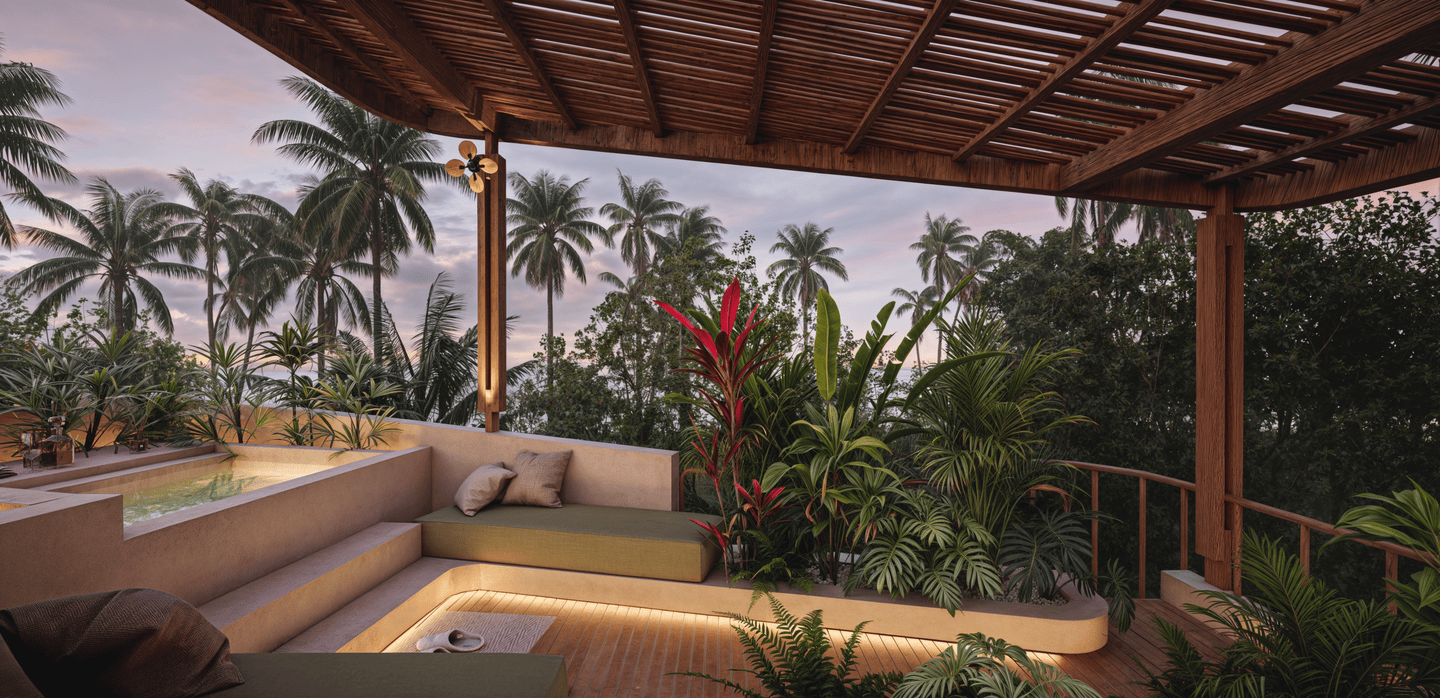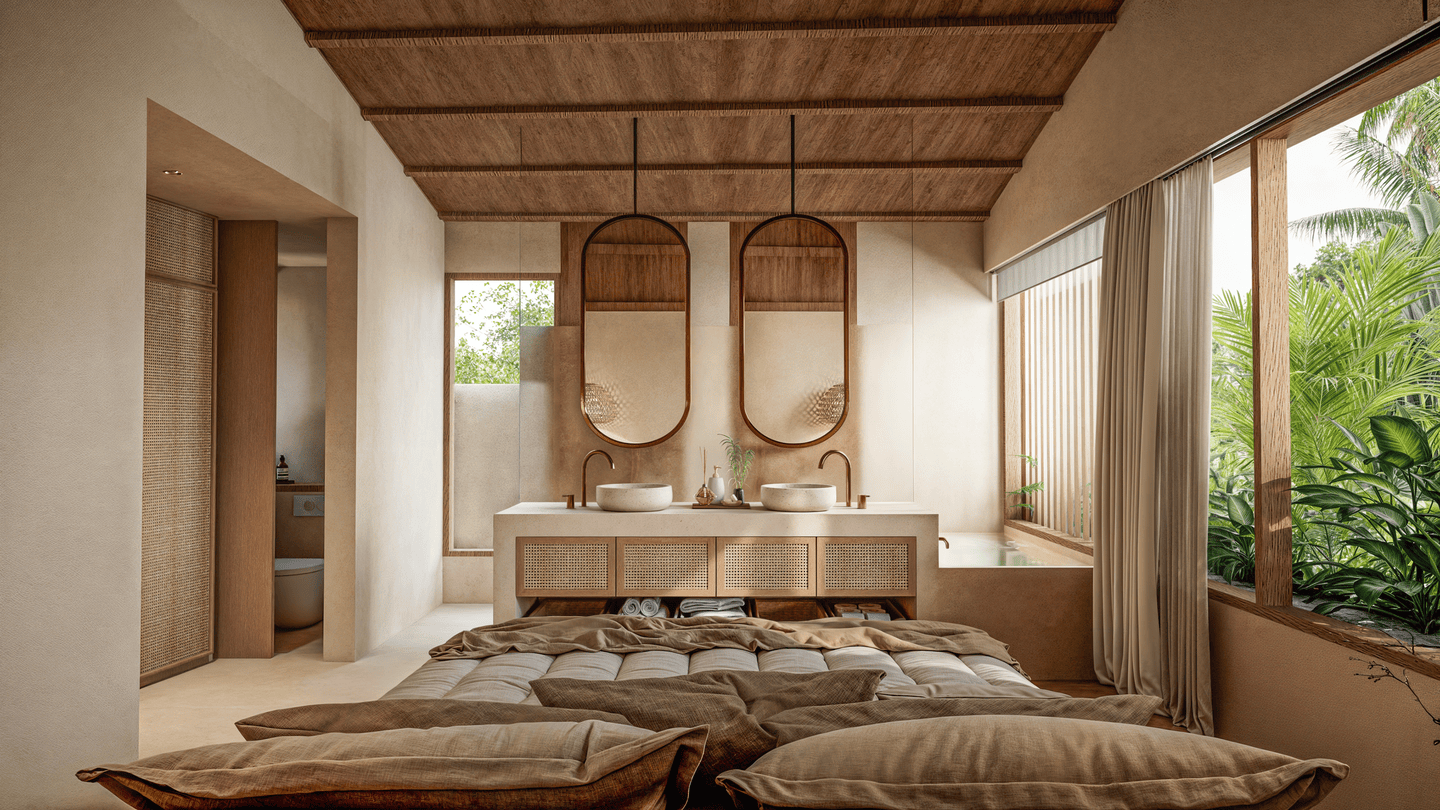 Cette villa de deux chambres offre une retraite tropicale sereine avec un design unique alliant parfaitement confort intérieur et vie en plein air. L’architecture adopte des formes douces et arrondies, évoquant une oasis tropicale, avec un salon en contrebas au centre entouré par la piscine et une pergola ombragée, créant un espace idéal pour la détente et la convivialité.