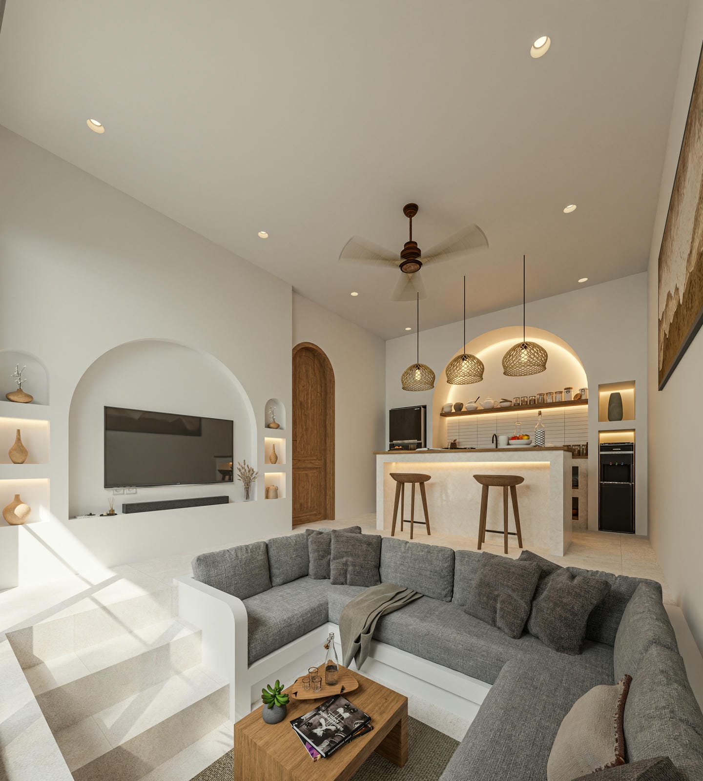 L’intérieur adopte une esthétique tropicale-méditerranéenne raffinée, mêlant courbes douces, tons bois chaleureux et finitions en pierre naturelle. L’espace de vie fermé s’ouvre harmonieusement sur une cuisine soigneusement conçue, créant un espace à la fois calme et fonctionnel, complété par une chambre confortable avec salle de bain attenante.