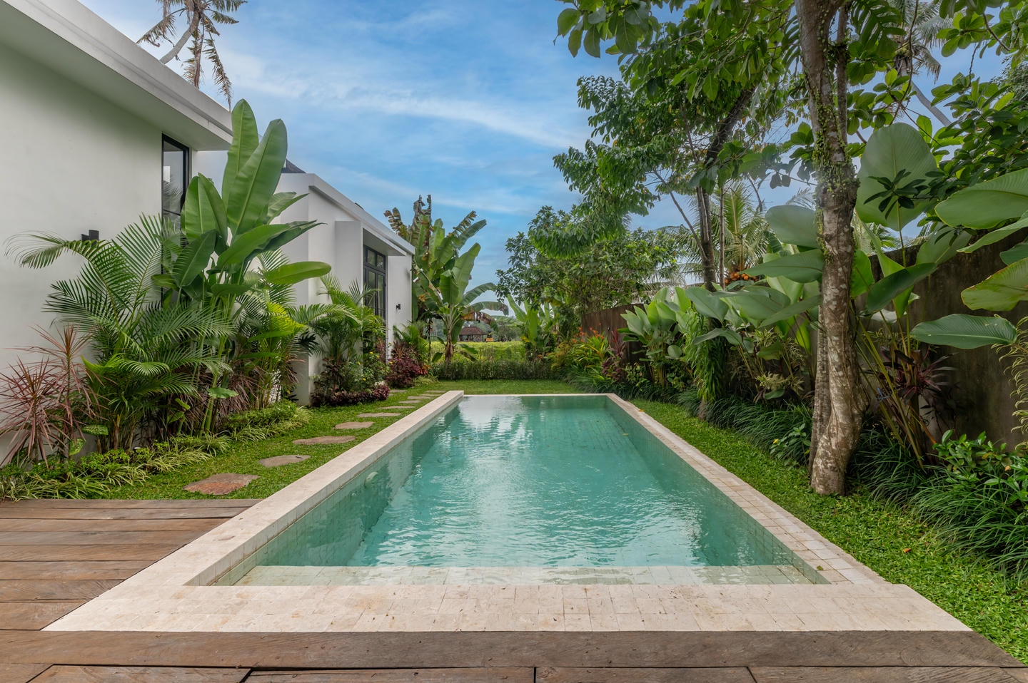 L’espace extérieur s’articule autour d’une cour privée avec une piscine compacte, offrant un cadre intime et apaisant pour se détendre. Les matériaux sélectionnés avec soin, la végétation et les éléments à ciel ouvert renforcent la sensation de confidentialité tout en maintenant un lien fort avec la nature.