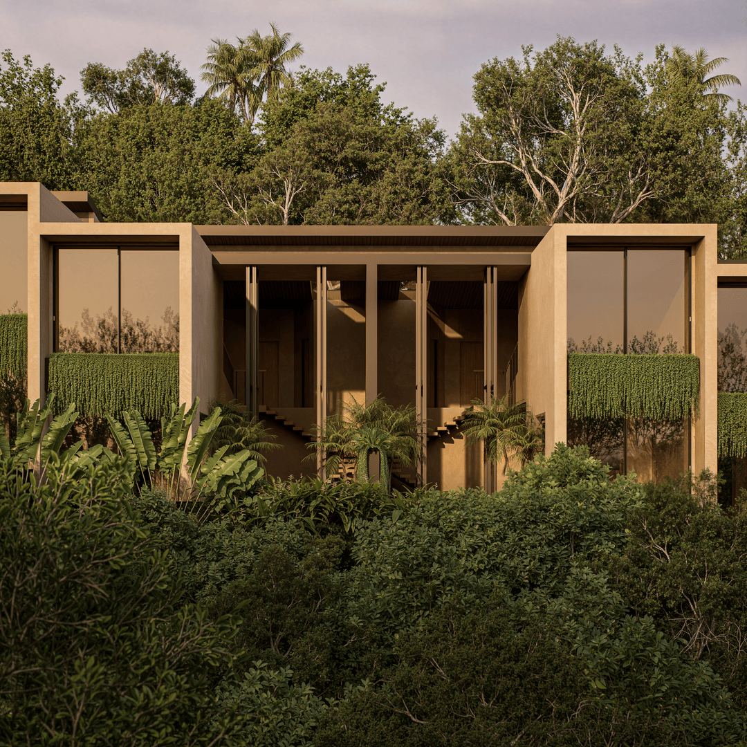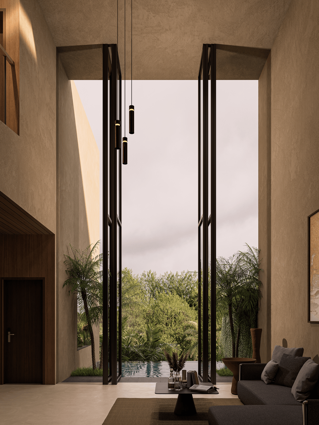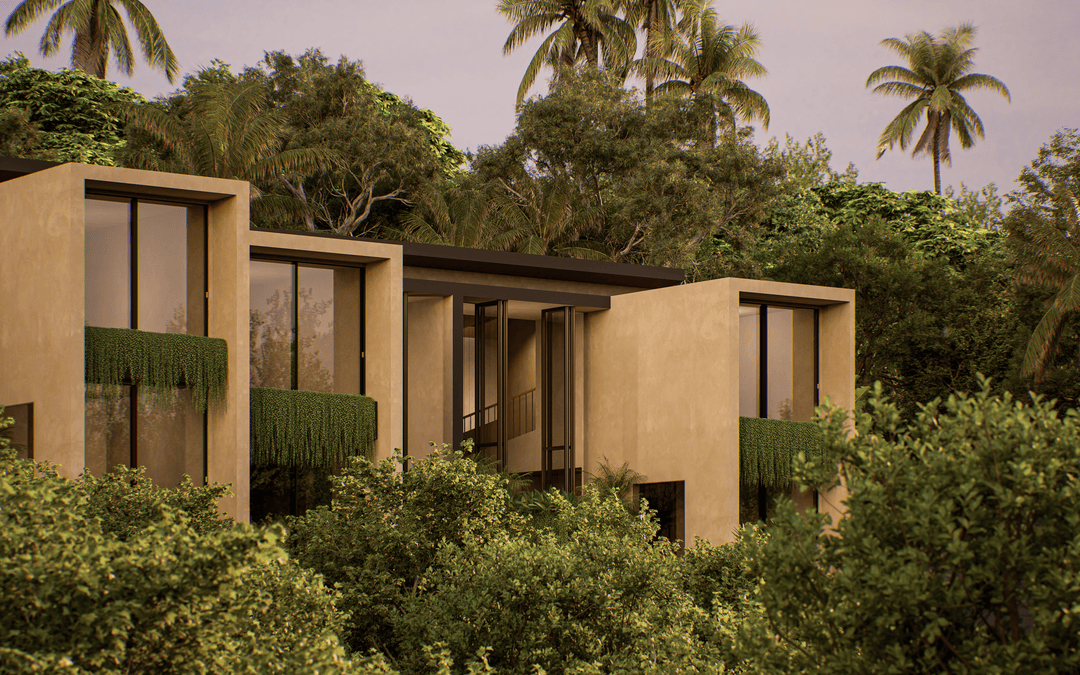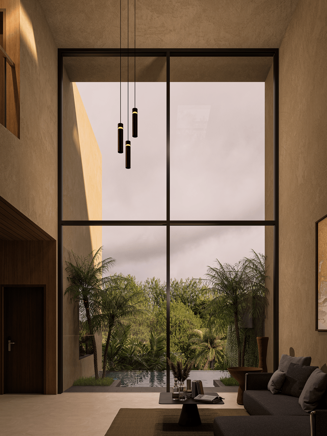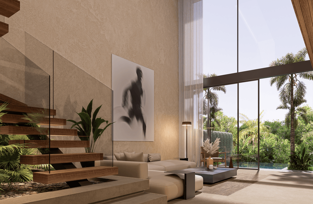 Depuis le deuxième étage, les fenêtres à double vitrage offrent une vue sereine sur la jungle luxuriante, créant une atmosphère paisible idéale pour vivre et travailler.