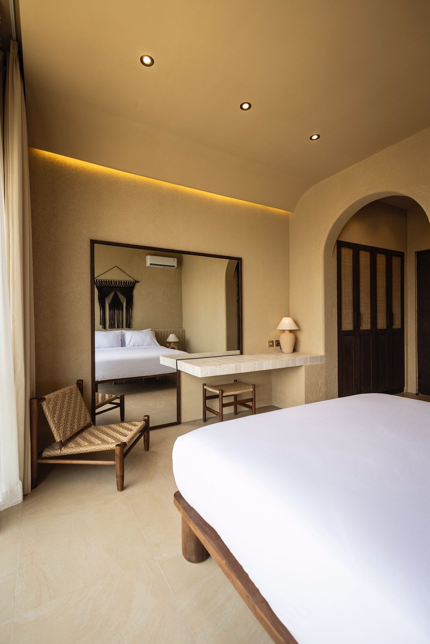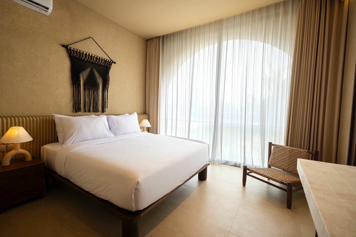 Le design intérieur adopte une esthétique tropicale moderne raffinée, mêlant des tons neutres chaleureux. Les espaces de vie, soigneusement conçus, s’enchaînent harmonieusement, avec de hauts plafonds et de larges ouvertures laissant entrer une abondante lumière naturelle. Les deux chambres sont pensées pour le confort et la détente, chacune disposant d’une salle de bain attenante aux lignes épurées et aux finitions naturelles.