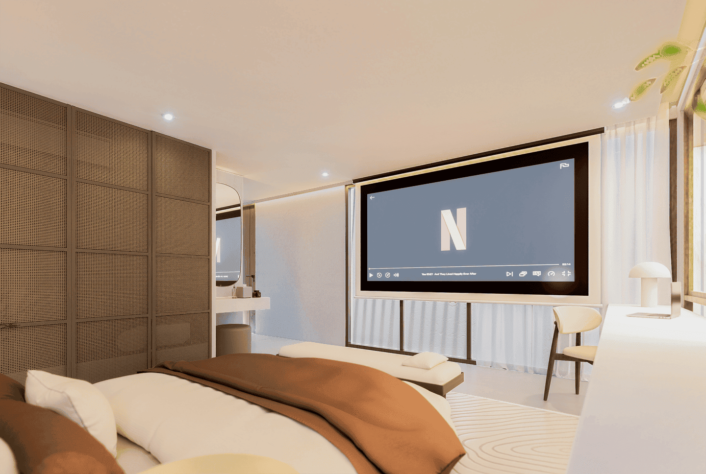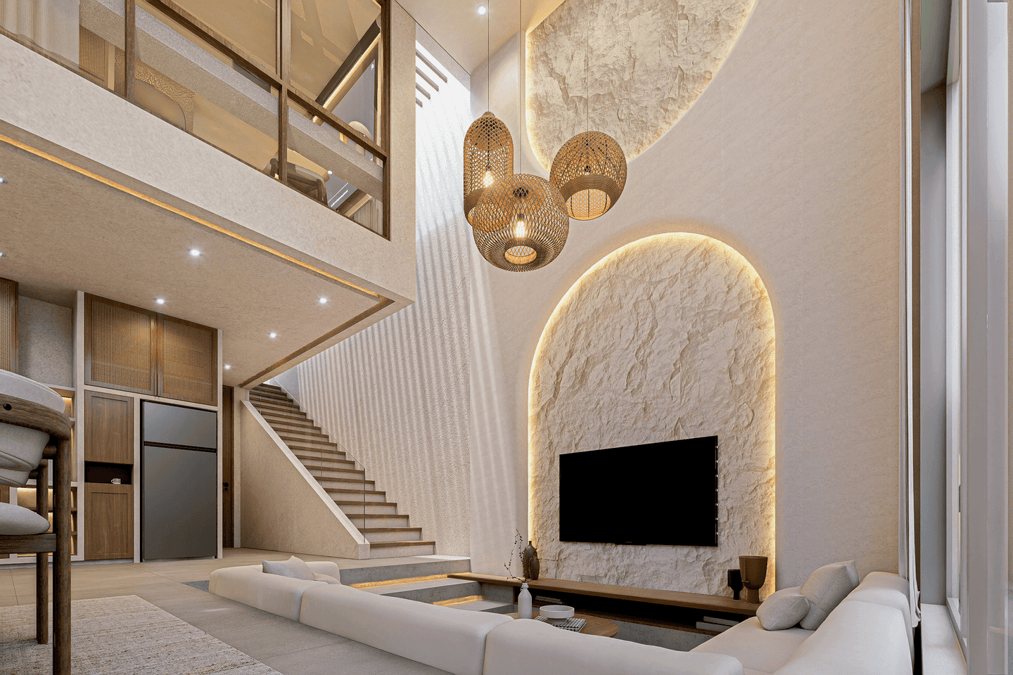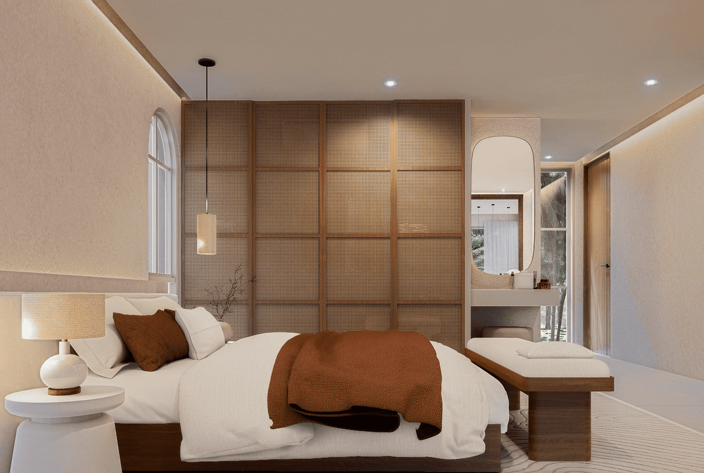 Conçue avec une esthétique inspirée de la Méditerranée, cette villa au concept ouvert présente de hauts plafonds et de grandes fenêtres qui laissent entrer une abondante lumière naturelle, créant une atmosphère lumineuse et aérée. Un élégant salon en contrebas apporte une touche architecturale distinctive et un espace chaleureux pour se détendre, tandis que le salon s’ouvre harmonieusement sur la salle à manger et la cuisine, rendant l’agencement idéal aussi bien pour la vie quotidienne que pour recevoir. Des textures chaleureuses, un éclairage doux et des matériaux naturels subliment l’espace et créent une ambiance accueillante et élégante. Cette villa propose également une option de design alternatif dans un style industriel pour ceux qui préfèrent un caractère plus moderne et urbain. La propriété dispose de 2 chambres et 2 salles de bains, dont une chambre principale qui allie confort et fonctionnalité avec un grand lit confortable, un espace lounge intégré et un coin bureau pratique. Des placards intégrés et de larges baies vitrées offrent une grande luminosité naturelle ainsi qu’un espace de rangement optimisé.