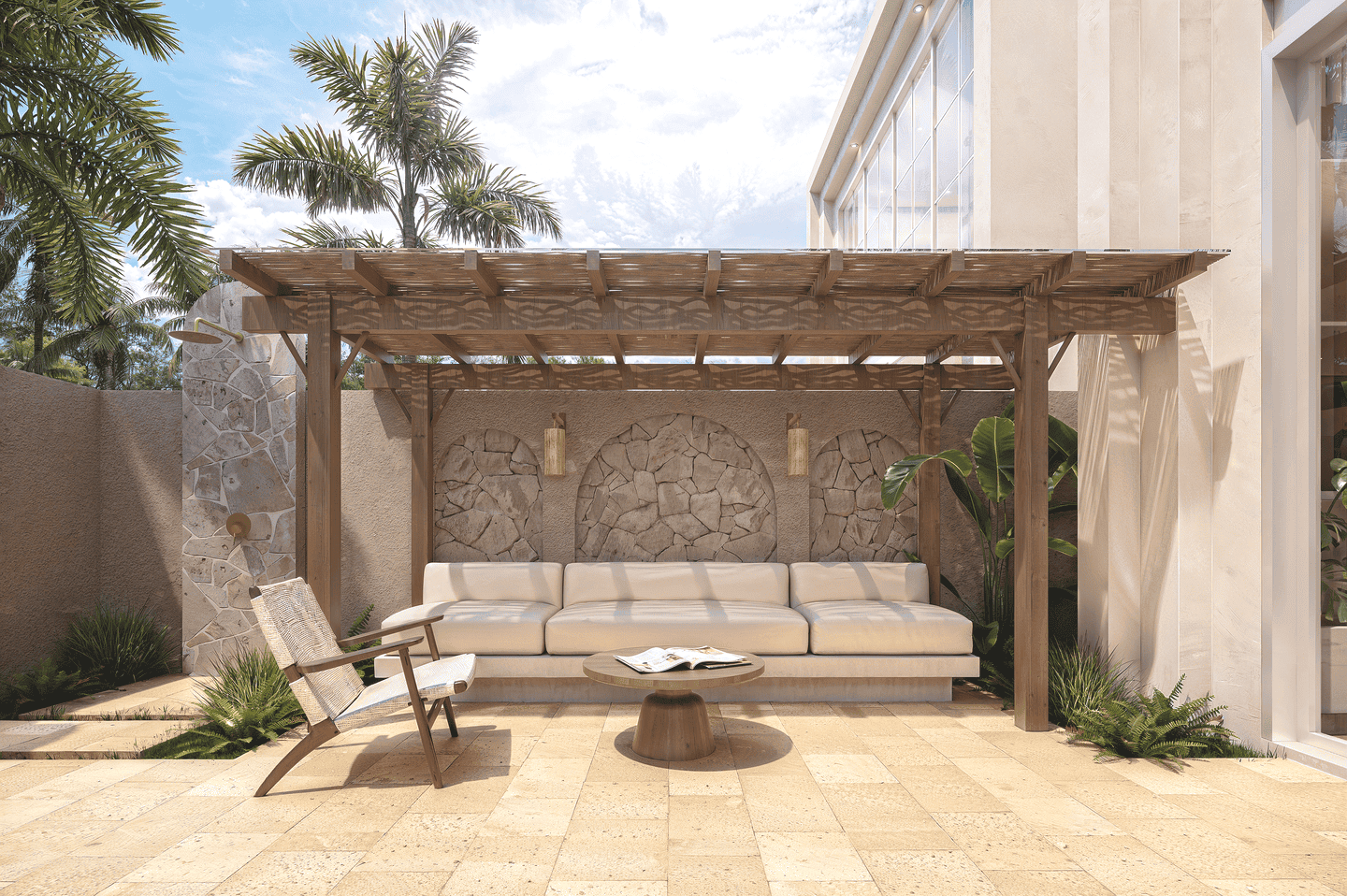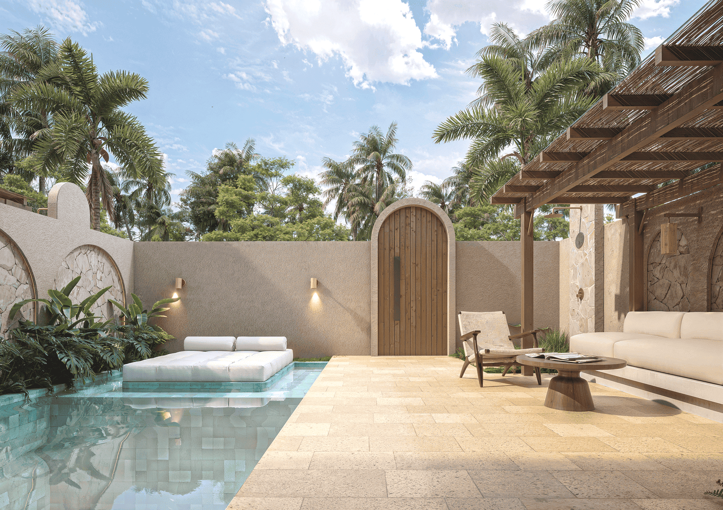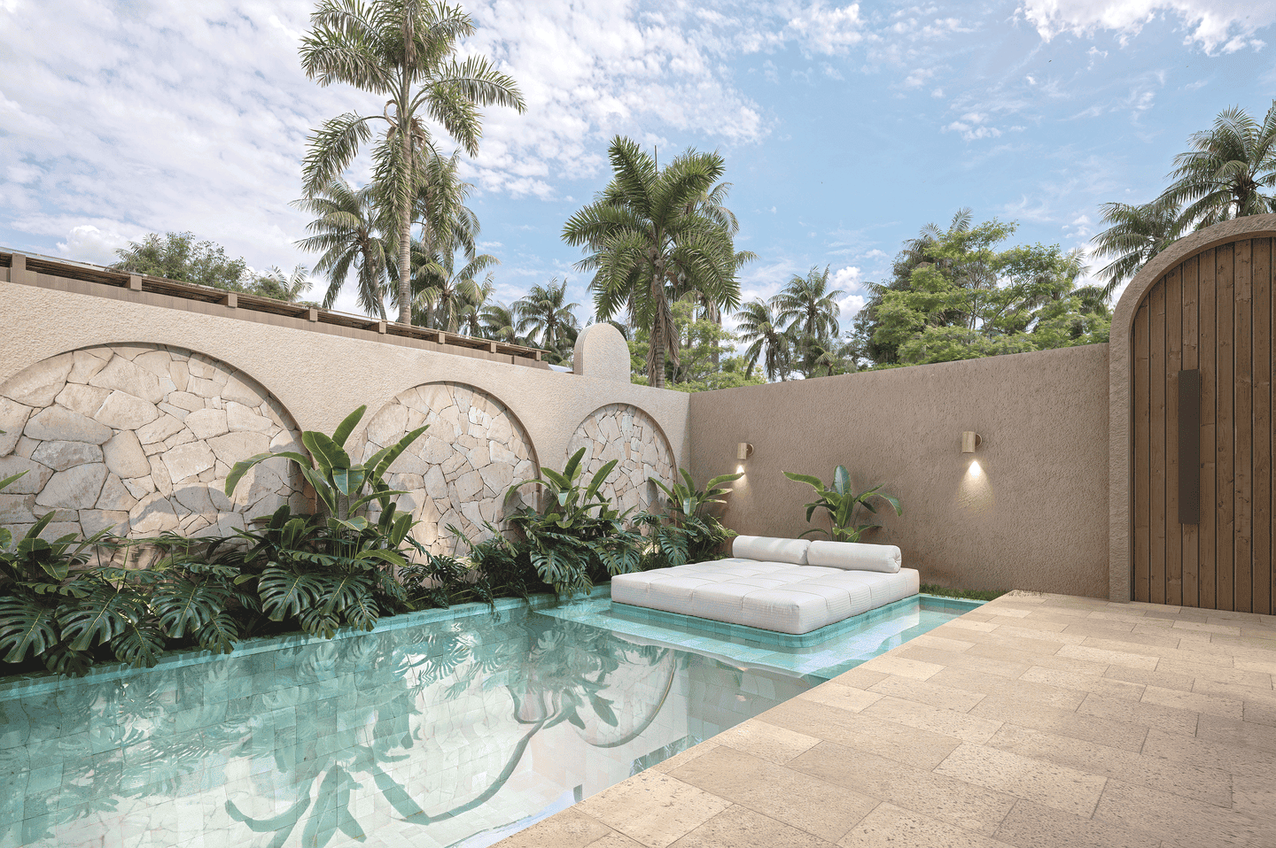 L’espace extérieur comprend une piscine privée avec un élégant salon en contrebas, créant un lieu relaxant pour se détendre au bord de l’eau. Un espace assis ombragé sous une pergola en bois apporte davantage de confort pour la vie en extérieur, tandis que des murs texturés, des matériaux naturels et des plantes tropicales renforcent l’atmosphère chaleureuse inspirée de la Méditerranée.