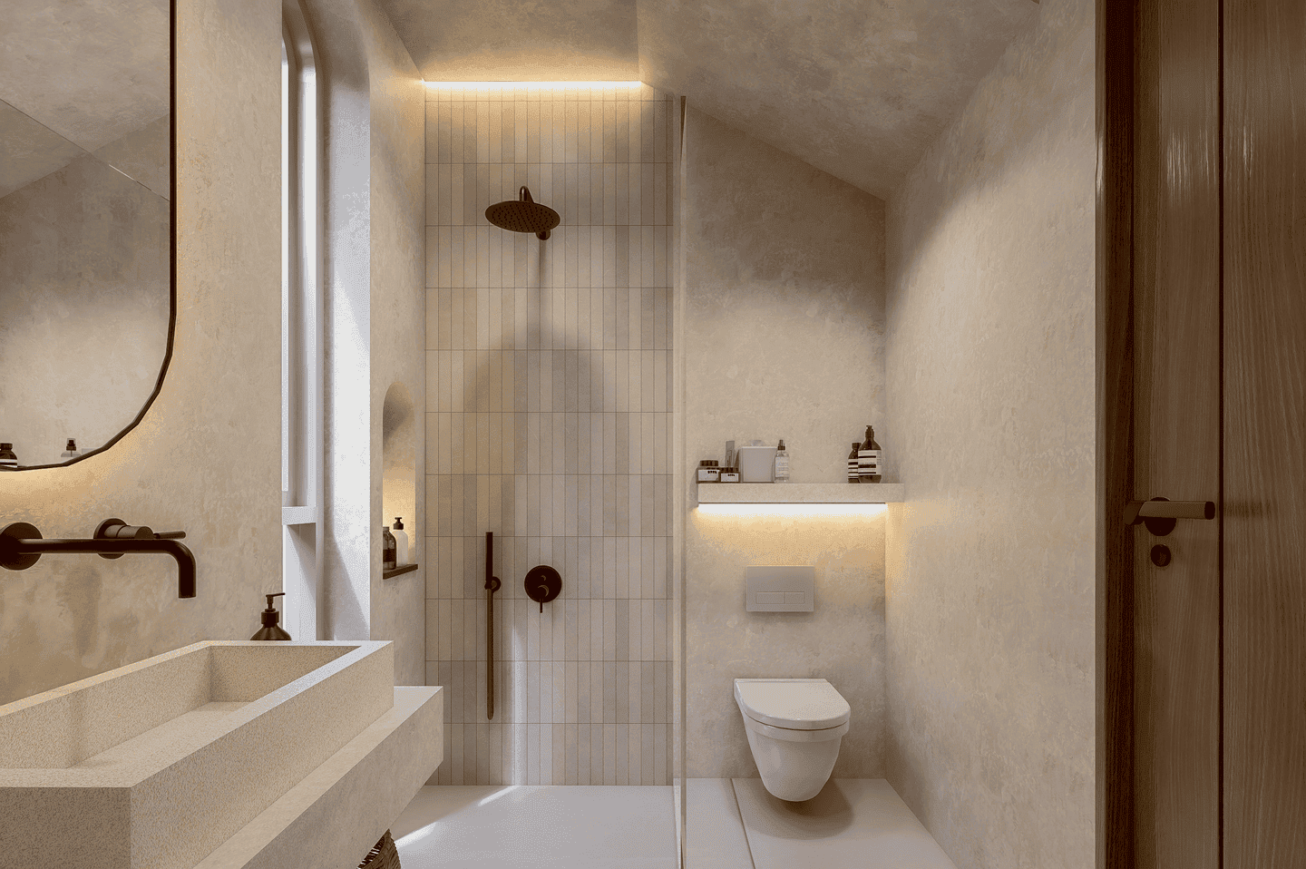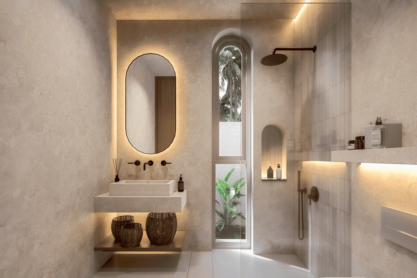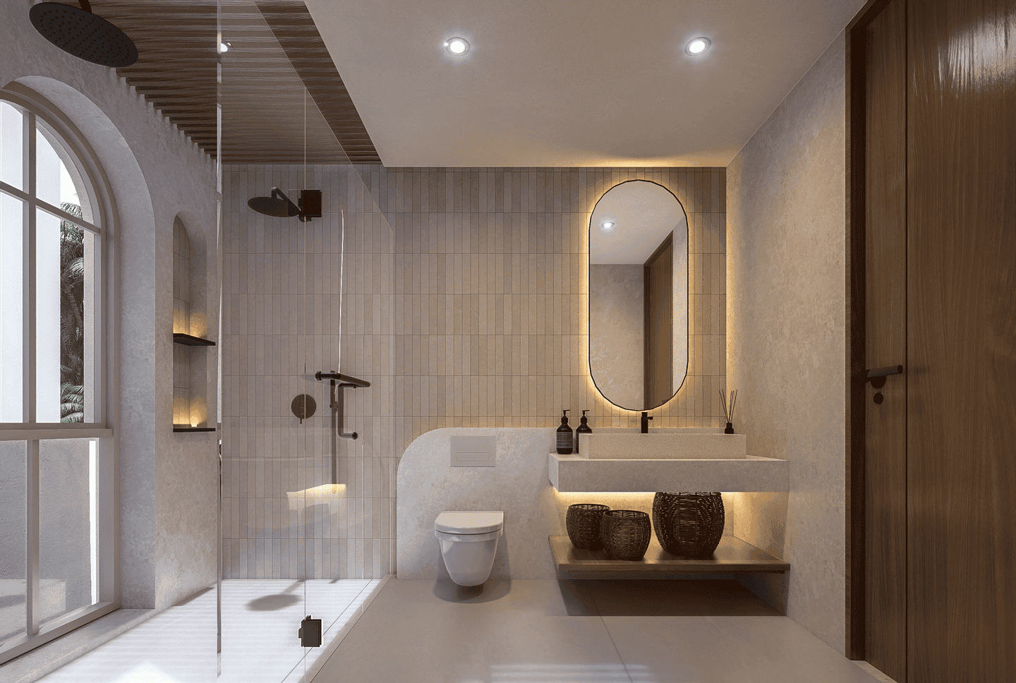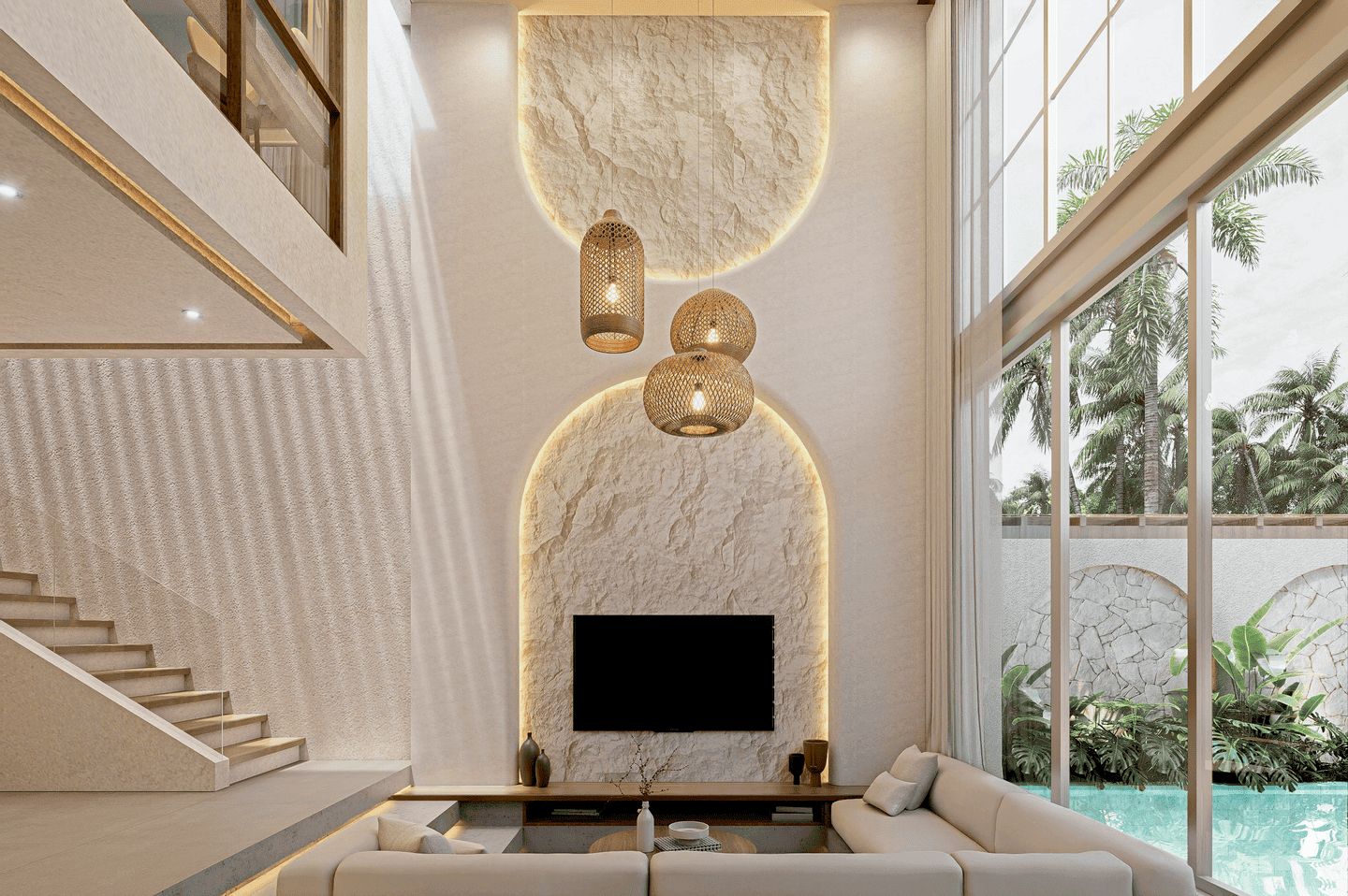 L’espace extérieur comprend une piscine privée avec un élégant salon en contrebas, créant un lieu relaxant pour se détendre au bord de l’eau. Un espace assis ombragé sous une pergola en bois apporte davantage de confort pour la vie en extérieur, tandis que des murs texturés, des matériaux naturels et des plantes tropicales renforcent l’atmosphère chaleureuse inspirée de la Méditerranée.