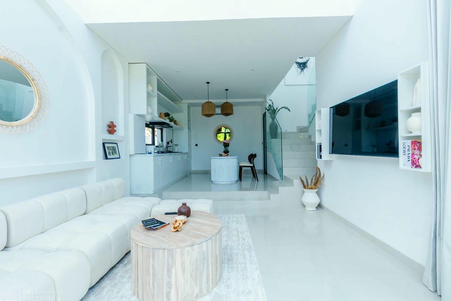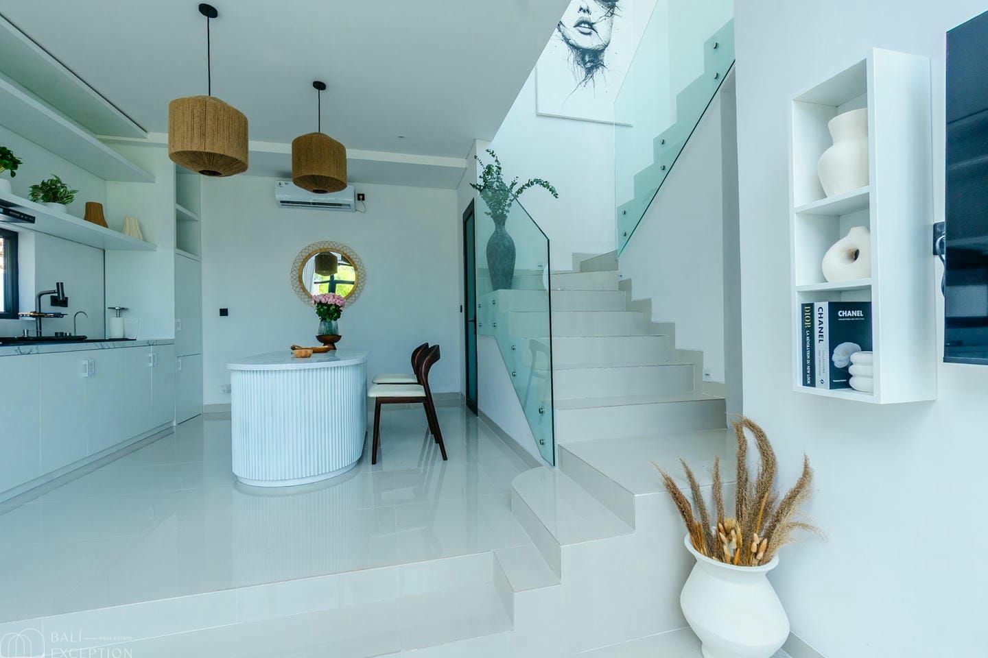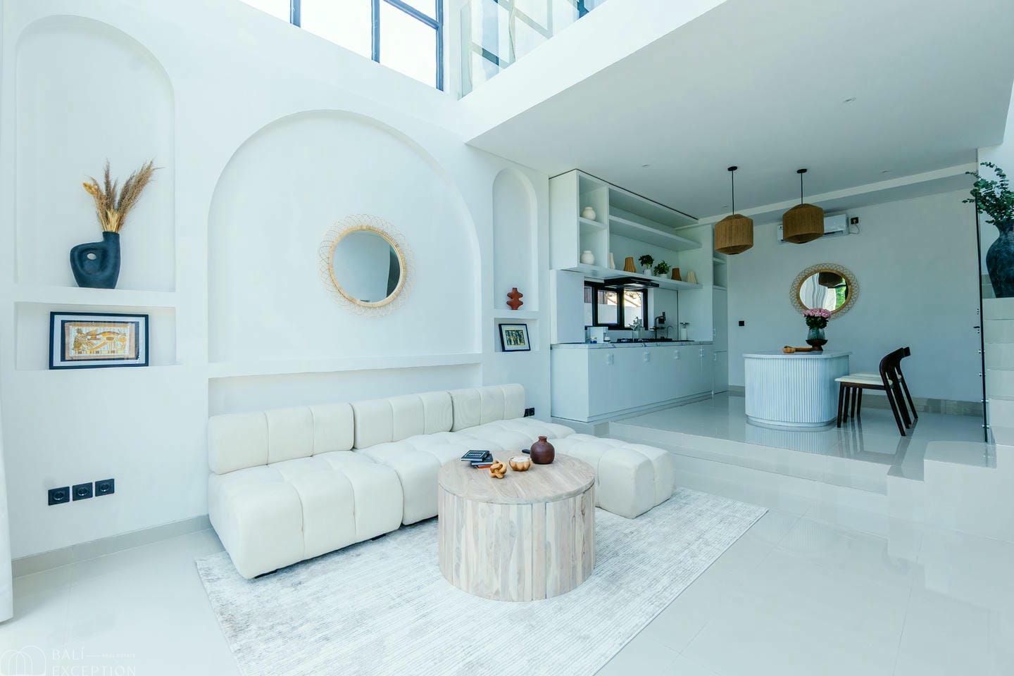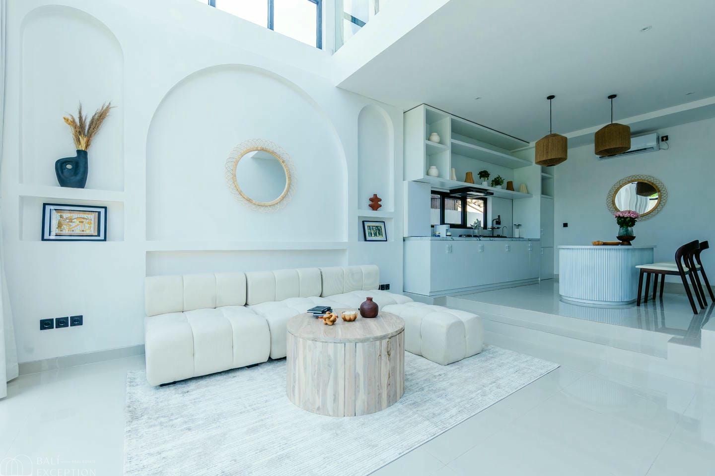 Cette villa magnifiquement conçue présente une esthétique tropicale moderne avec des lignes épurées, de hauts plafonds et une abondance de lumière naturelle, créant une atmosphère lumineuse et aérée. L’espace de vie ouvert relie harmonieusement le salon, la salle à manger et la cuisine entièrement équipée, avec de grandes baies vitrées qui ouvrent sur l’extérieur et donnent un accès direct à une piscine privée et un jardin — idéal pour se détendre ou recevoir. Aménagé avec des tons neutres doux et des finitions élégantes, l’espace dégage une sensation de calme et de sophistication.