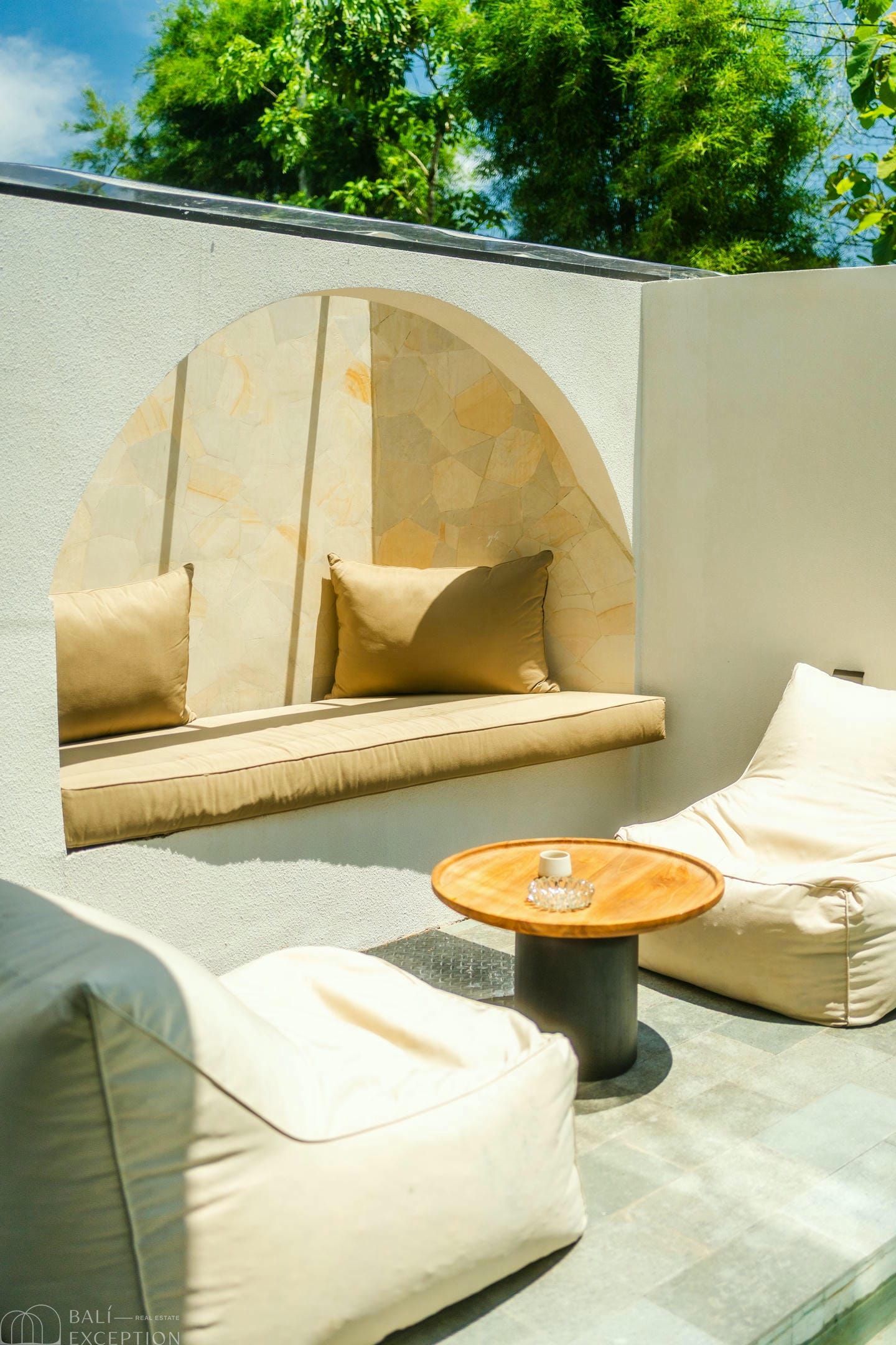 L’espace extérieur dispose d’une piscine privée, de chaises longues et d’une végétation tropicale, créant un cadre parfait pour se détendre et recevoir. La villa comprend également un rooftop, offrant un espace supplémentaire pour se relaxer, accueillir des invités et profiter de vues dégagées dans un cadre plus intime.