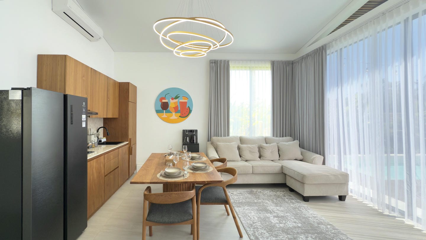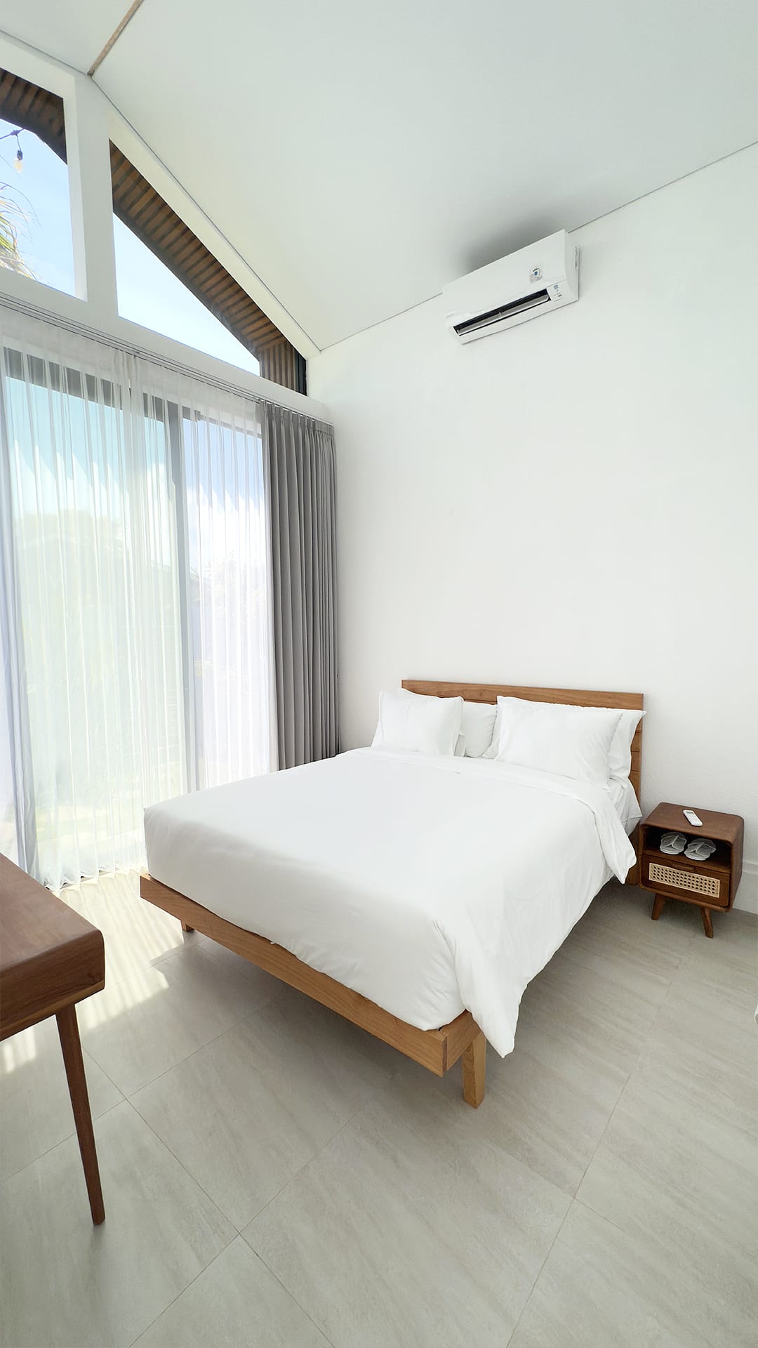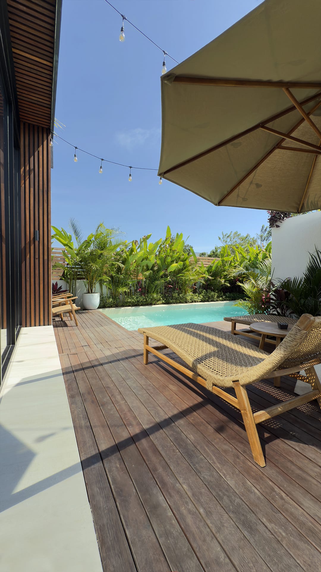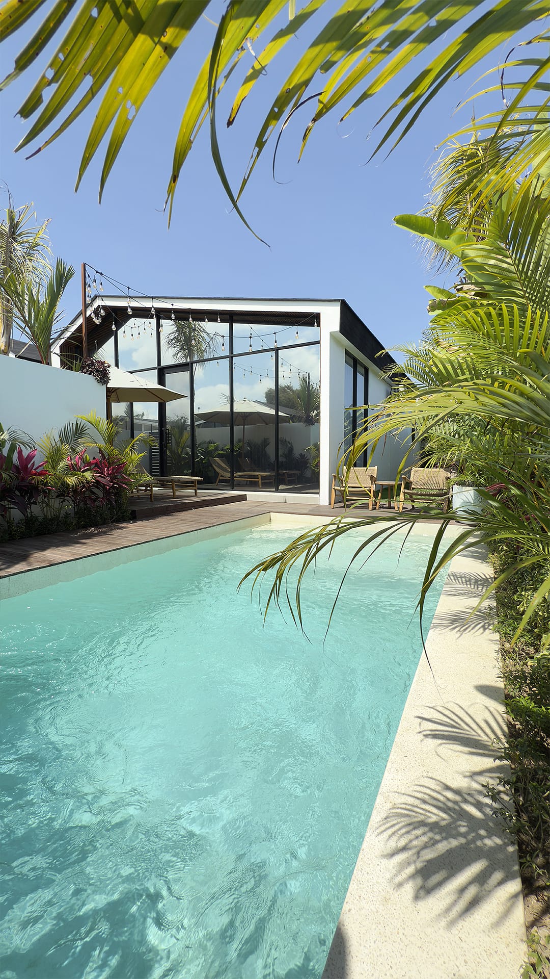 L’intérieur présente un style tropical moderne aux lignes épurées, avec de hauts plafonds et des baies vitrées du sol au plafond. Les tons naturels, les touches de bois chaleureux et les textures douces créent un espace de vie lumineux, aéré et élégant, à la fois chic et confortable.