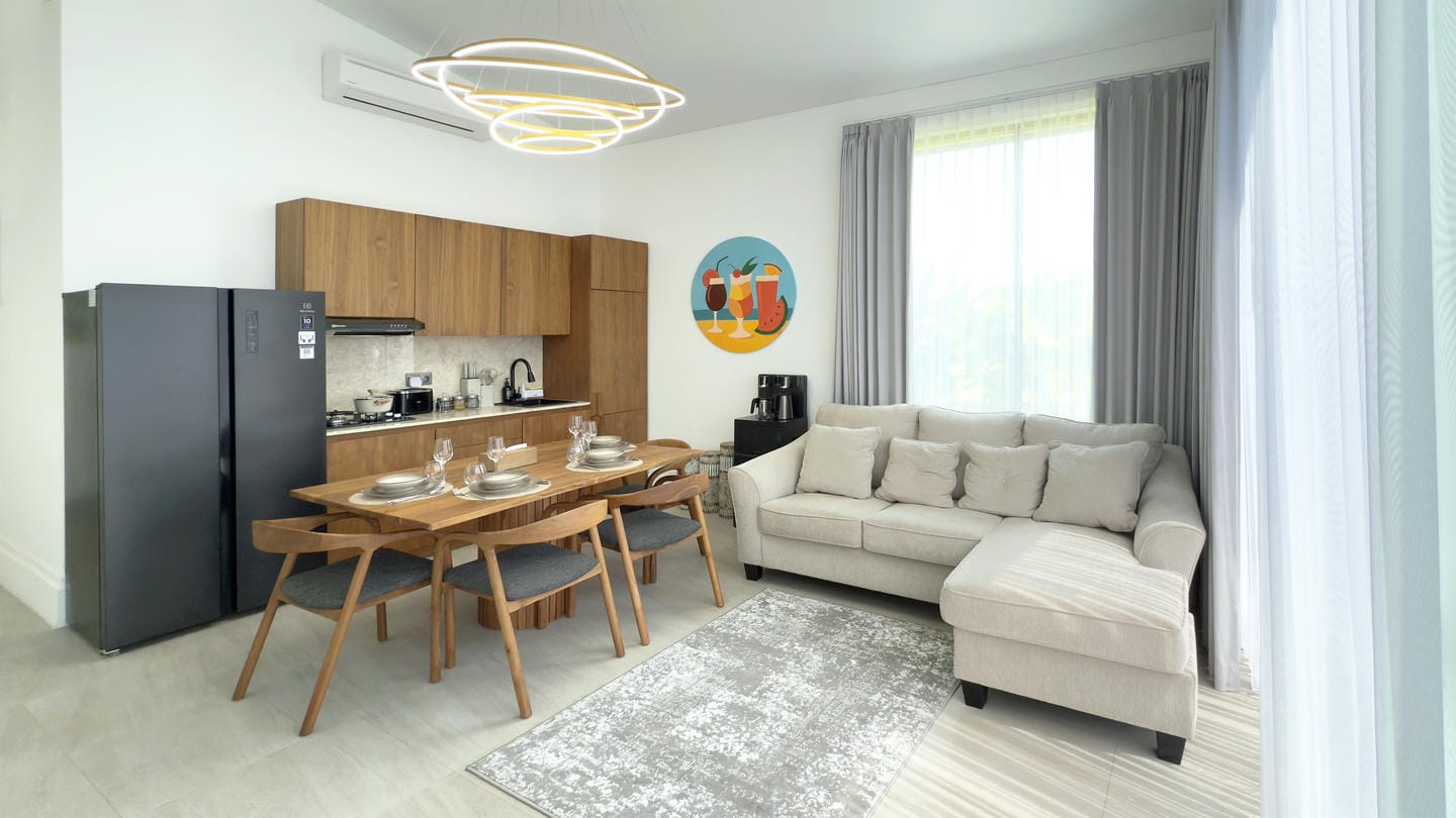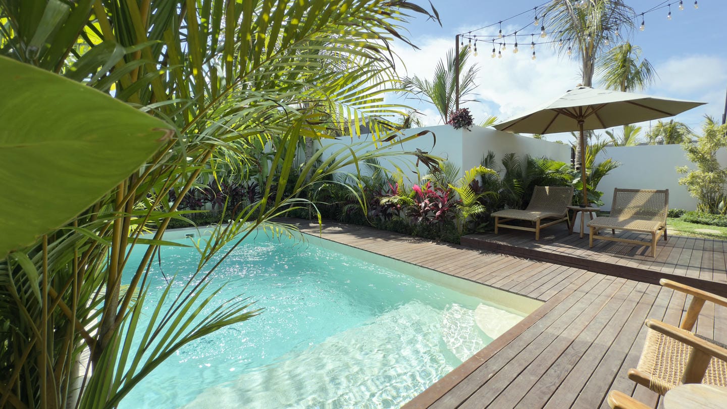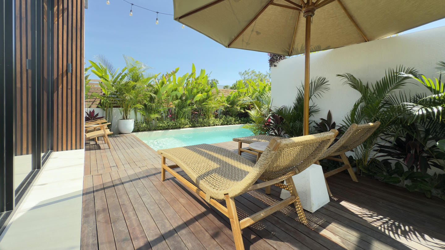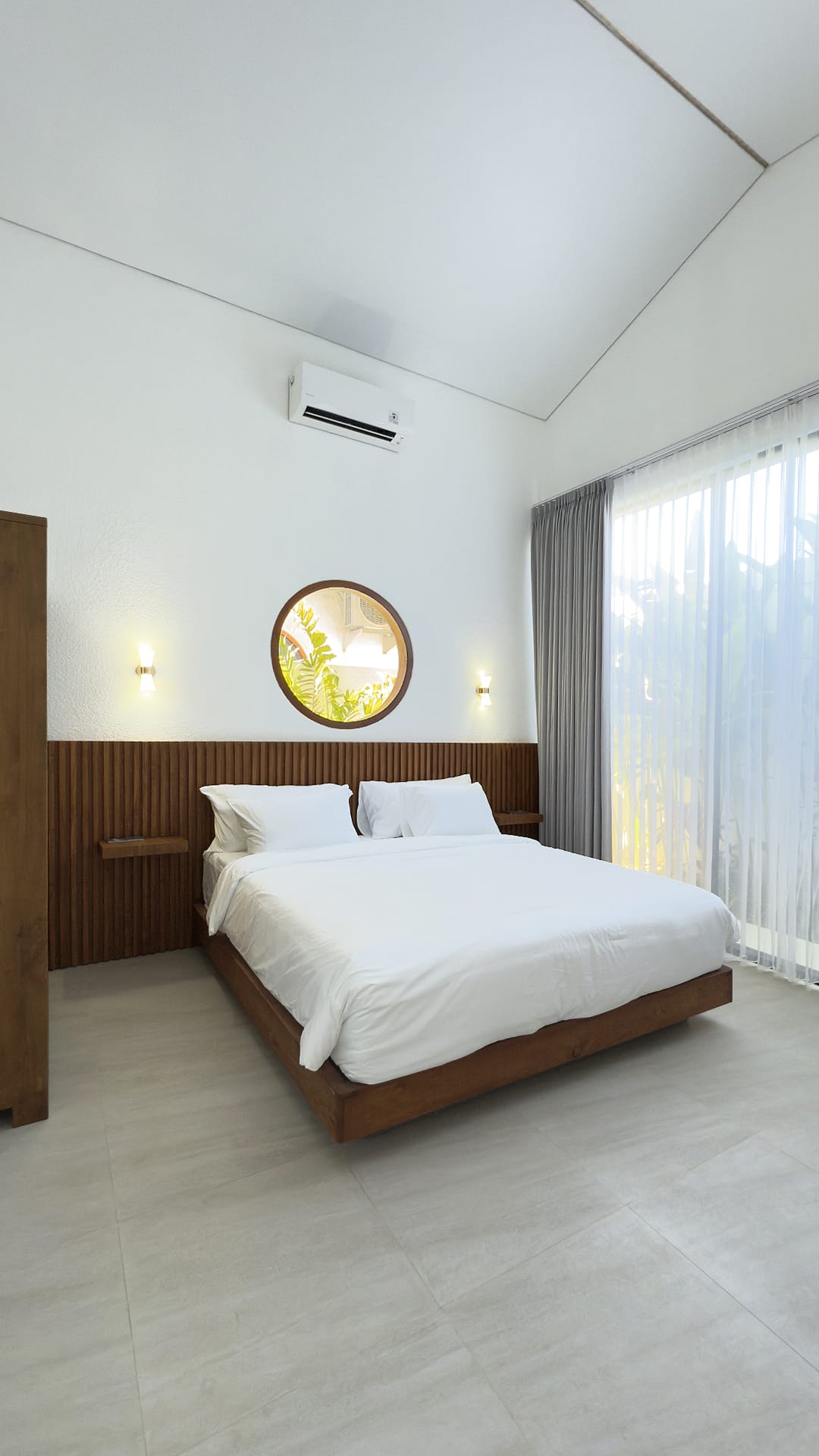 L’intérieur présente un style tropical moderne aux lignes épurées, avec de hauts plafonds et des baies vitrées du sol au plafond. Les tons naturels, les touches de bois chaleureux et les textures douces créent un espace de vie lumineux, aéré et élégant, à la fois chic et confortable.