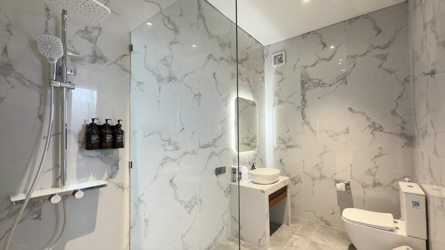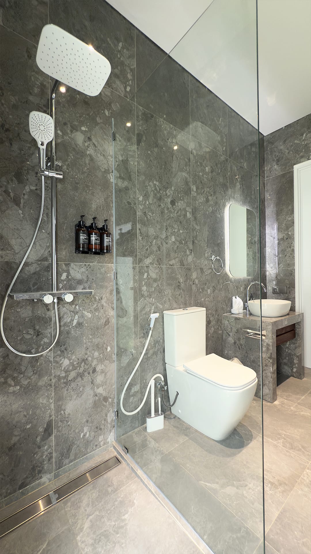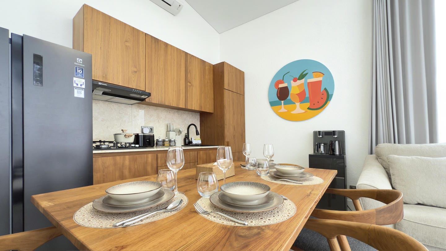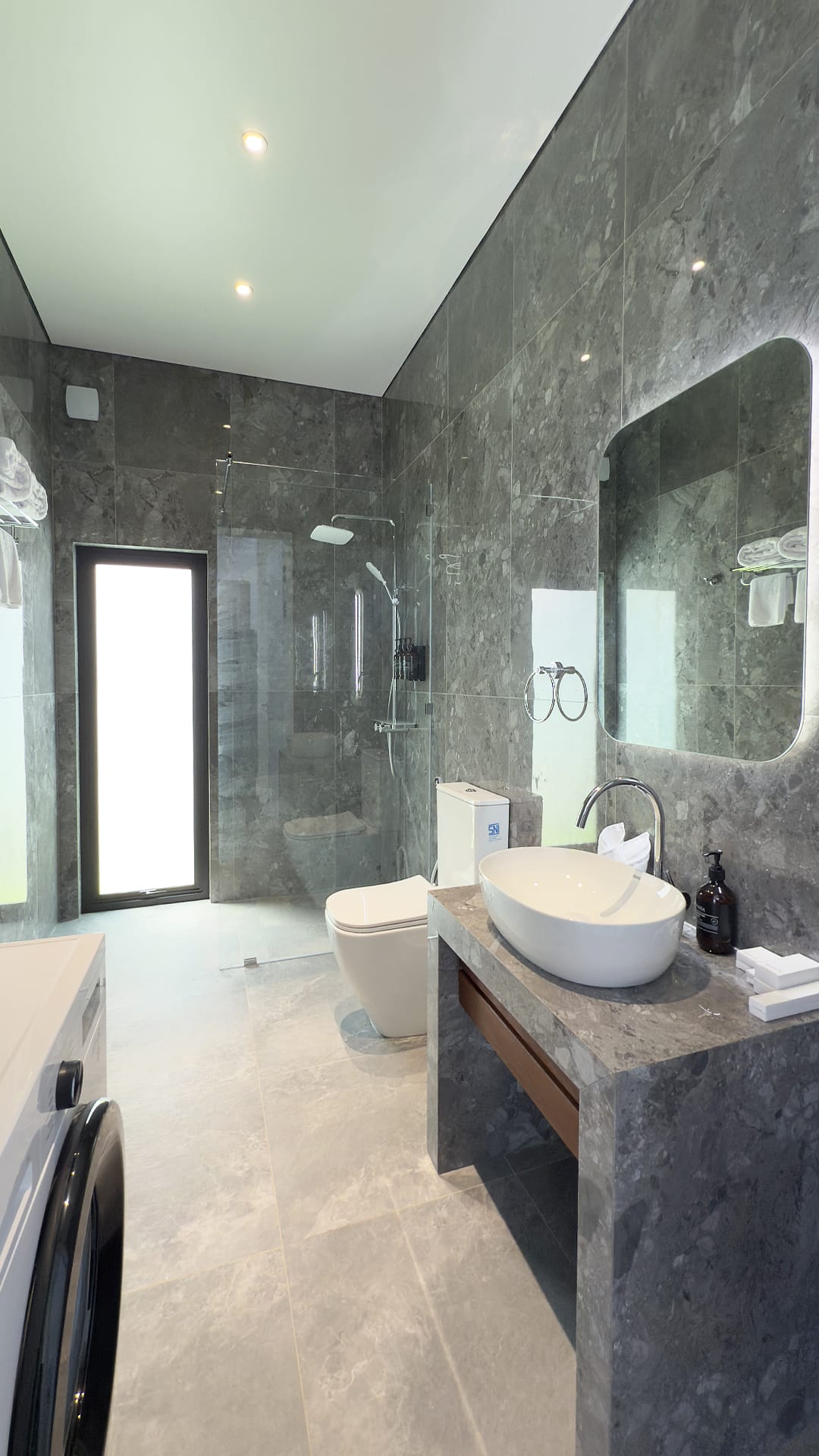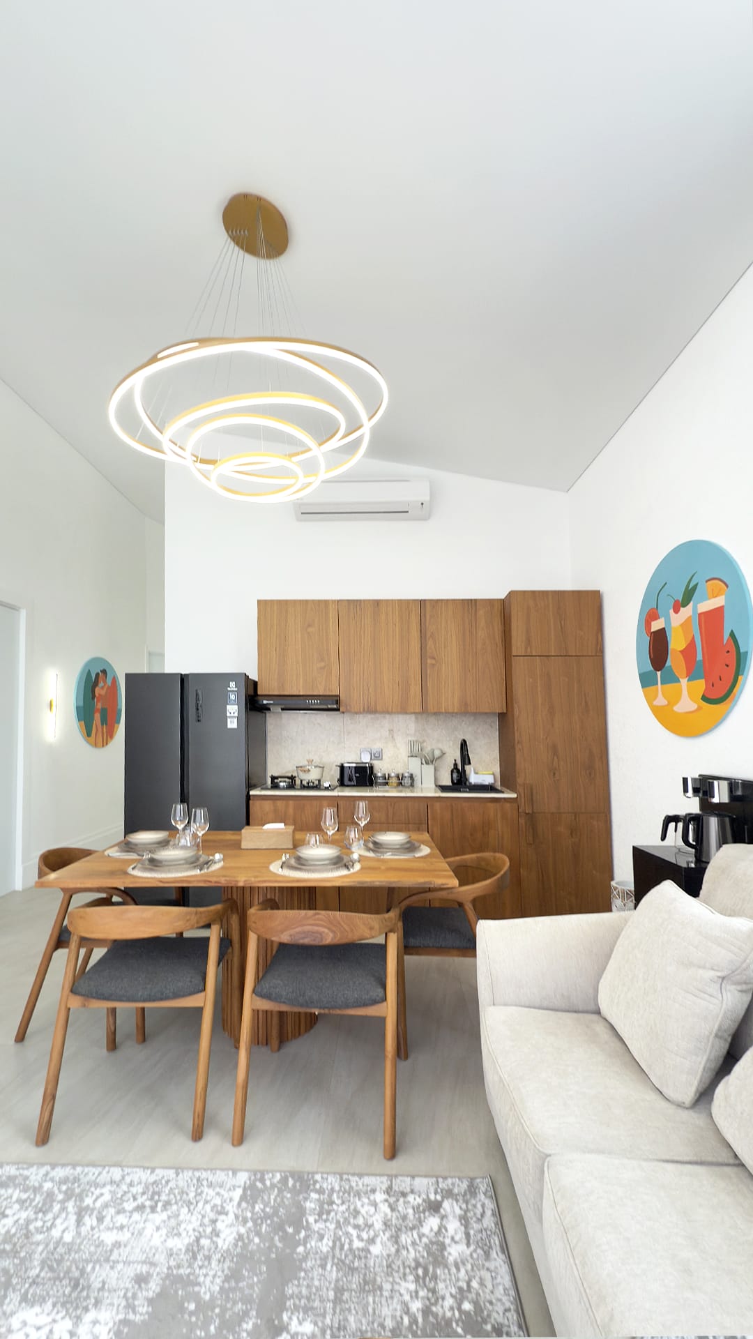 L’intérieur présente un style tropical moderne aux lignes épurées, avec de hauts plafonds et des baies vitrées du sol au plafond. Les tons naturels, les touches de bois chaleureux et les textures douces créent un espace de vie lumineux, aéré et élégant, à la fois chic et confortable.
