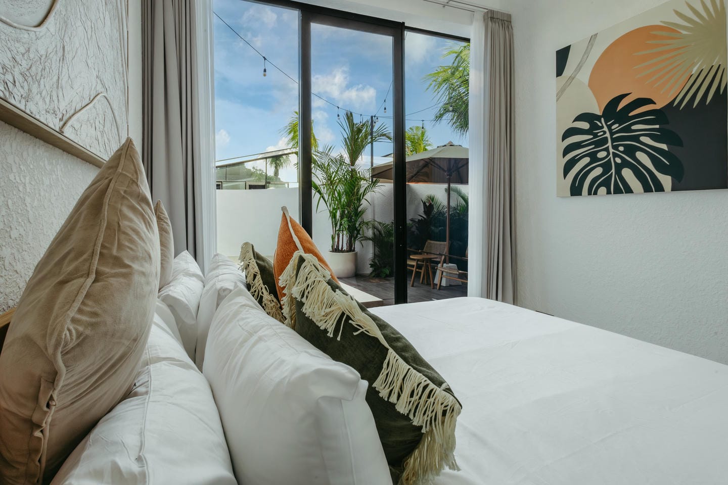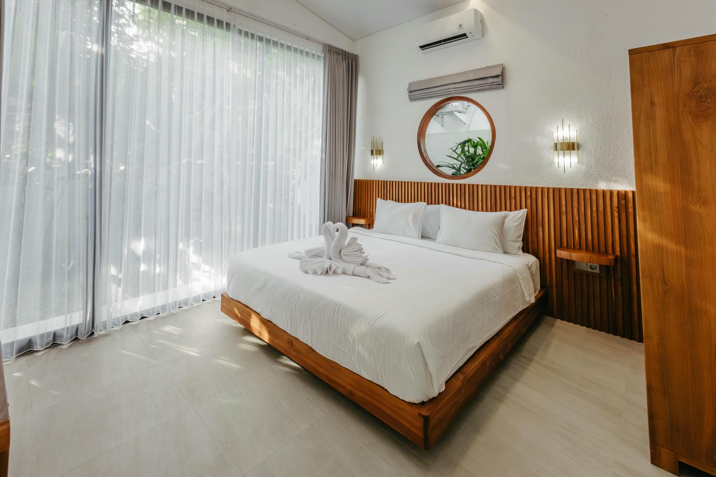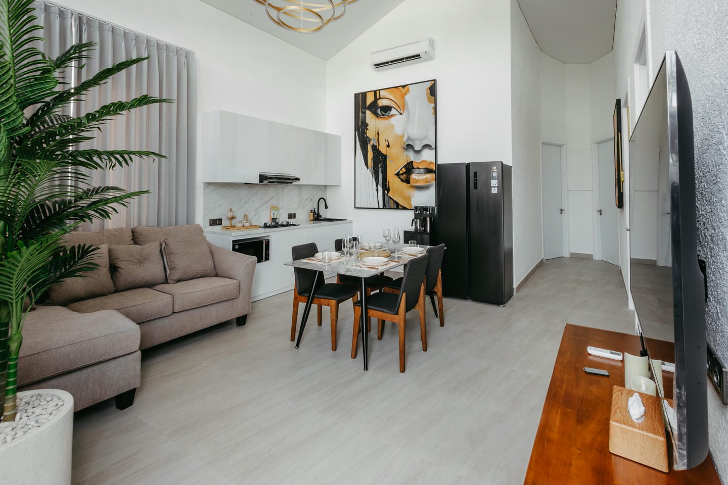 L'intérieur présente un style tropical moderne aux lignes épurées, avec de hauts plafonds et des baies vitrées du sol au plafond. Les tons naturels, les touches de bois chaleureux et les textures douces créent un espace de vie lumineux, aéré et élégant, à la fois chic et confortable.