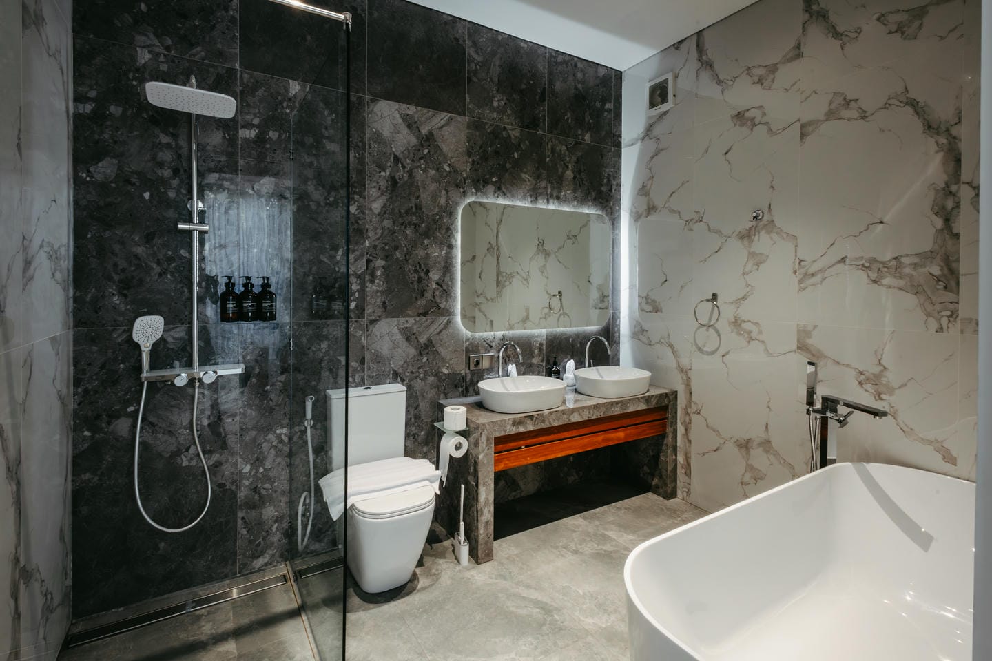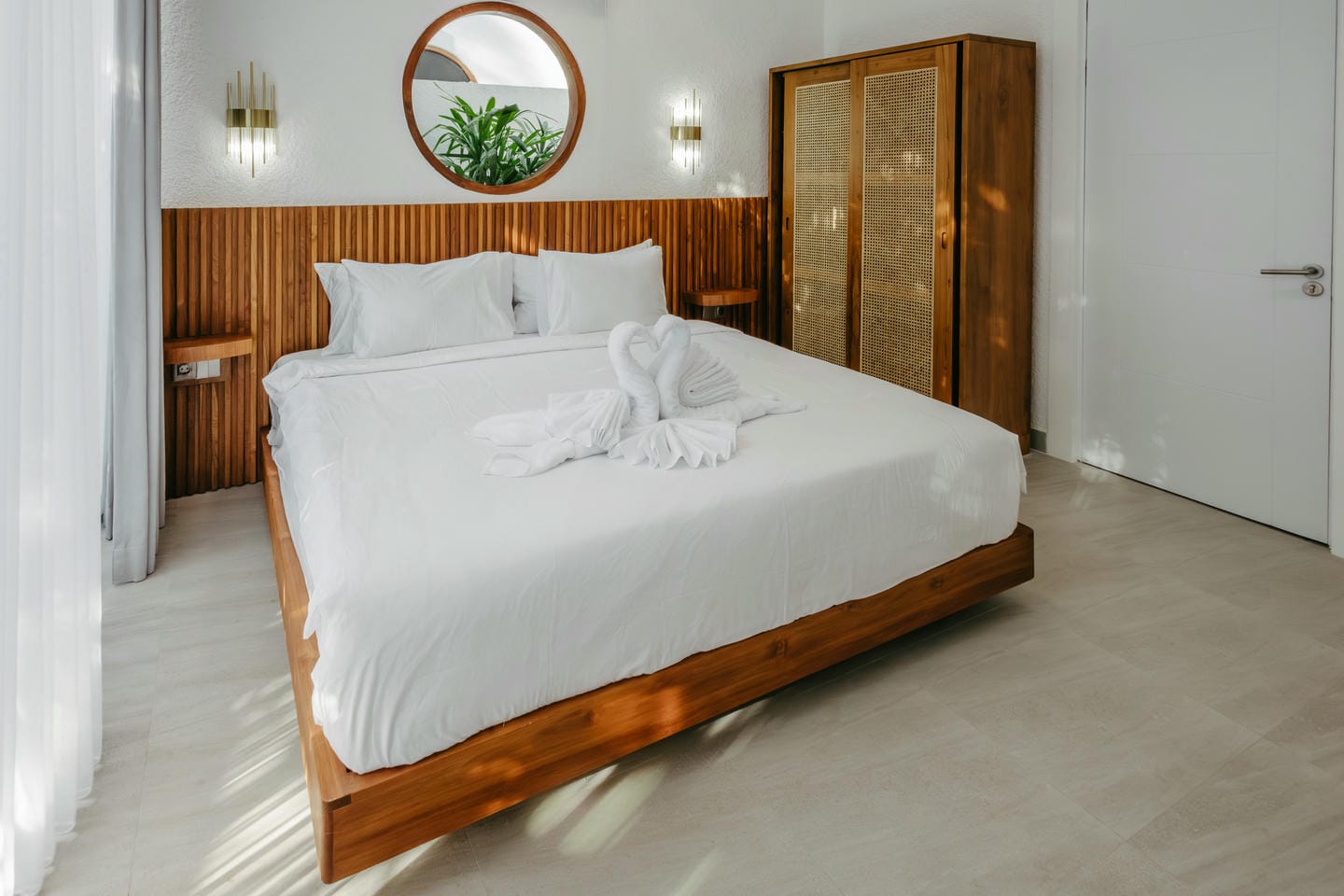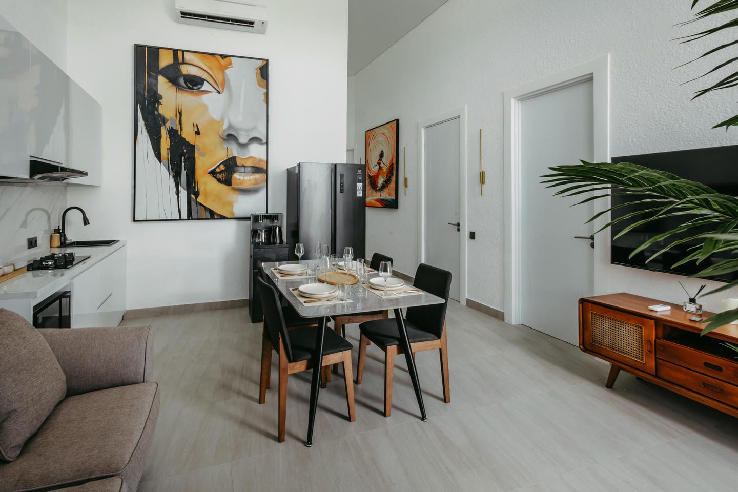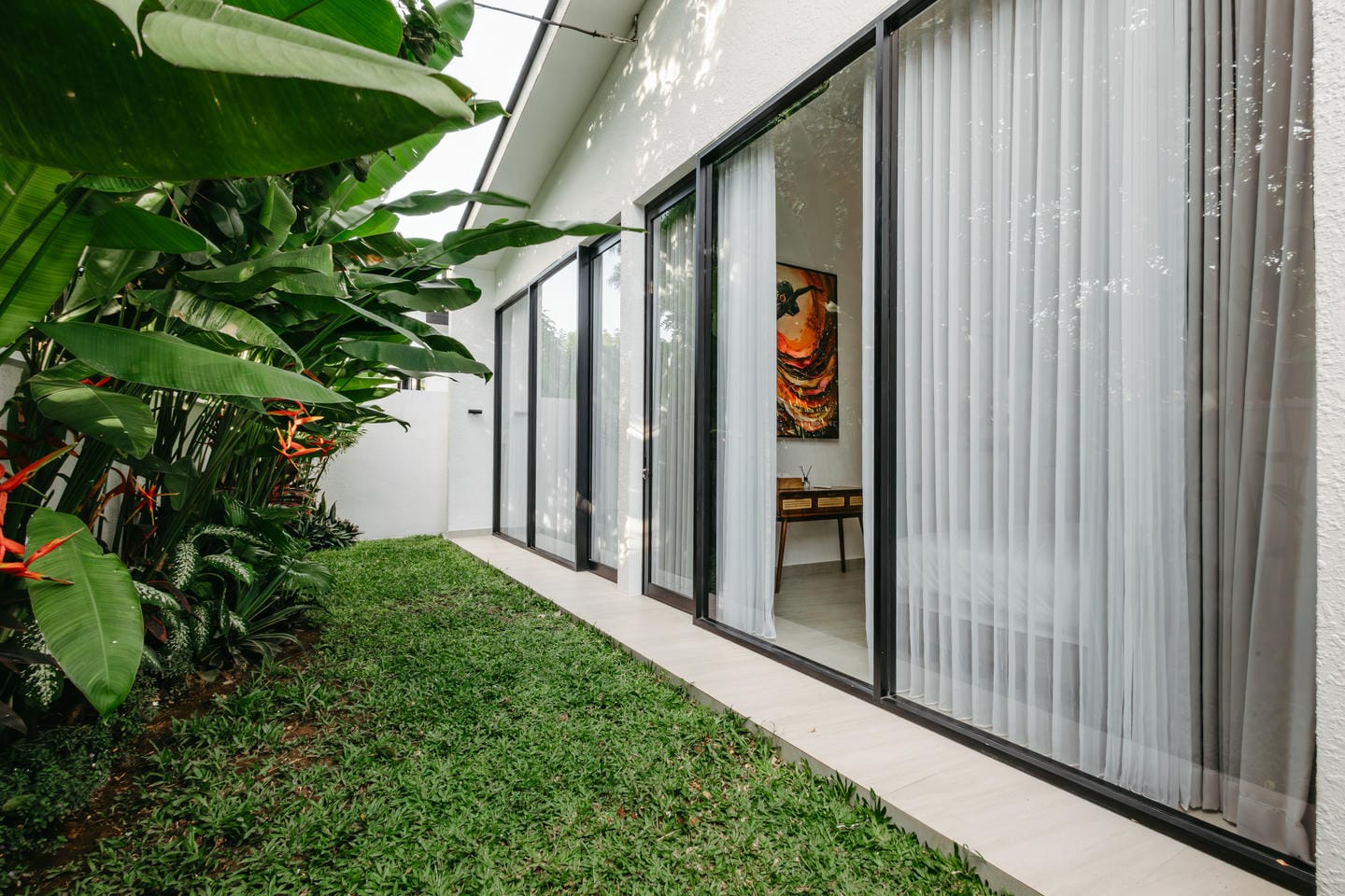 L'intérieur présente un style tropical moderne aux lignes épurées, avec de hauts plafonds et des baies vitrées du sol au plafond. Les tons naturels, les touches de bois chaleureux et les textures douces créent un espace de vie lumineux, aéré et élégant, à la fois chic et confortable.