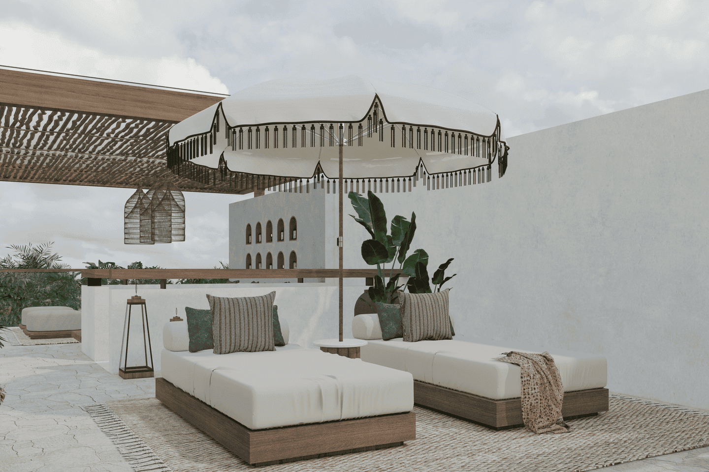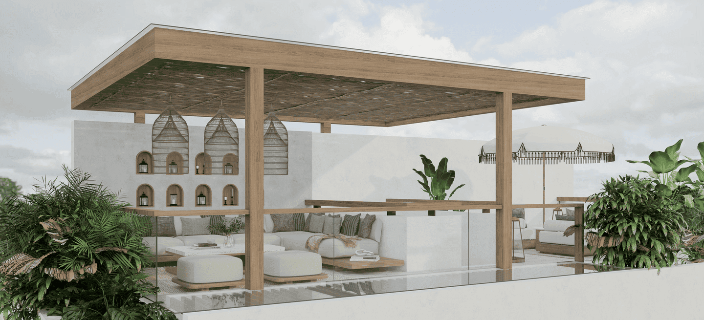 À l’extérieur, profitez d’une piscine privée entourée de verdure tropicale et de chaises longues confortables. La villa offre également un vaste rooftop équipé d’un canapé douillet et de bains de soleil, offrant un cadre idéal pour se détendre, bronzer ou admirer de magnifiques couchers de soleil en toute intimité.