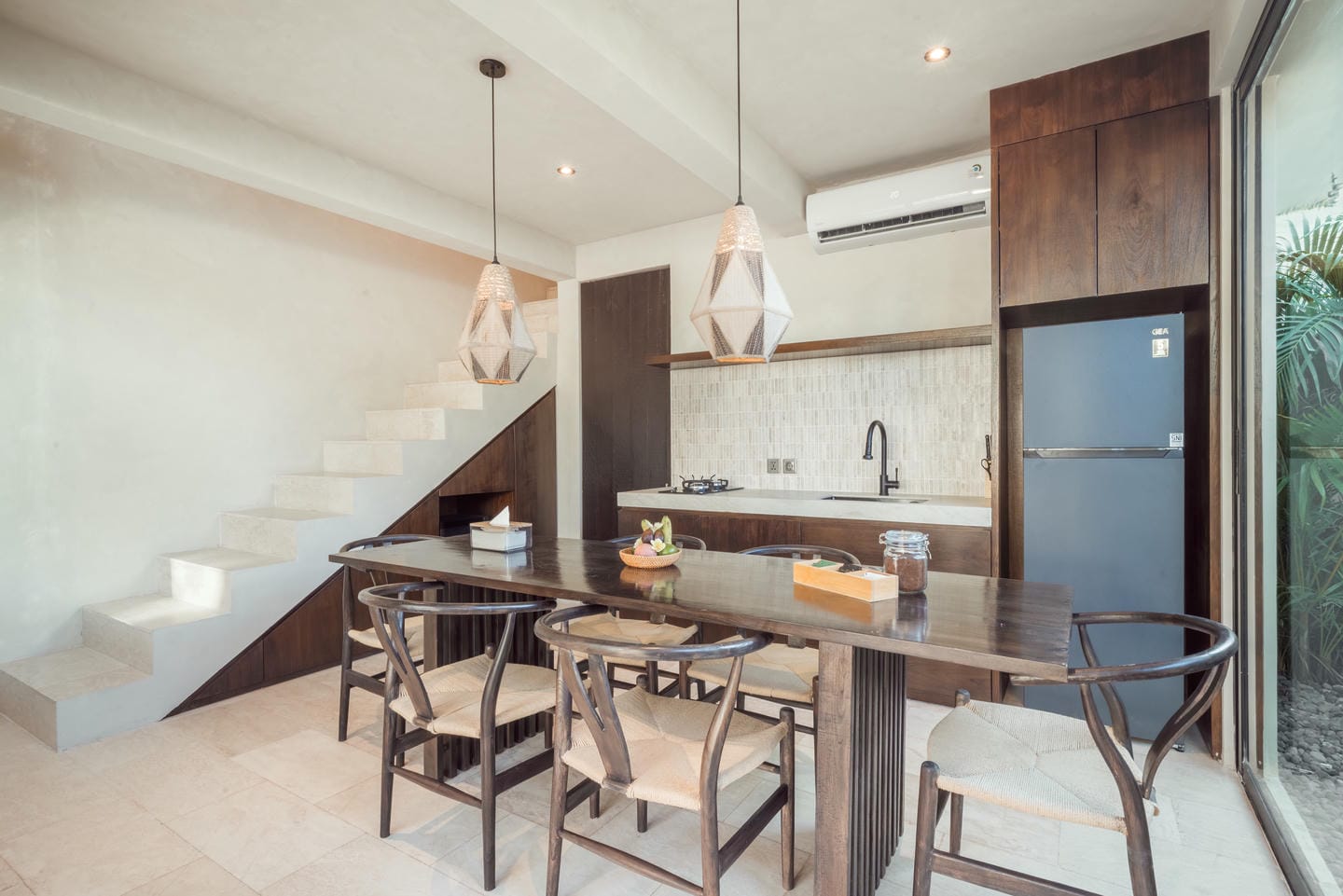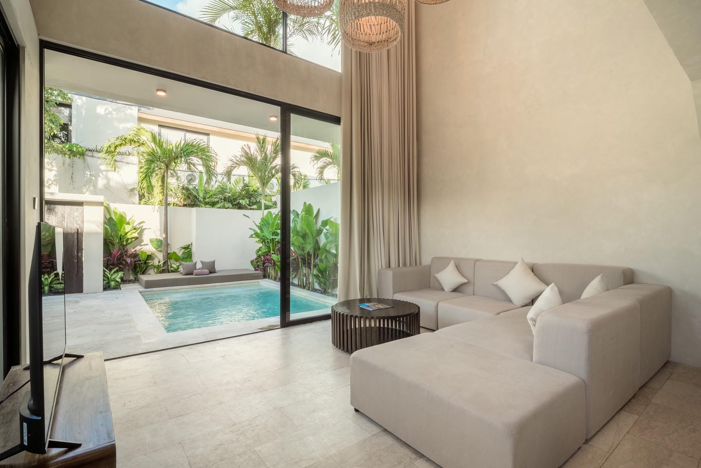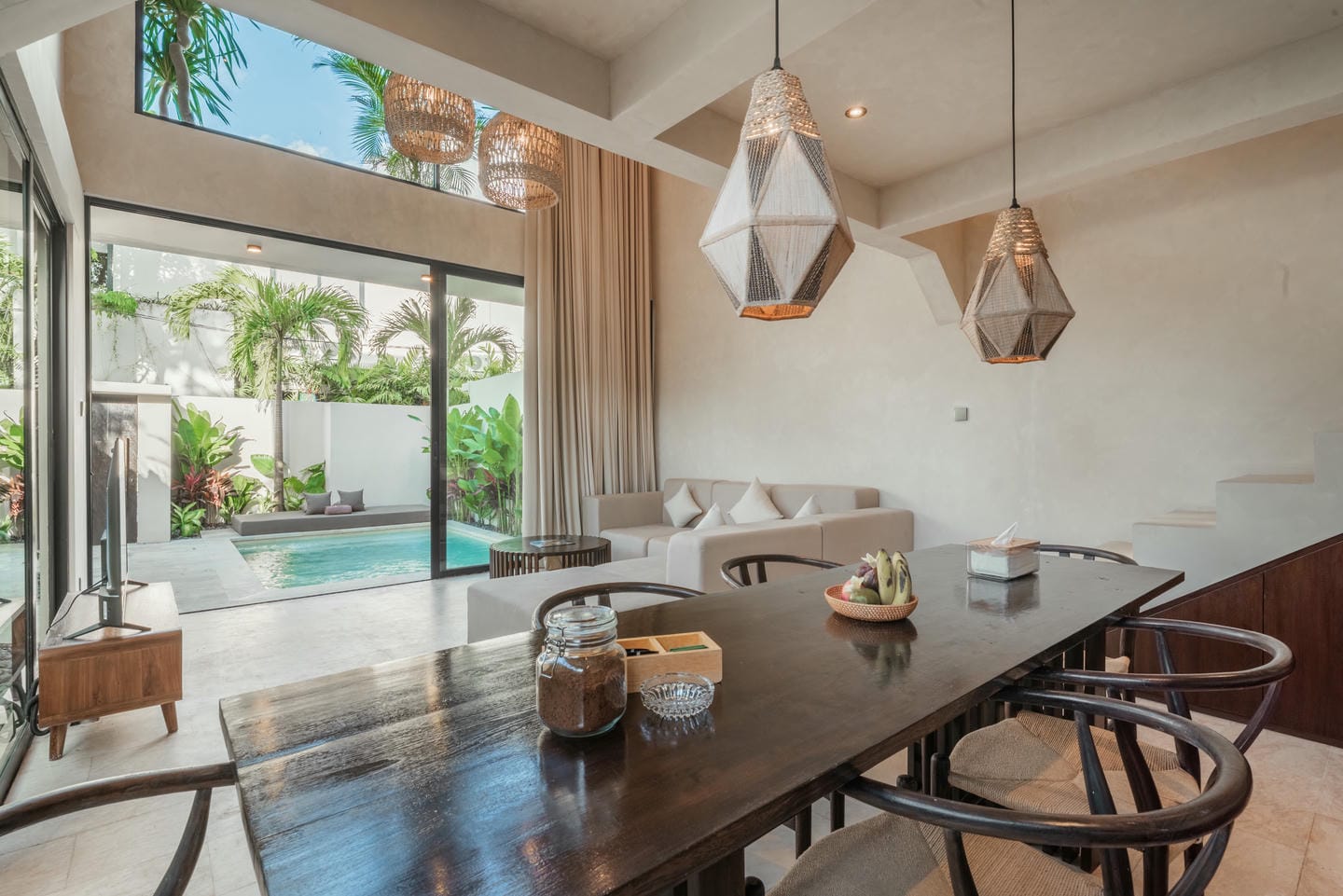 Conçue dans un style tropical contemporain, la villa allie des lignes architecturales épurées à des textures naturelles chaleureuses. Les hauts plafonds, les accents en bois et les grandes fenêtres laissent entrer une lumière abondante, créant une atmosphère lumineuse et aérée.
