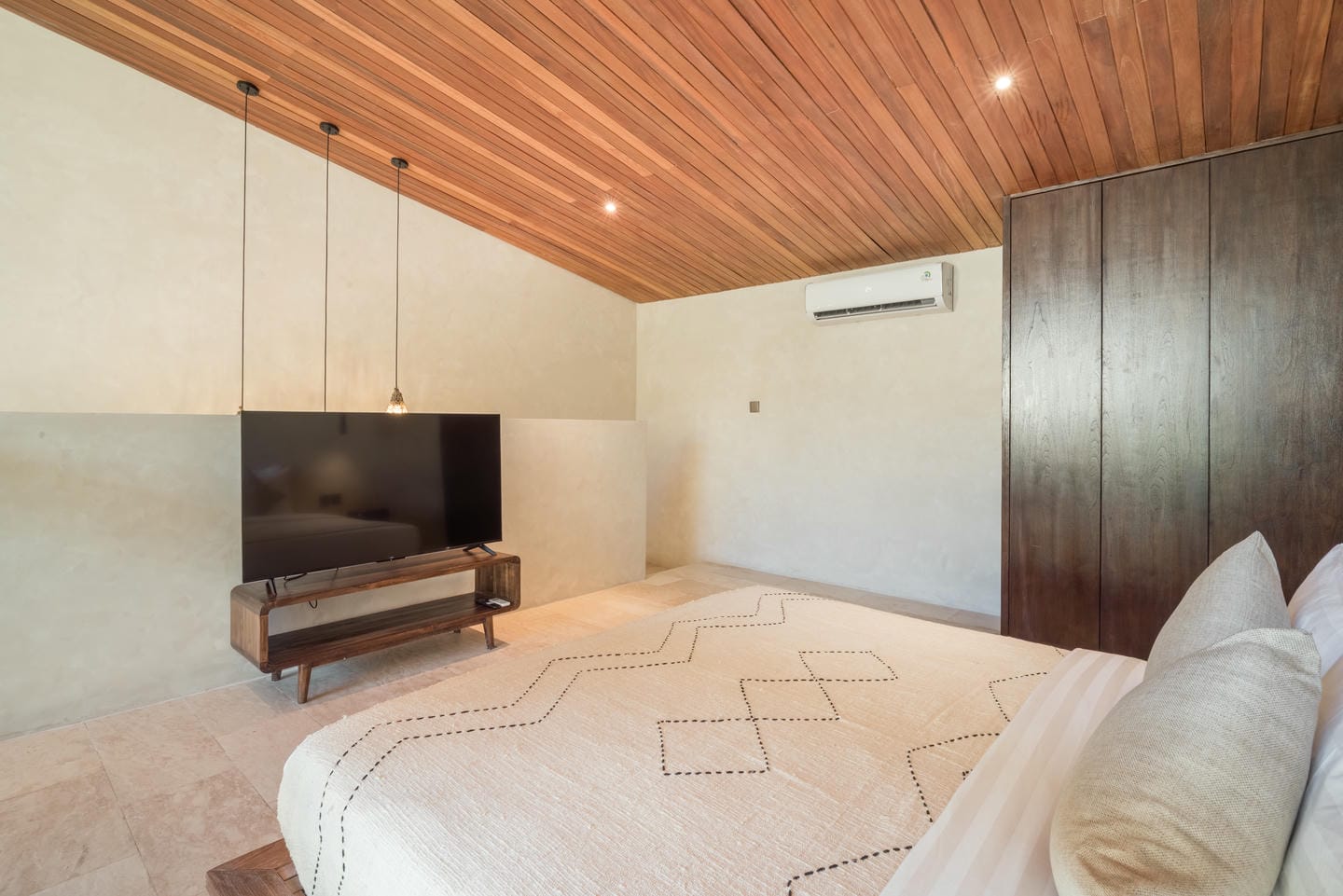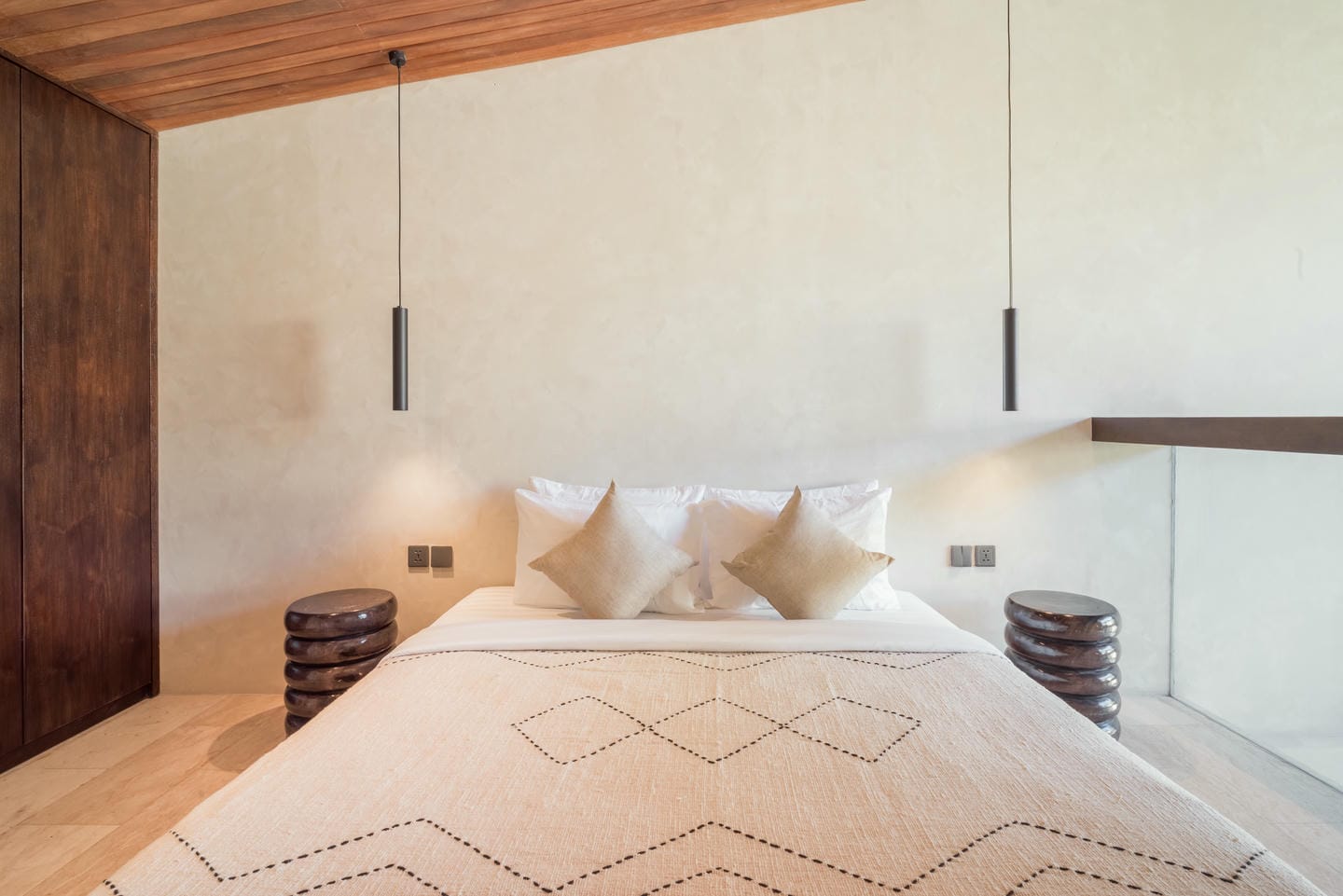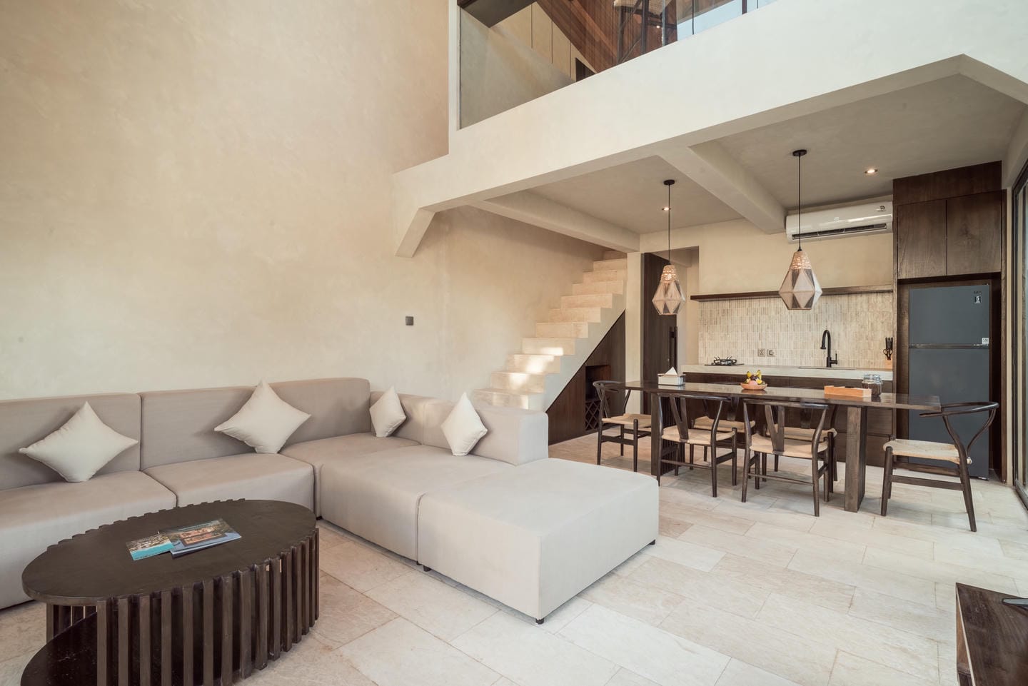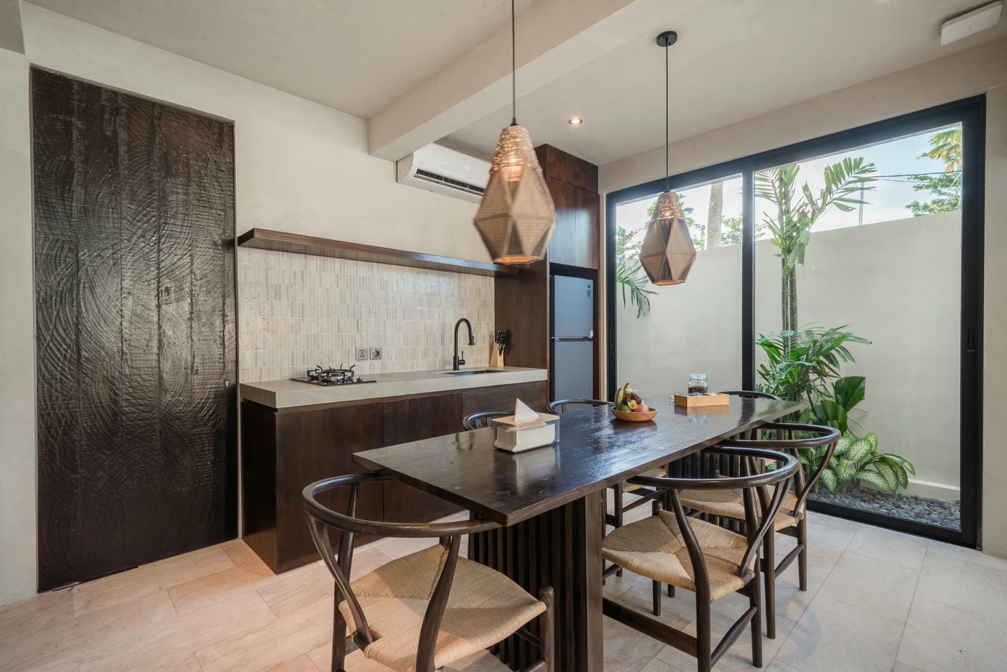 Conçue dans un style tropical contemporain, la villa allie des lignes architecturales épurées à des textures naturelles chaleureuses. Les hauts plafonds, les accents en bois et les grandes fenêtres laissent entrer une lumière abondante, créant une atmosphère lumineuse et aérée.