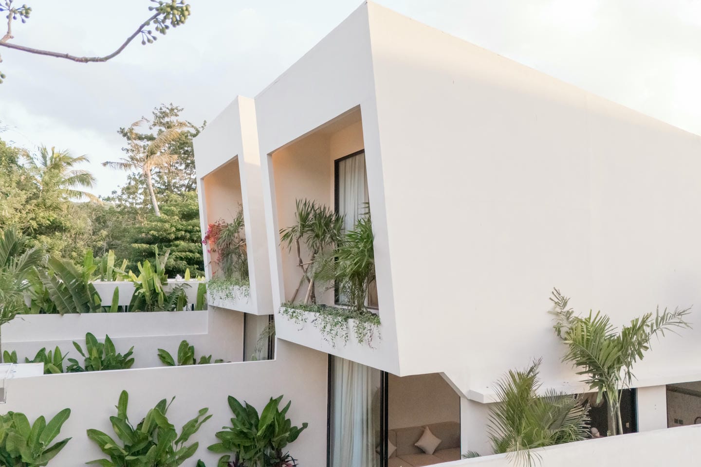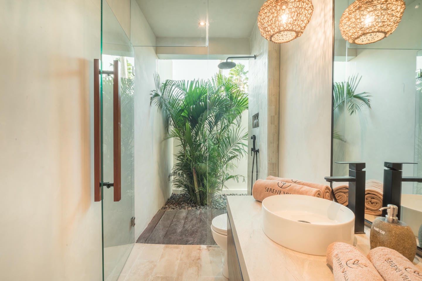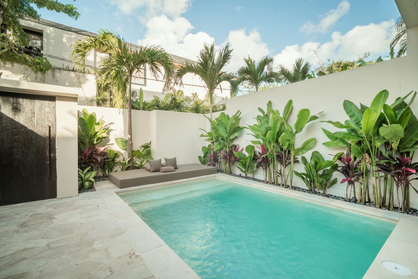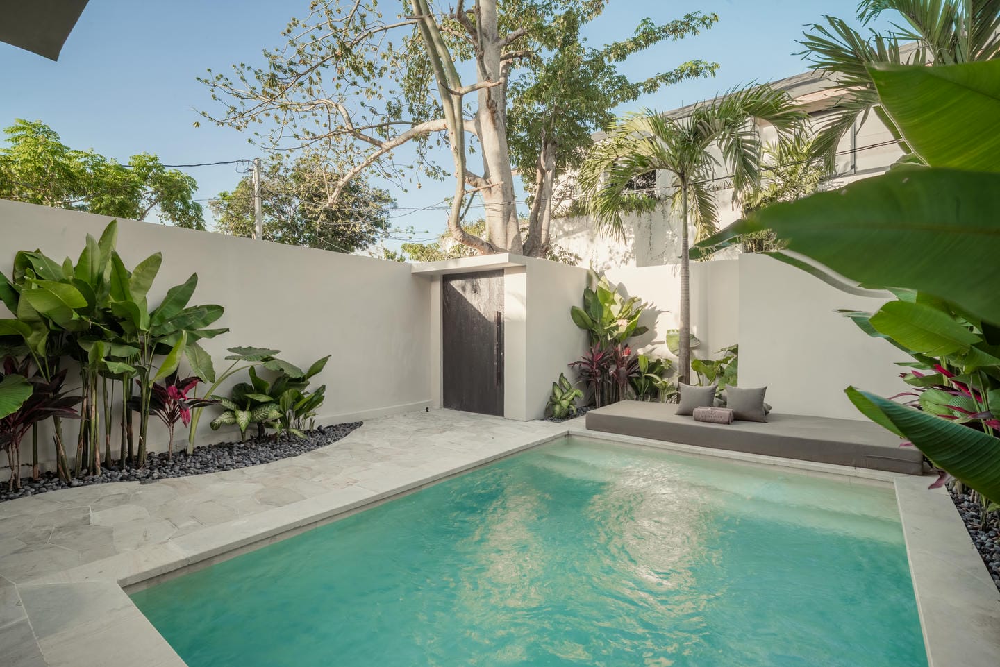 À l’extérieur, vous trouverez un espace piscine privé entouré d’une végétation tropicale luxuriante — parfait pour se détendre après une journée à la plage ou recevoir des invités.
