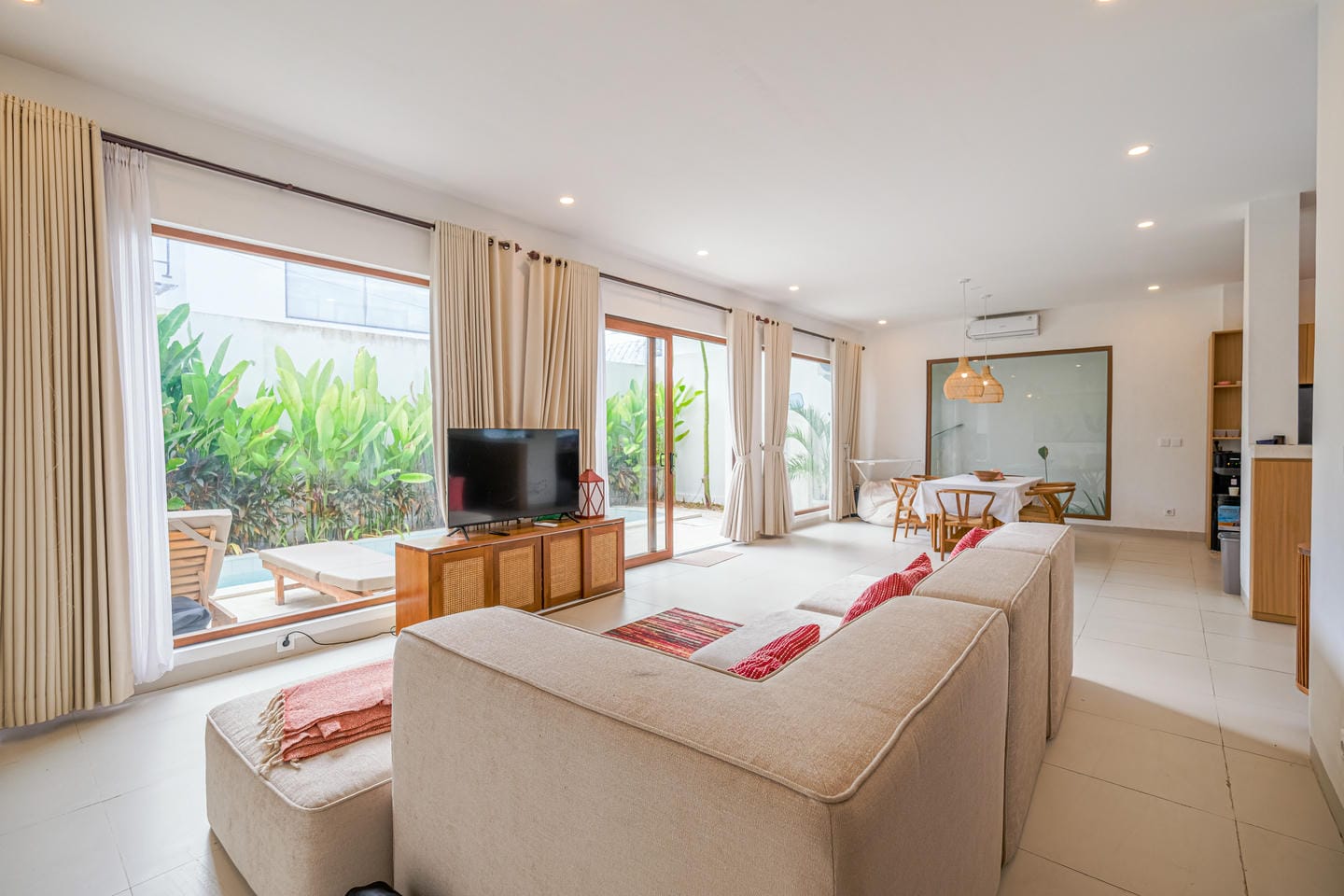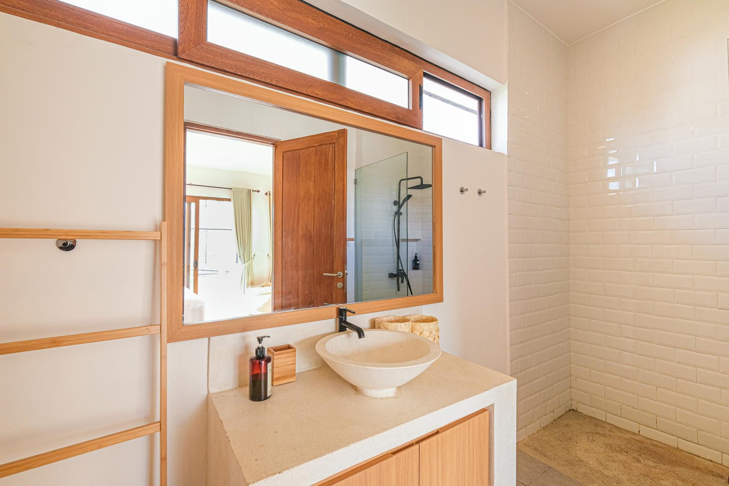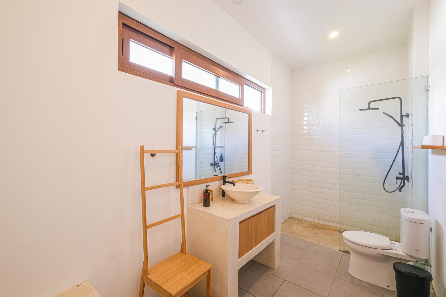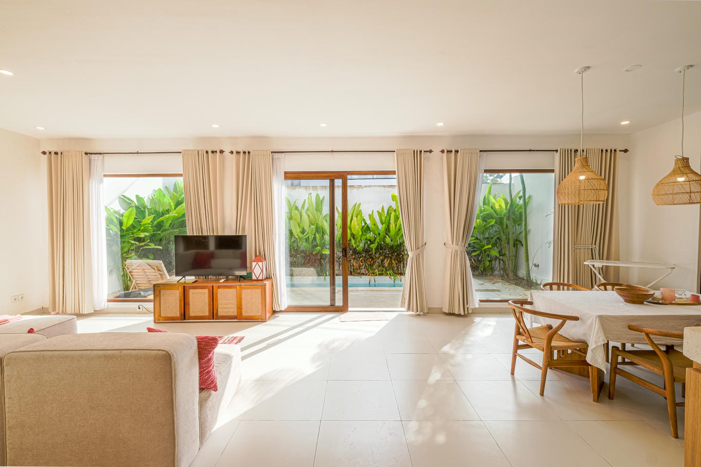 À l’extérieur, une piscine invitante bordée de carrelage et de verdure tropicale crée une ambiance parfaite pour la détente. Avec des transats confortables et une atmosphère sereine, c’est l’endroit idéal pour se ressourcer et savourer le rythme doux de Bali.