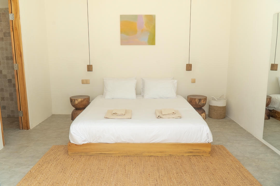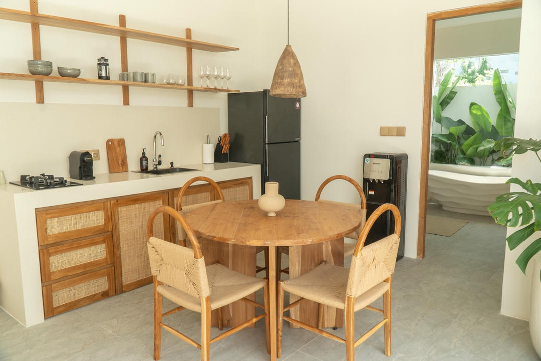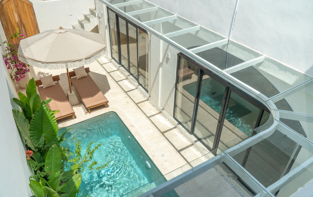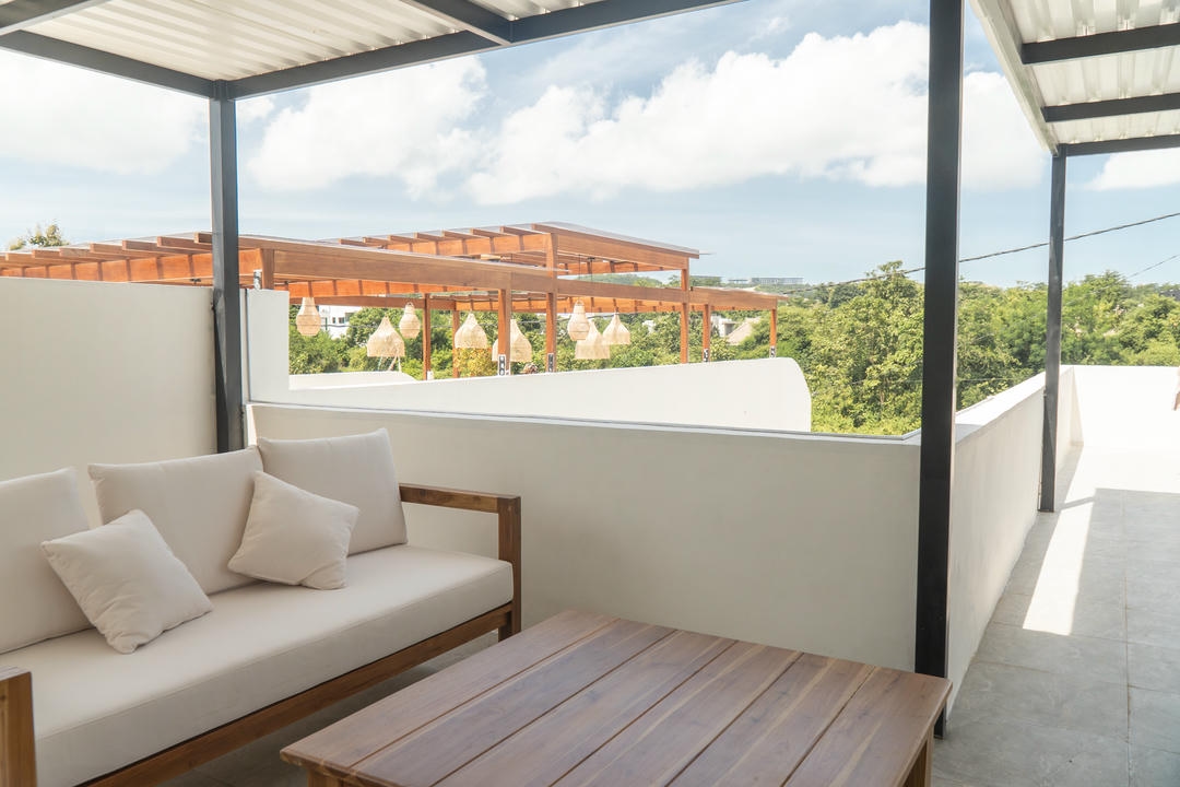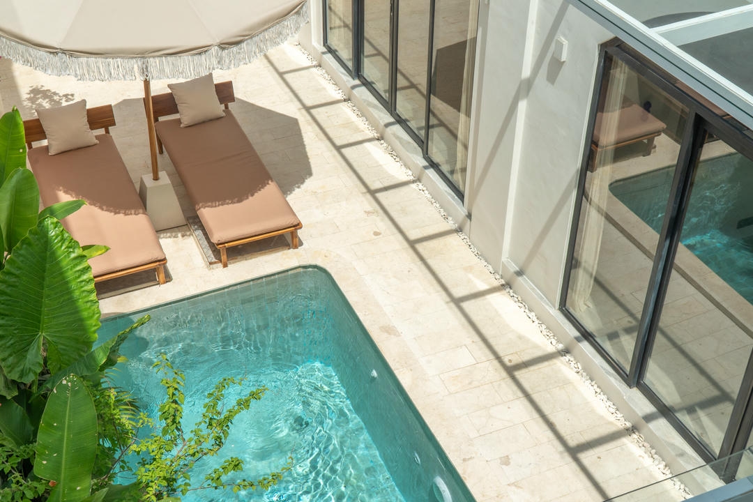 À l’extérieur, une piscine privée avec transats invite à la détente après une journée à la plage, tandis que le rooftop aménagé propose un espace idéal pour se relaxer, recevoir des invités ou admirer les magnifiques couchers de soleil de Bali en toute intimité.